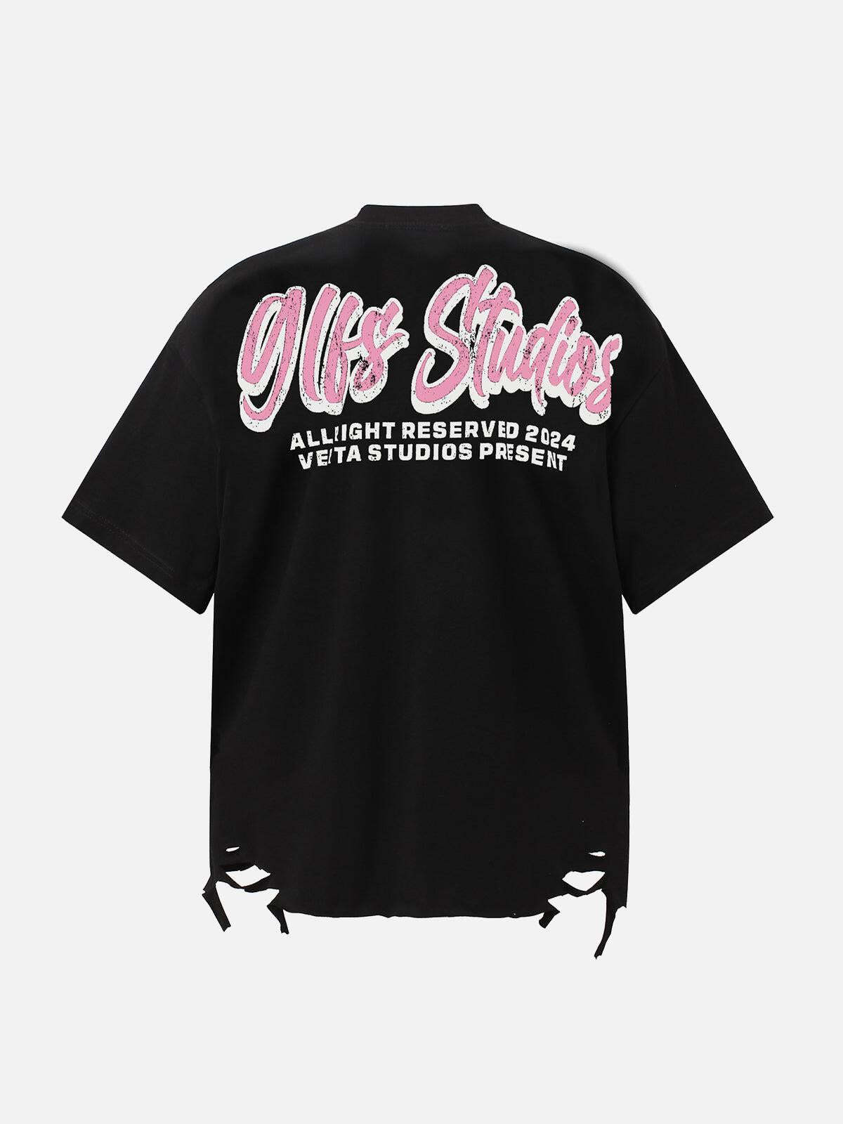 Embrace the chaotic energy of the city with this bold graphic tee, where vibrant pink and green lettering pops against a crisp white backdrop, turning heads with every step. The artful distressing at the hem adds an effortlessly edgy touch, making it perfect for those who dare to disrupt the ordinary. Available in versatile sizes M, L, and XL, this piece ensures a comfortable fit whether you’re hitting the streets in the black version or keeping it fresh in white. Pair it with ripped jeans and high-tops for ultimate summer fashion inspiration. Dare to redefine your summer style in this standout piece.