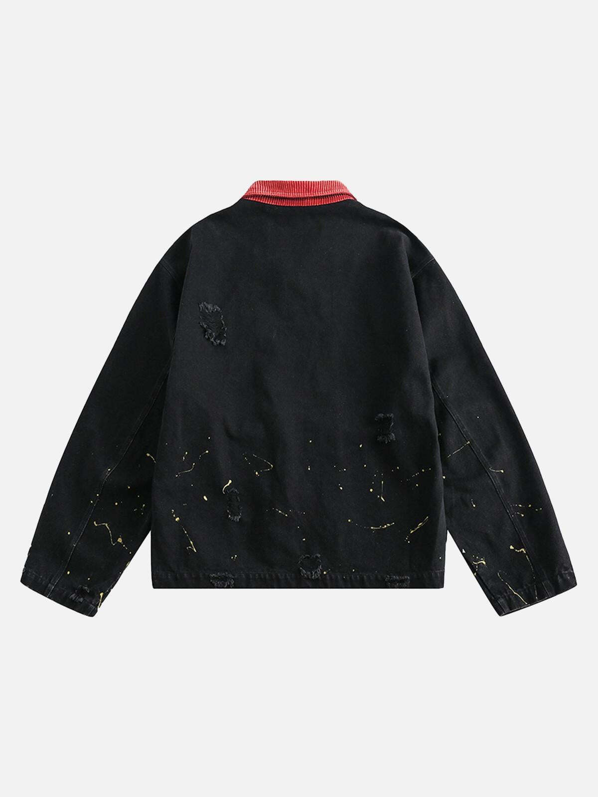 Step into the scene with a jacket that’s not just clothing, but a canvas of urban rebellion. The bold black backdrop is fiercely contrasted by a vibrant red collar and striking graffiti-inspired text, making it a centerpiece for any streetwear fashion ensemble. Distressed details and splashes of paint create an unapologetic vibe that screams individuality. Available in versatile sizes from M to 2XL, this jacket offers a relaxed fit that pairs perfectly with both your everyday essentials and daring y2k outfits. Ready to transform your outfit ideas into reality? This piece is your go-to.