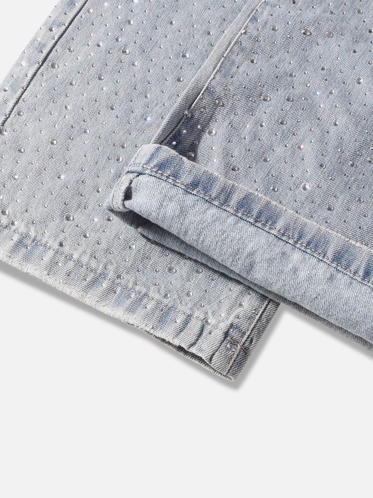 Dripping in street-savvy flair, these jeans redefine casual cool with their icy blue hue and glimmering embellishments that catch the light from every angle. The relaxed, one-size fit ensures comfort and effortless style, while the drawstring detail adds an urban edge to your y2k outfit game. Pair them with a crisp white tee and chunky sneakers for an outfit that’s as bold as you are. Grab yours and set the tone for your next streetwear fashion look.
