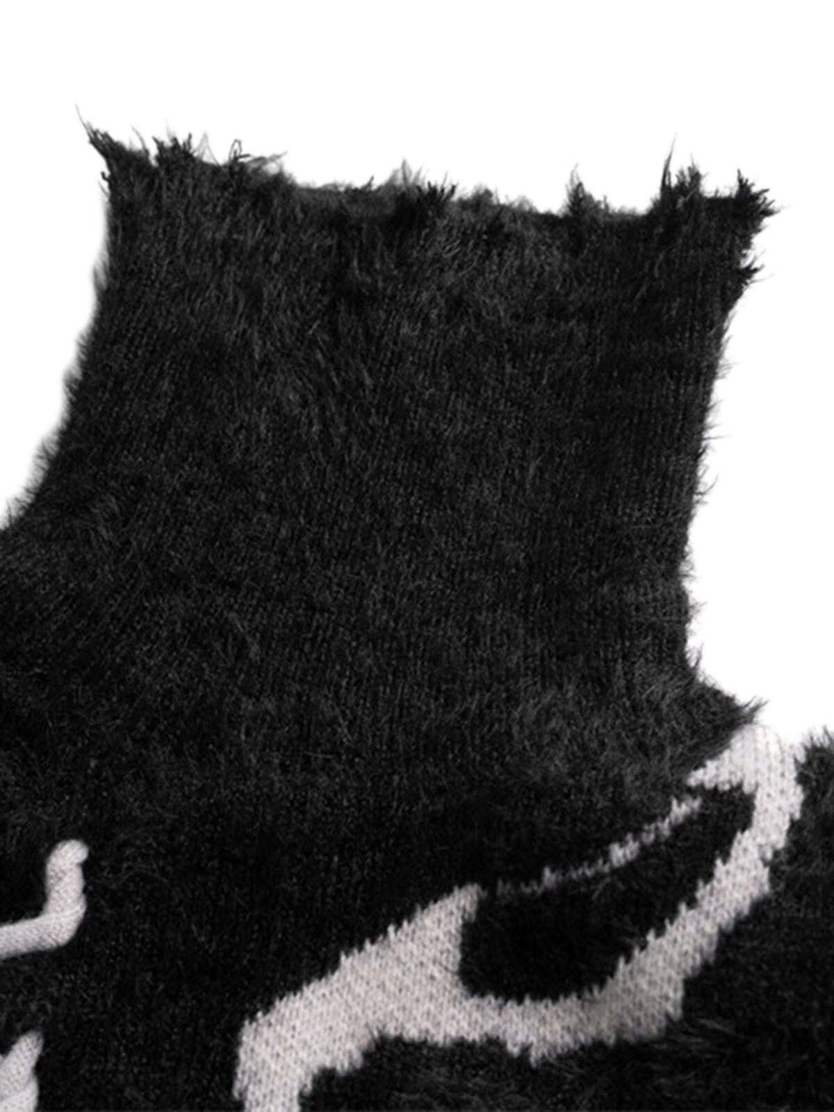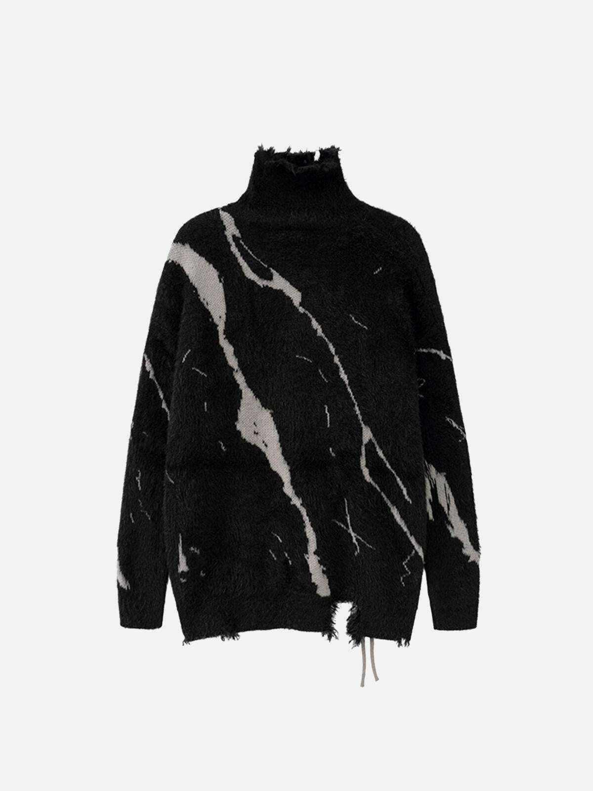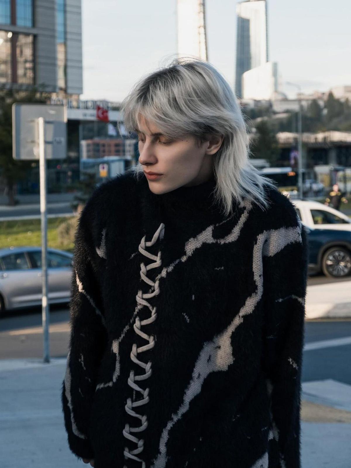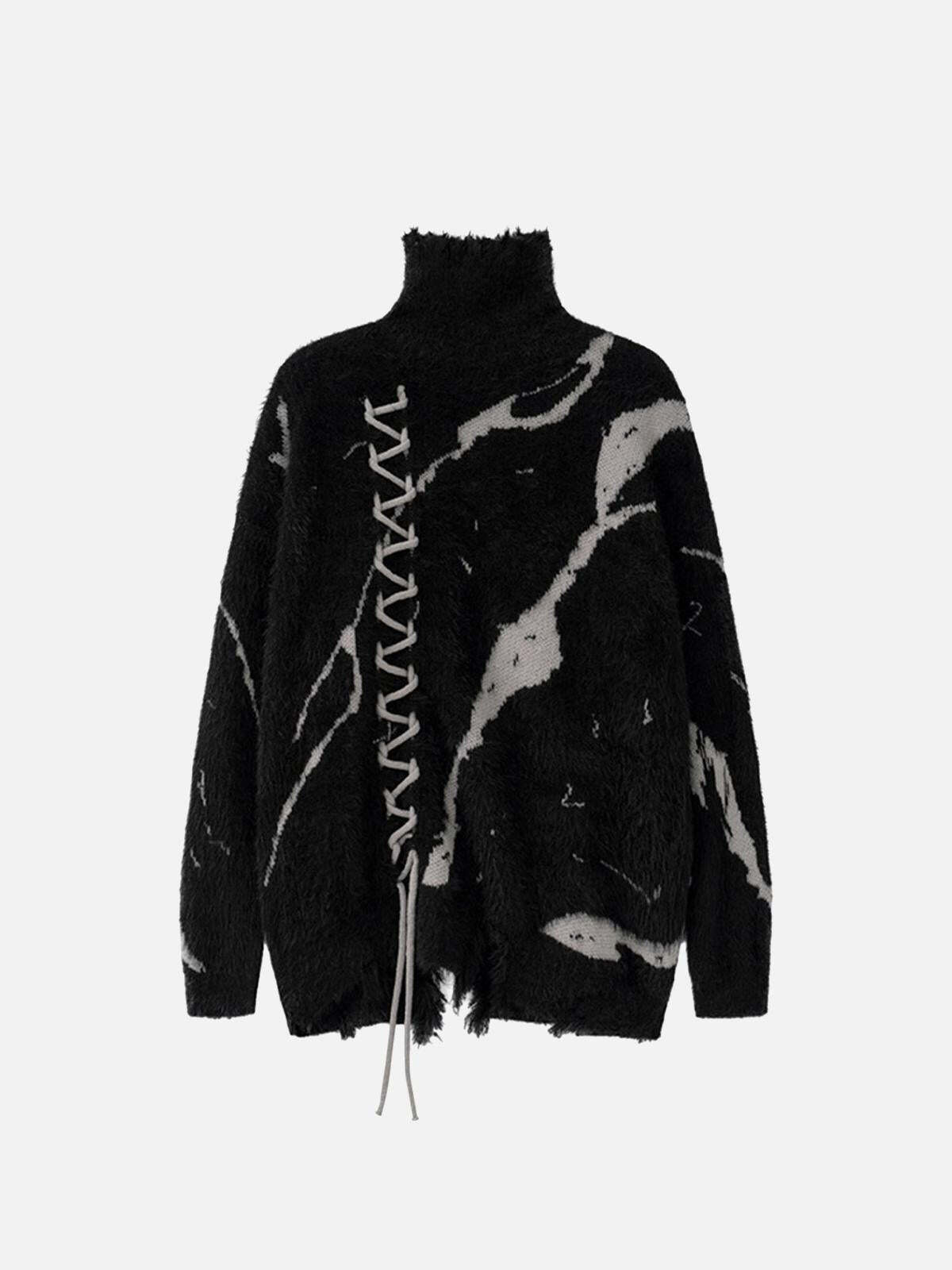 Unleash your inner maverick with this fierce sweater, where edgy design meets bold comfort. The monochrome palette of deep black with striking white swirls weaves an untamed narrative, while the daring lace-up detail commands urban attention. Ideal for those cool nights out, the plush texture envelops you in warmth and style. Available in sizes M, L, XL, and 2XL, this piece ensures a fit as audacious as your attitude. Pair it with distressed jeans or sleek joggers for instant outfit inspo that resonates with the pulse of streetwear fashion. Let your look speak volumes.