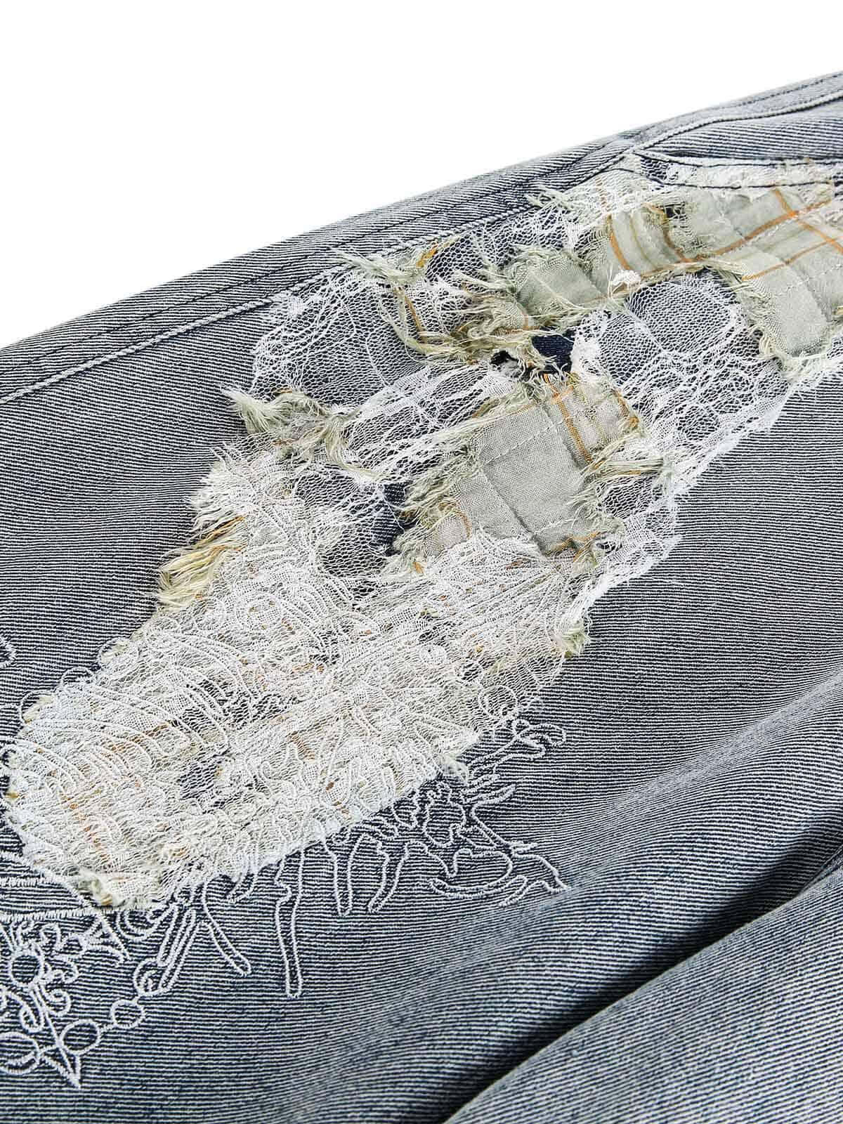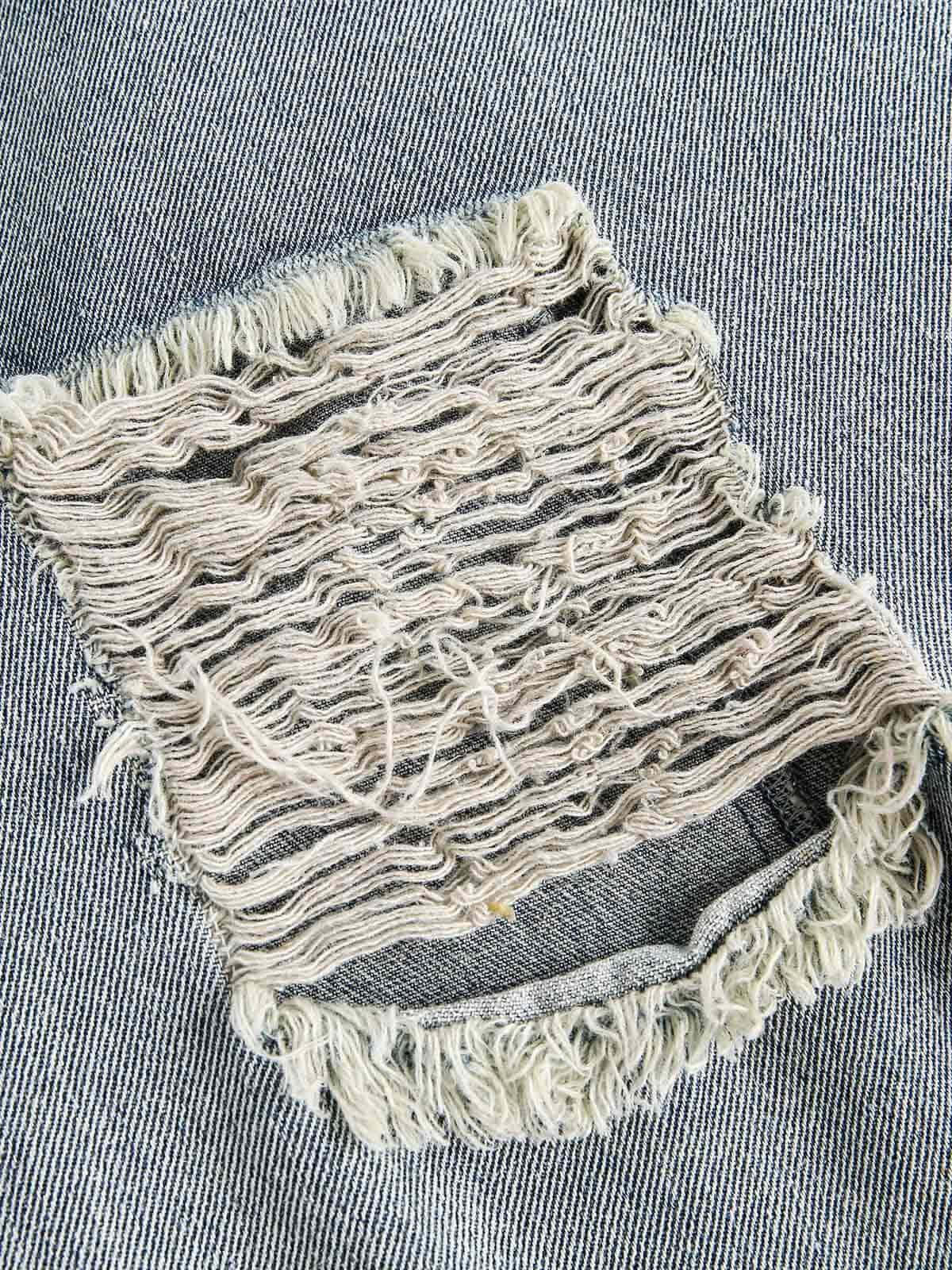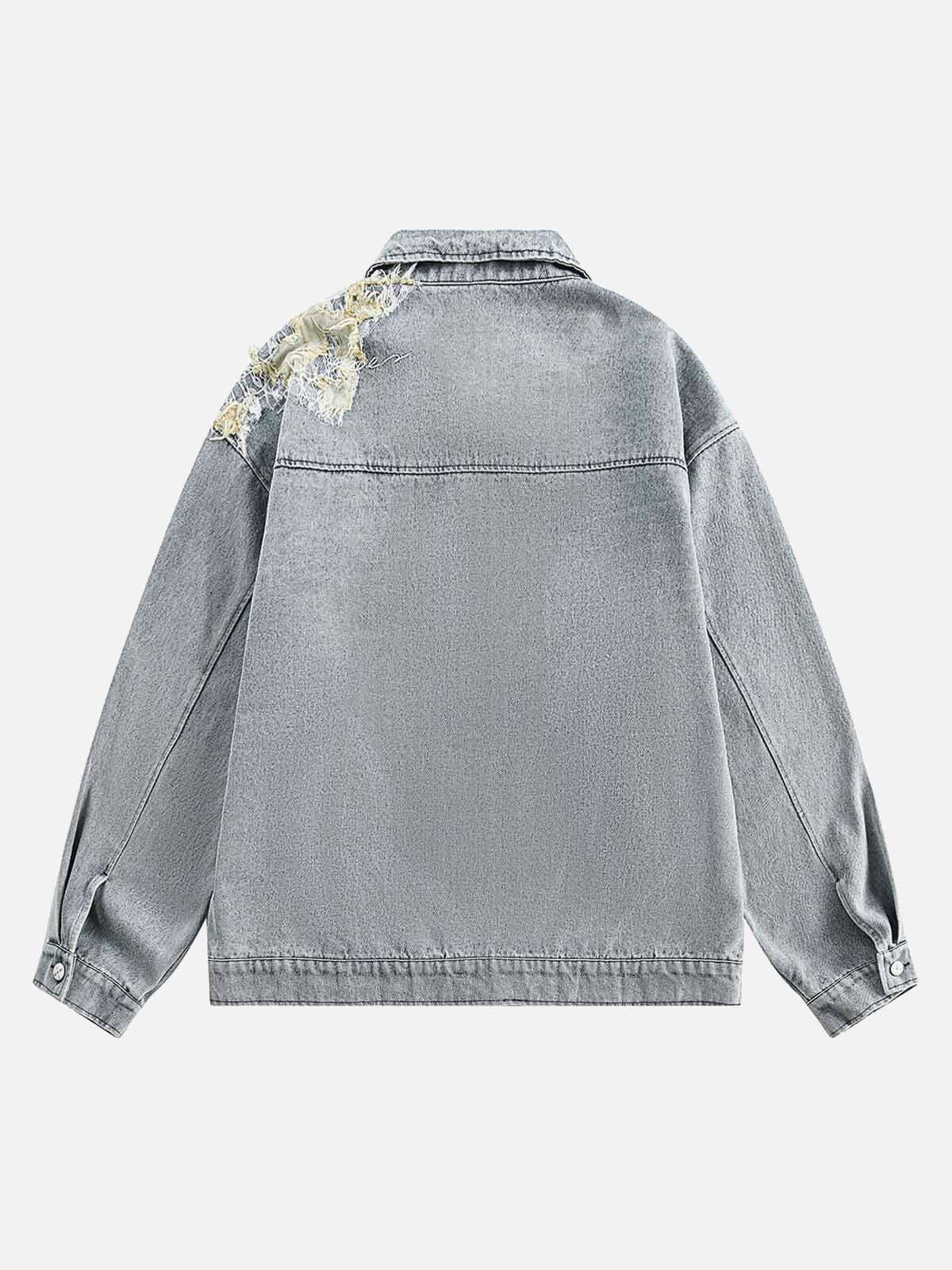 Transform your streetwear game with this edgy, light blue jacket, where distressed textures meet a splash of rebellious spirit. The uniquely frayed patches and intricate detailing create a look that’s unapologetically bold, perfect for those who dare to stand out. Its relaxed fit ensures comfort while offering enough room for layering, available in sizes M through 2XL. Pair it with your go-to sneakers for instant Y2K outfit inspo. Embrace the urban vibe and redefine your style now.