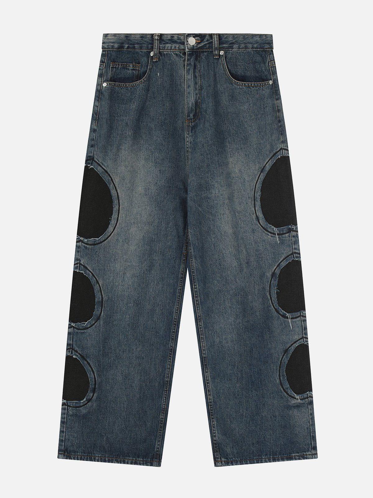 Dare to redefine the streets with these oversized denim pants, where bold circular cutouts meet a classic blue wash for a distinctive, edgy vibe. The relaxed fit offers comfort and confidence, perfect for pairing with your favorite kicks and an oversized tee for ultimate y2k outfits. Available in sizes 28 through 34, you’ll find the perfect fit to express your individuality. Slide into these jeans and let your streetwear fashion speak volumes.