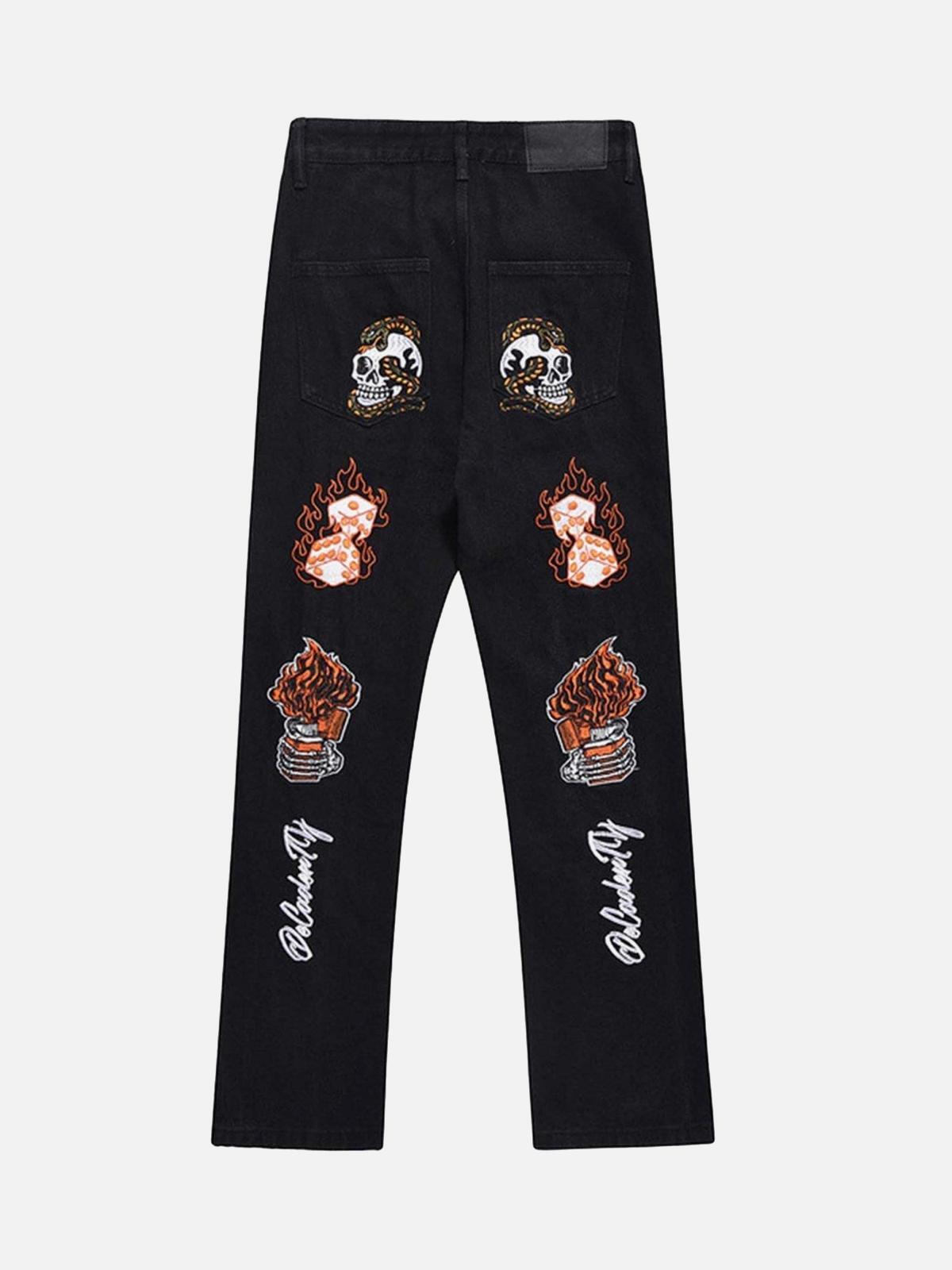 Redefine your streetwear game with these audacious jeans featuring intricate skull and flame graphics that scream individuality. Crafted in a versatile light wash, they deliver a rebellious edge to any ensemble, making them perfect for those who dare to stand out. Available in both Blue and Black, and sizes ranging from S to 2XL, these jeans offer a comfortable fit that’s as bold as your personality. Pair them with a graphic tee for a y2k vibe, or a sleek jacket for a modern twist. Dare to be different and let your style speak volumes.