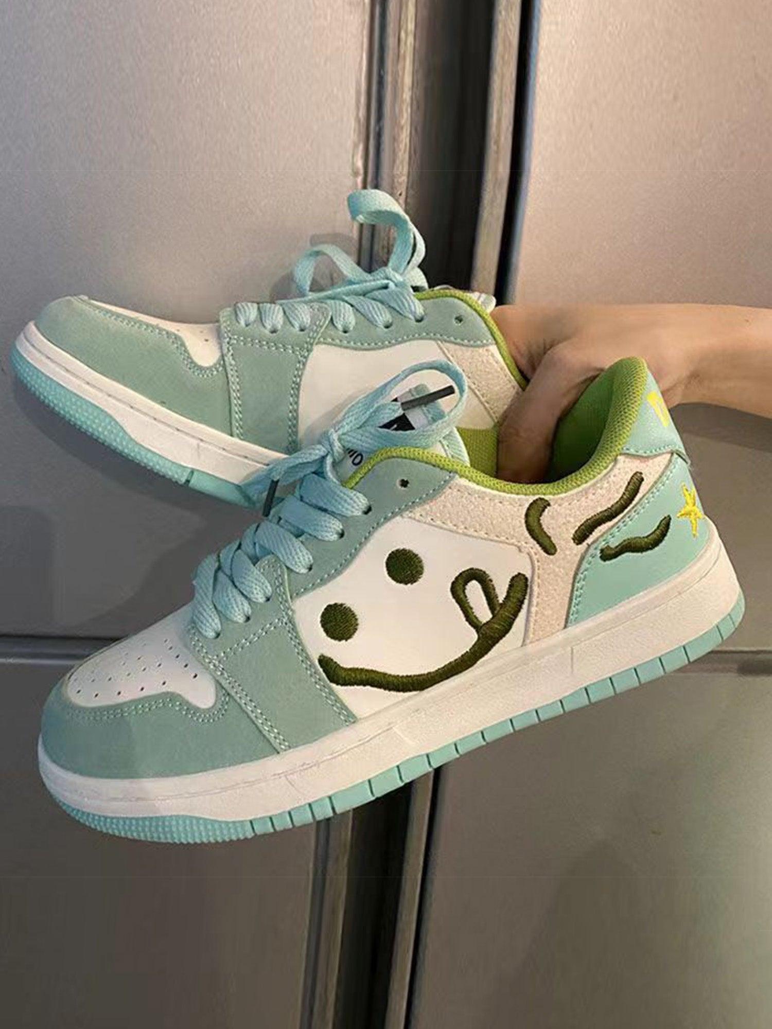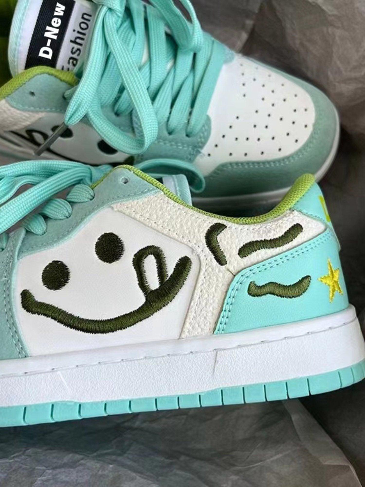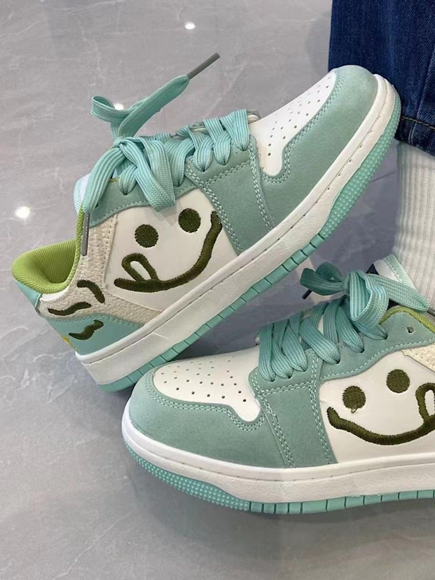 Embrace the playful spirit of urban style with these sneakers, where vibrant green accents meet a cool, pastel palette. The unique smiley face design on the side adds a touch of fun, while the high-quality leather and suede textures ensure both comfort and durability. These kicks are available in sizes 36 through 44, making them a versatile choice for any streetwear enthusiast. Pair them with your favorite baggy jeans or a sleek tracksuit for endless outfit ideas that capture the essence of y2k fashion. Ready to turn heads? Lace up and hit the streets with confidence.