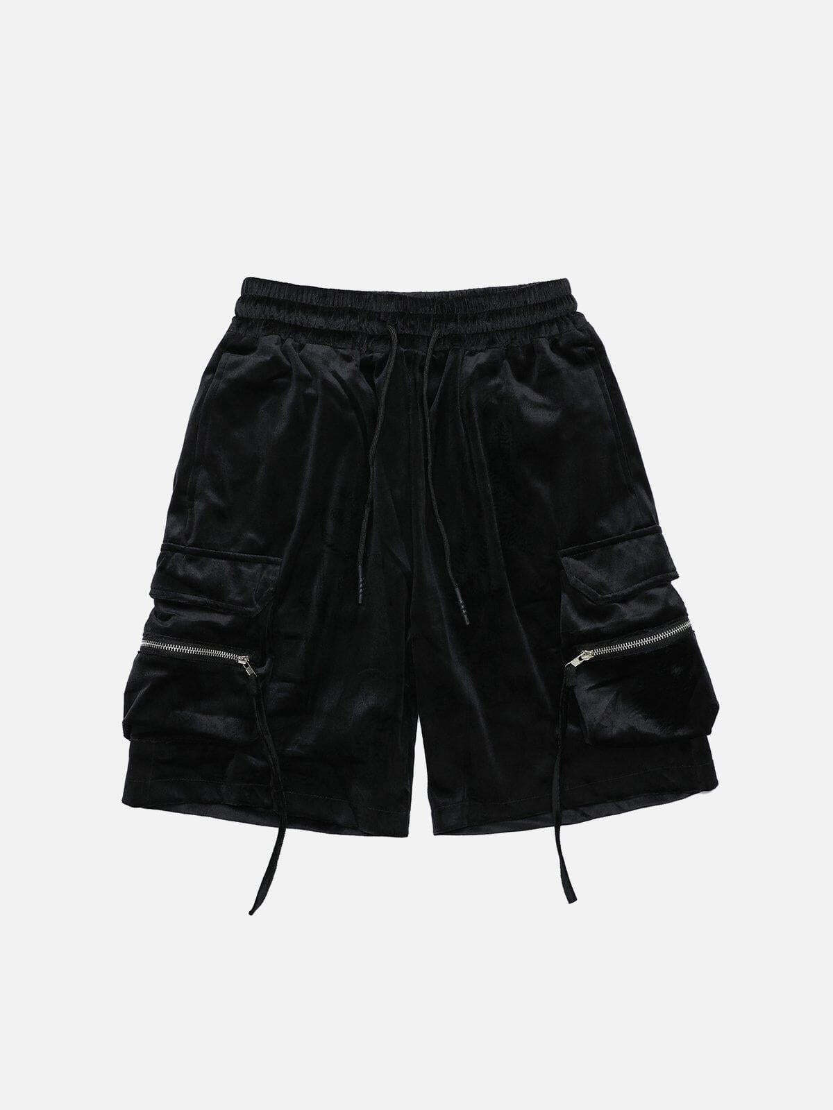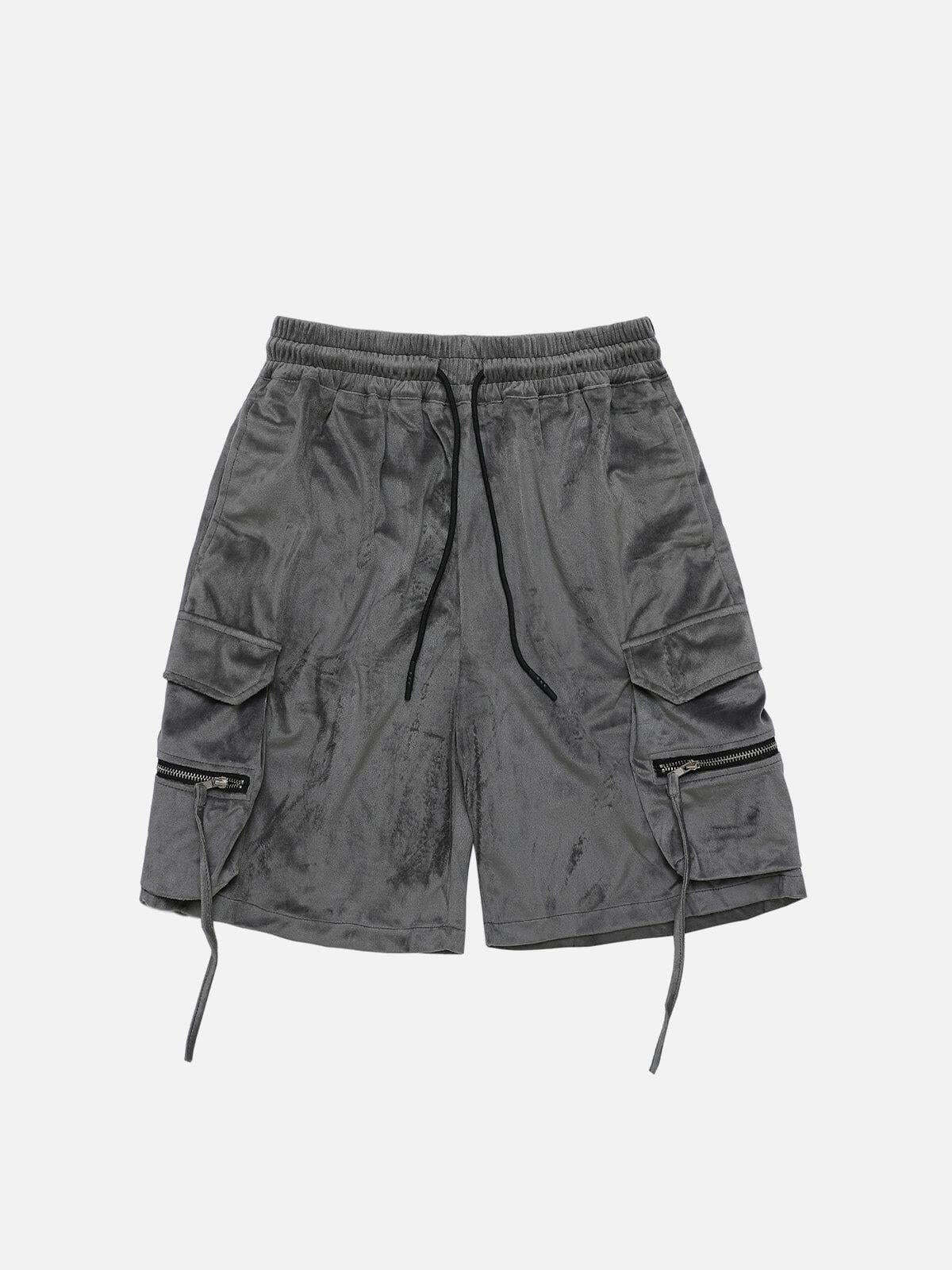 Embrace the gritty allure of urban life with these sleek shorts, where a stormy gray hue meets a rugged design. The smooth, velvety texture contrasts with bold zipper details and oversized cargo pockets, giving you an edge in any summer style setting. Designed as a versatile one-size fit, these shorts offer both comfort and attitude, making them the perfect choice for those who refuse to blend into the background. Pair them with a graphic tee and high-tops for an effortlessly cool summer outfit. Get ready to own the streets.
