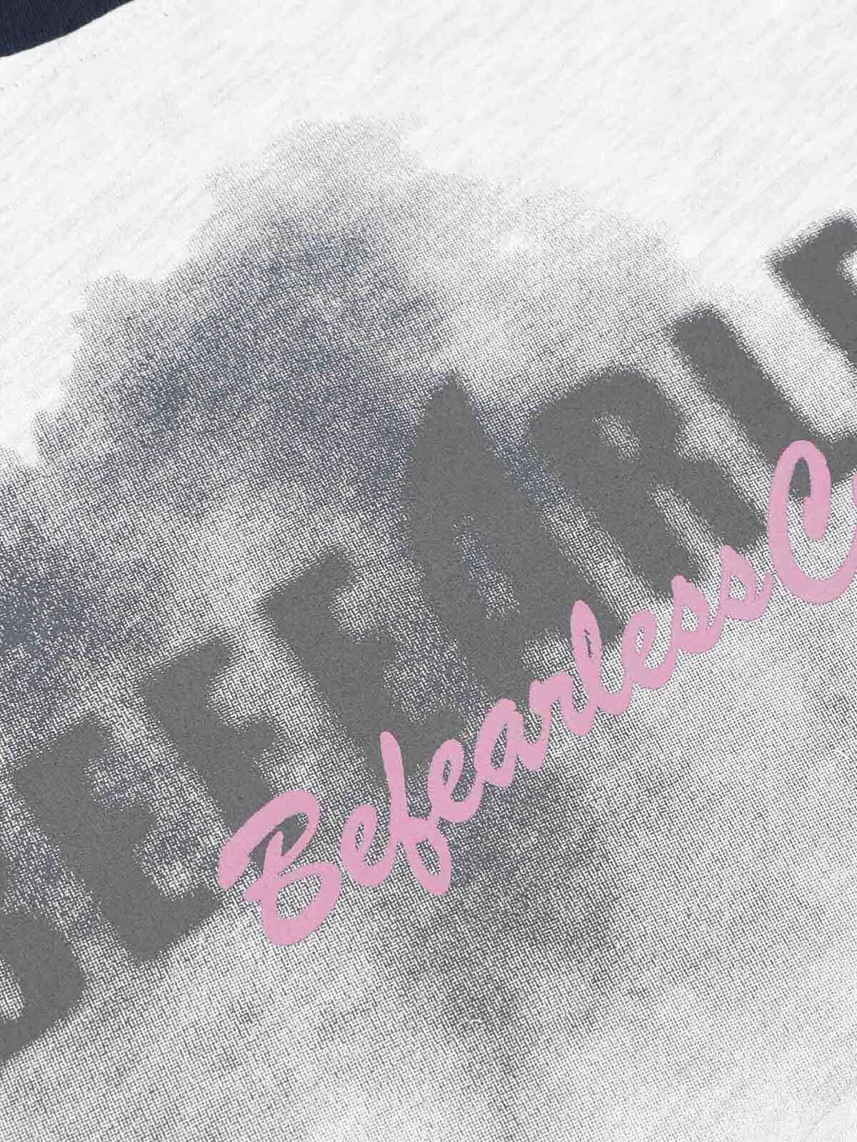 Embrace the fearless vibe with this striking piece that boldly blends urban edge with artistic flair. The textured gray wash against the crisp white canvas creates a dynamic backdrop for the bold typography that screams confidence. With contrasting blue sleeves adding a pop of color, this design is perfect for crafting your ultimate summer style. Available in sizes S to XL, it offers a relaxed fit that’s as comfortable as it is stylish. Pair it with your favorite sneakers for a look that’s effortlessly cool. Ready to redefine your summer wardrobe?