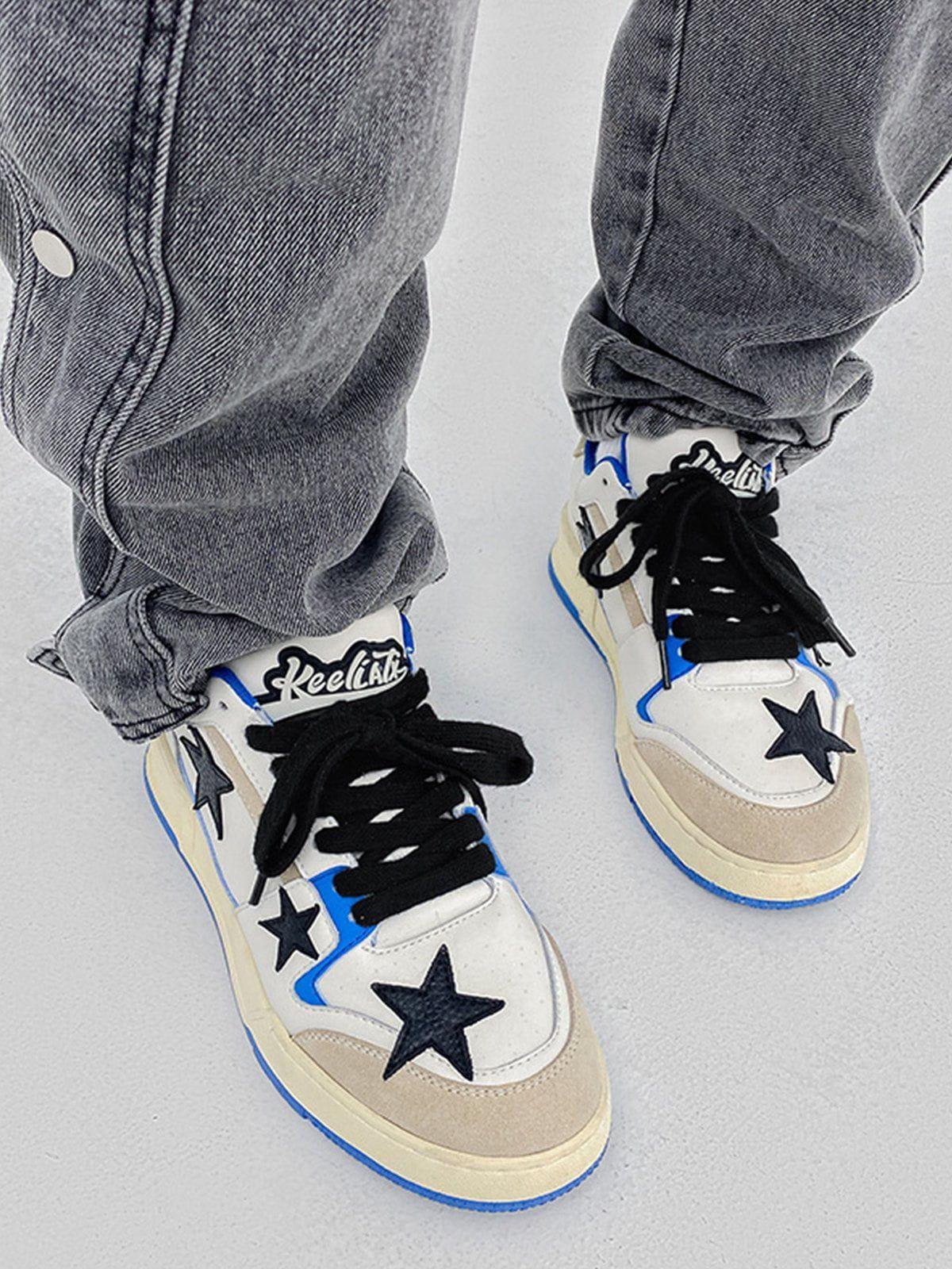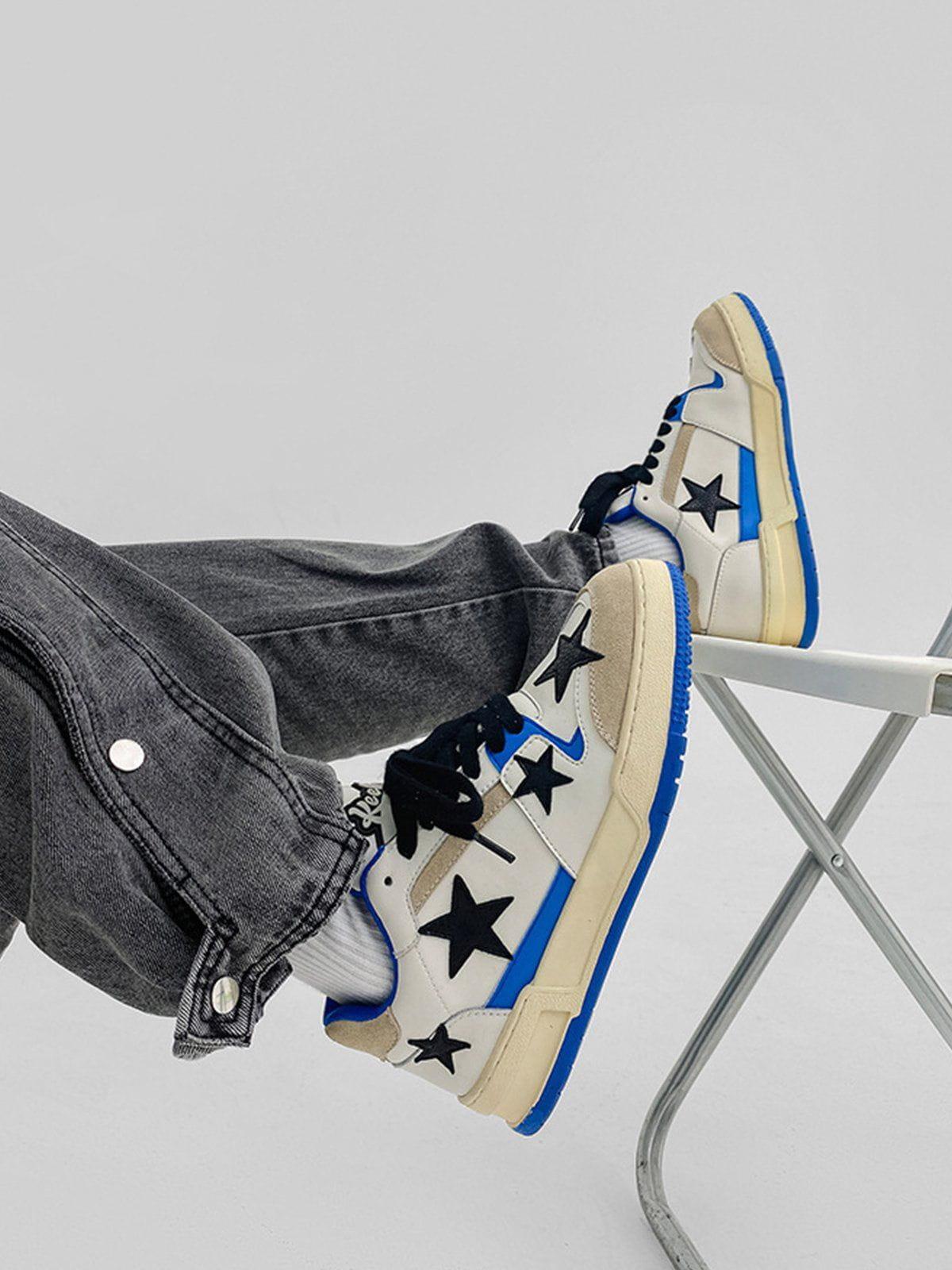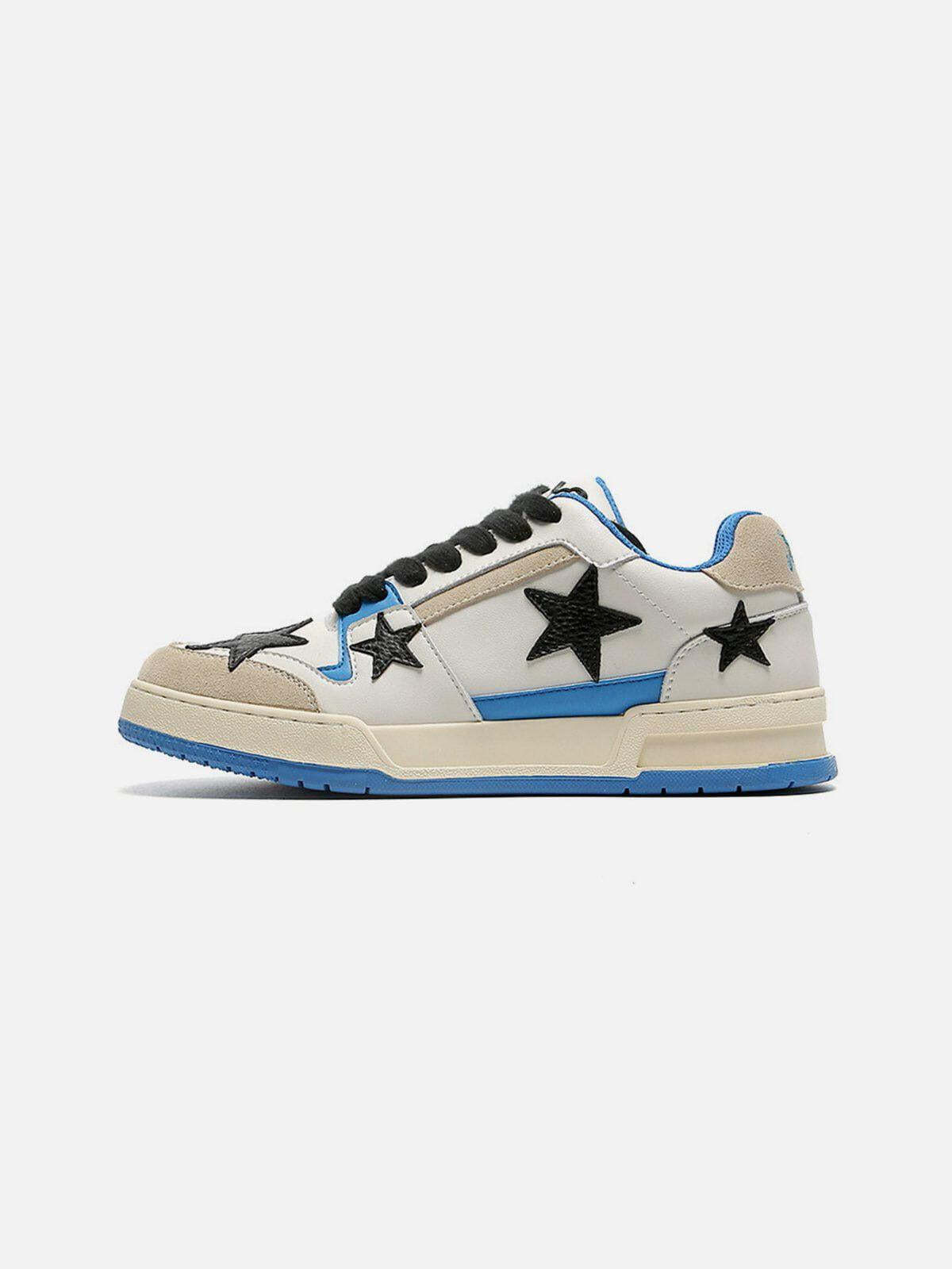 Step into the realm of bold streetwear fashion with these standout sneakers, where every detail from the striking black star accents to the sleek blue trim screams individuality. The beige base contrasts with the vivid elements, creating a dynamic look that adds a spark to your Y2K outfit inspo. Engineered for those who embrace both comfort and flair, these sneakers offer a plush fit across sizes 38 through 44, ensuring everyone can find their perfect stride. Pair them with your favorite urban ensemble for an effortlessly cool vibe that turns heads. Ready to redefine your sneaker game?