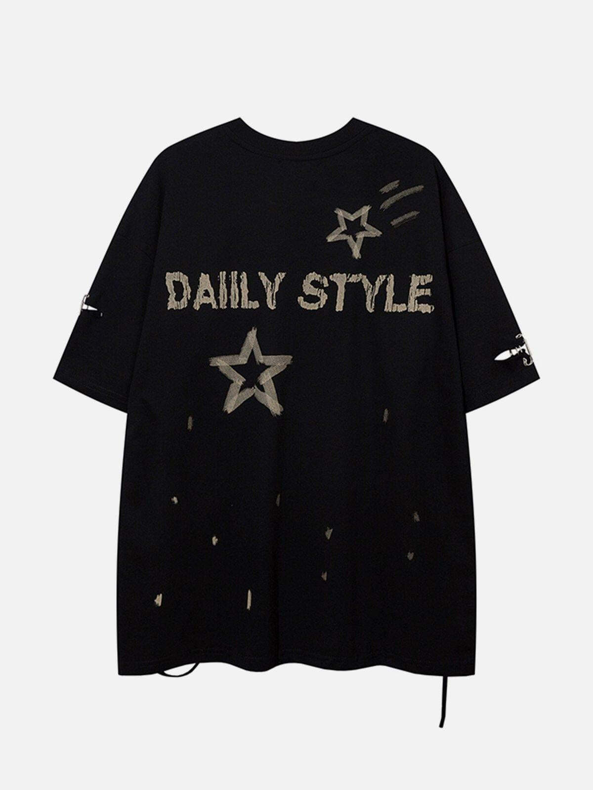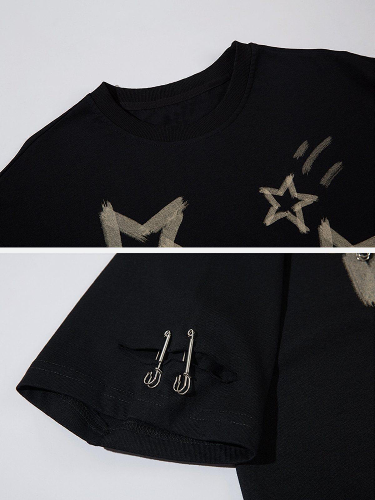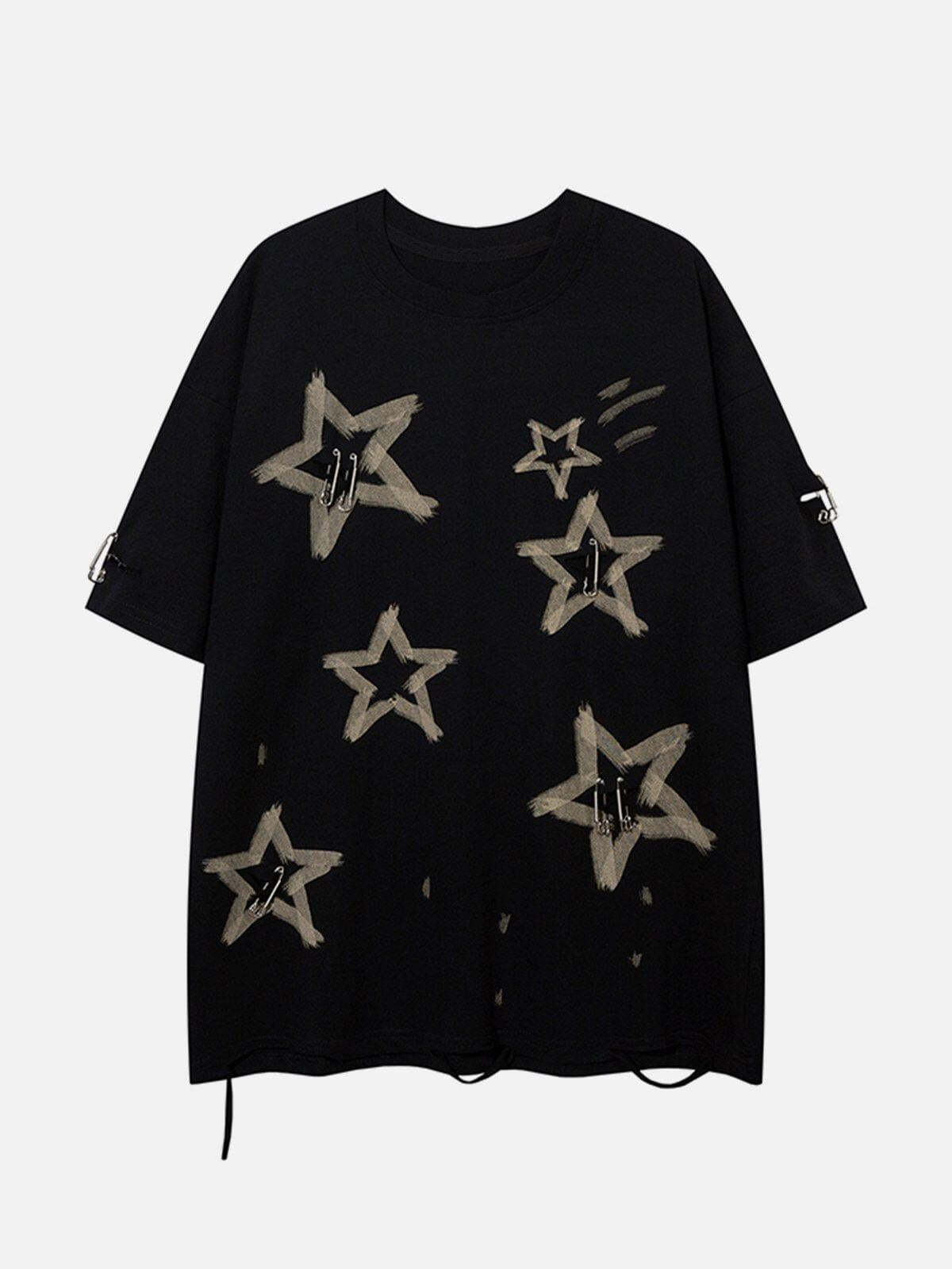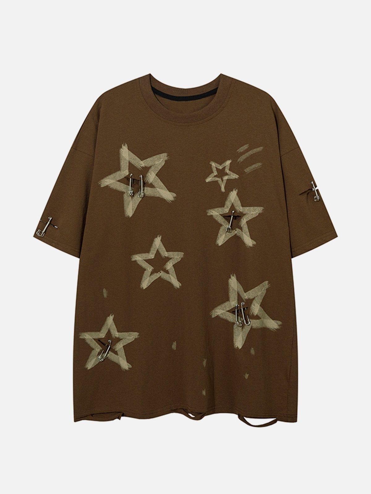 Unleash your inner rebel with this striking tee, featuring bold star graphics in a raw, hand-brushed style that screams urban edge. The dark tones of black, coffee, and gray create a versatile palette perfect for any summer style, while the relaxed fit ensures comfort in sizes from S to XL. Distinctive safety pin details add a layer of gritty charm, making this piece a standout in any summer outfit. Pair it with your favorite distressed jeans or layer it under a sleek jacket for a look that commands attention. Ready to redefine your wardrobe?