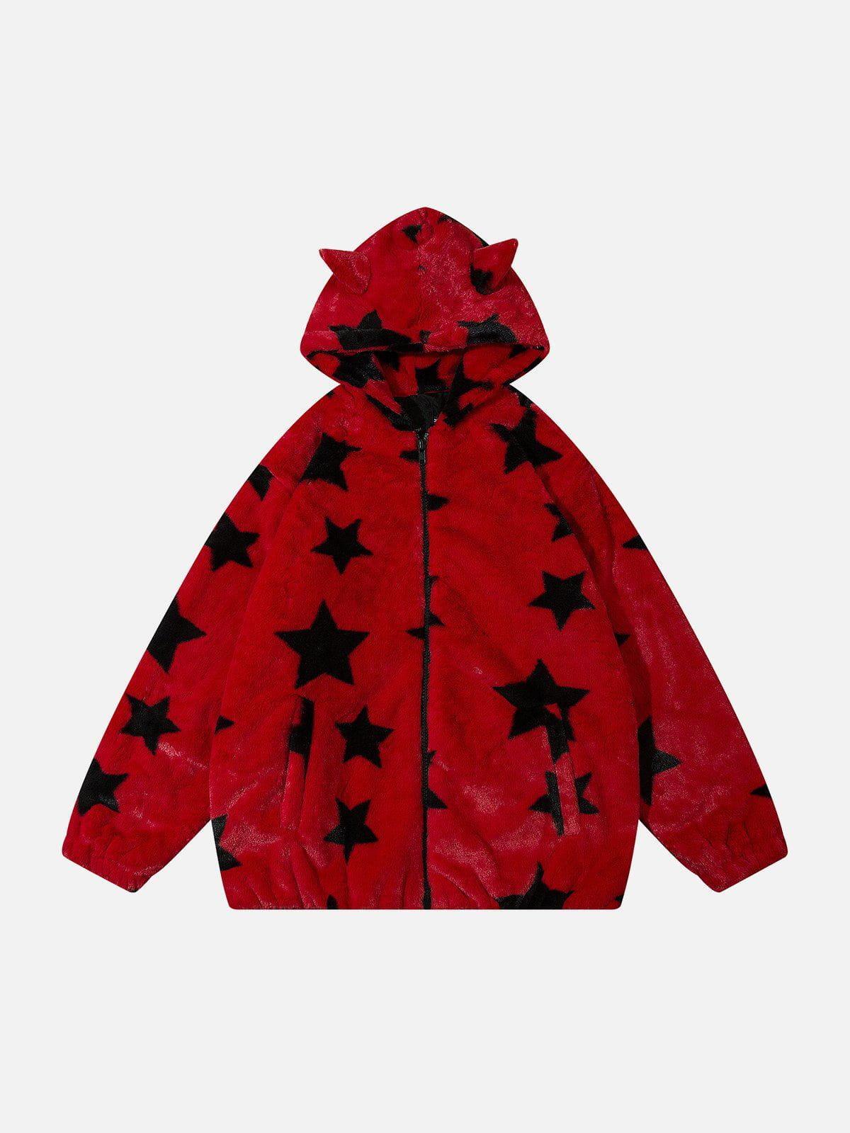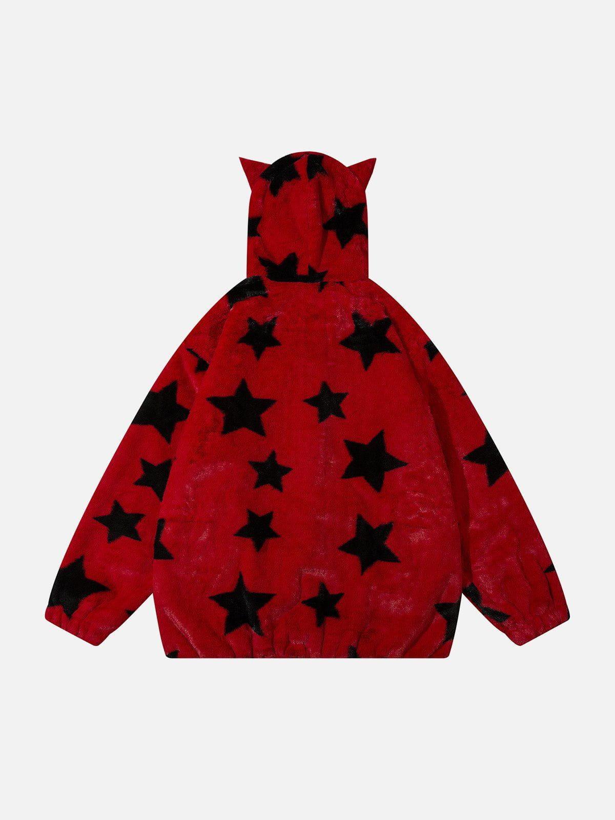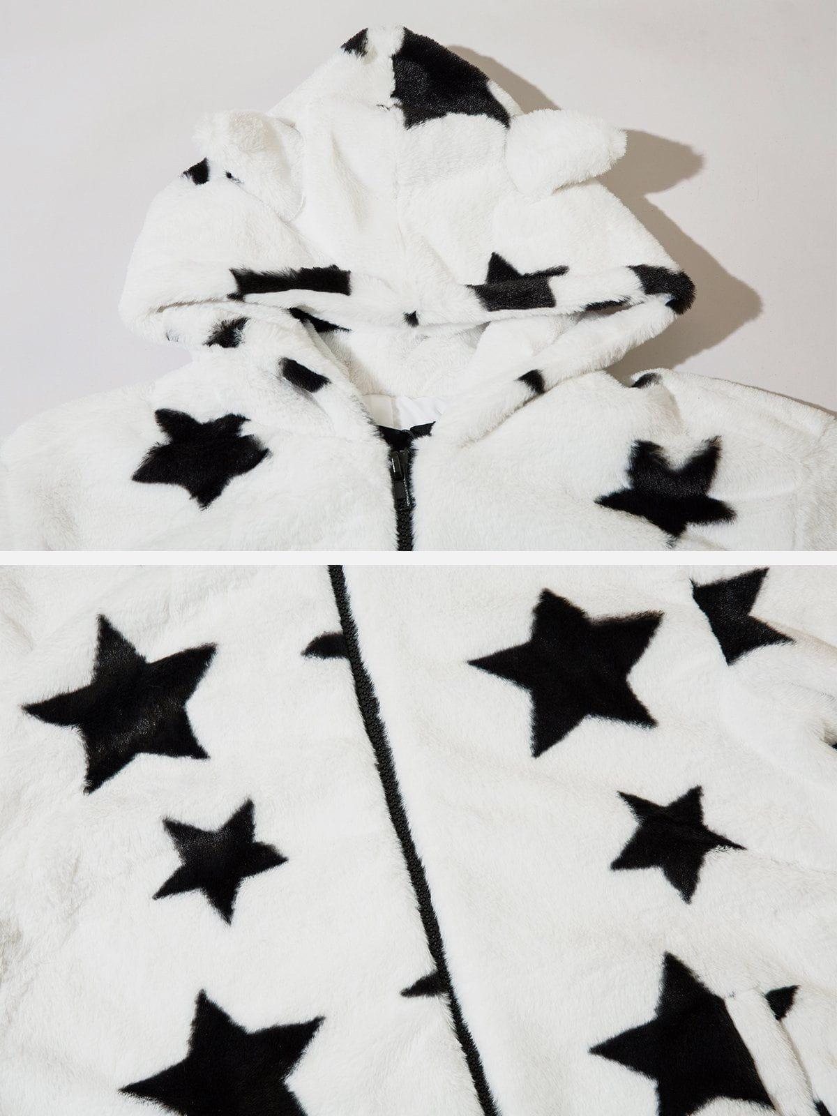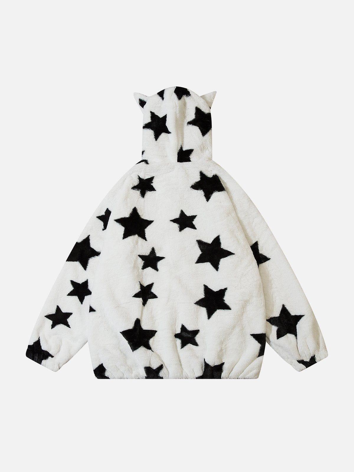 Break the mold in style with this bold, star-studded hoodie that redefines streetwear fashion. Crafted from plush fabric, this piece features an eye-catching black star pattern set against a crisp white backdrop, ensuring you stand out in any crowd. The playful hood with ear details adds a touch of whimsy, while the relaxed fit keeps you comfortable and confident. Available in a range of sizes from S to 2XL, it’s perfect for layering over your favorite Y2K-inspired outfits. Whether you’re hitting the streets or chilling with friends, this hoodie is your go-to for effortless cool. Grab yours and redefine your outfit game.
