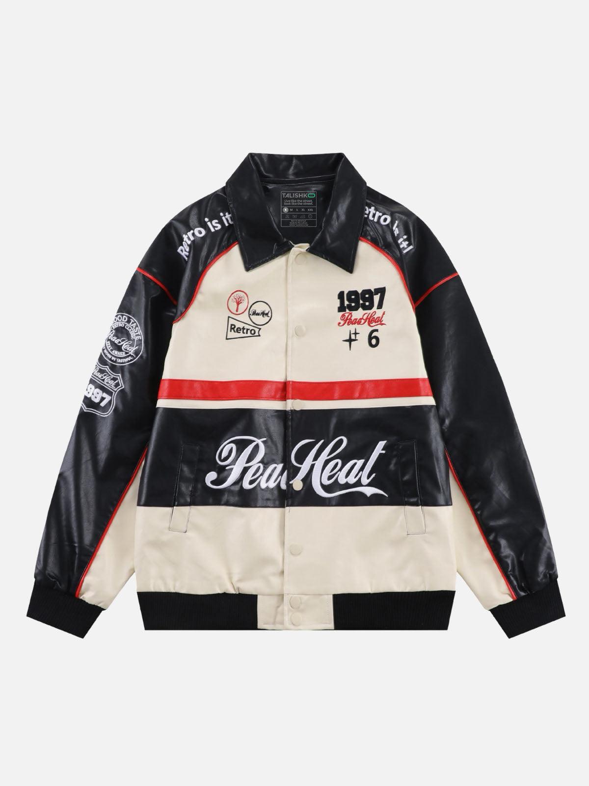 Dominate the streets with a jacket that speaks volumes in style and attitude. This retro-inspired piece, splashed in apricot and bold black, brings back the 90s with a punch of modern flair. The sleek, smooth fabric feels as good as it looks, while the eye-catching graphics and embroidered details electrify your look. Perfectly tailored to drape effortlessly, it’s available in sizes from XS to XL, ensuring a fit that complements every urban warrior. Layer it over your favorite Y2K outfits for ultimate outfit inspo. Get ready to own the scene with every step you take.
