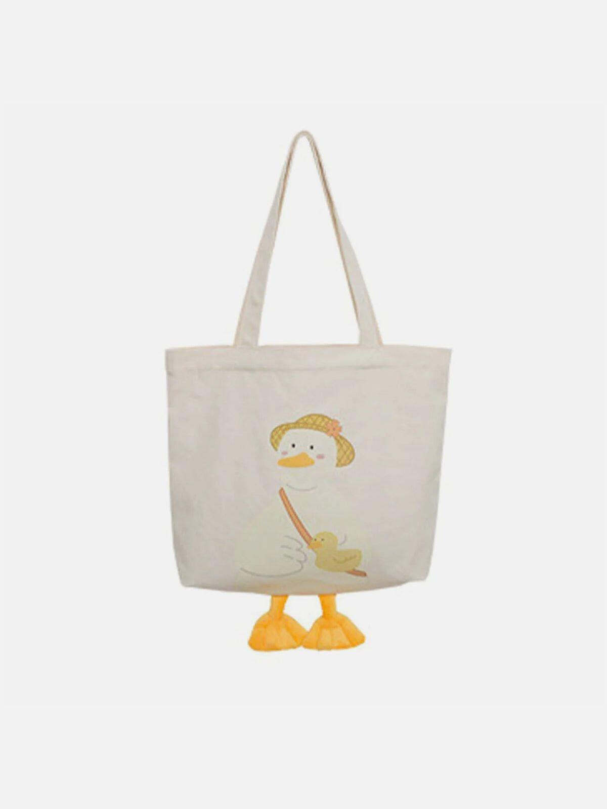 Transform your everyday look with this quirky tote that blends playful design with urban flair. Crafted in a soft beige hue with vibrant yellow duck prints and whimsical foot detailing, this bag stands out in any crowd. Its roomy, one-size-fits-all capacity caters to your streetwear essentials, while the comfortable straps ensure effortless all-day wear. Whether you’re hitting the city streets or looking for outfit inspo for a casual day out, this tote is your perfect companion. Slide into its unique vibe and let your style do the talking.