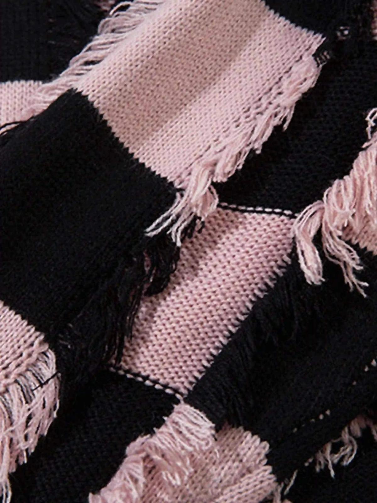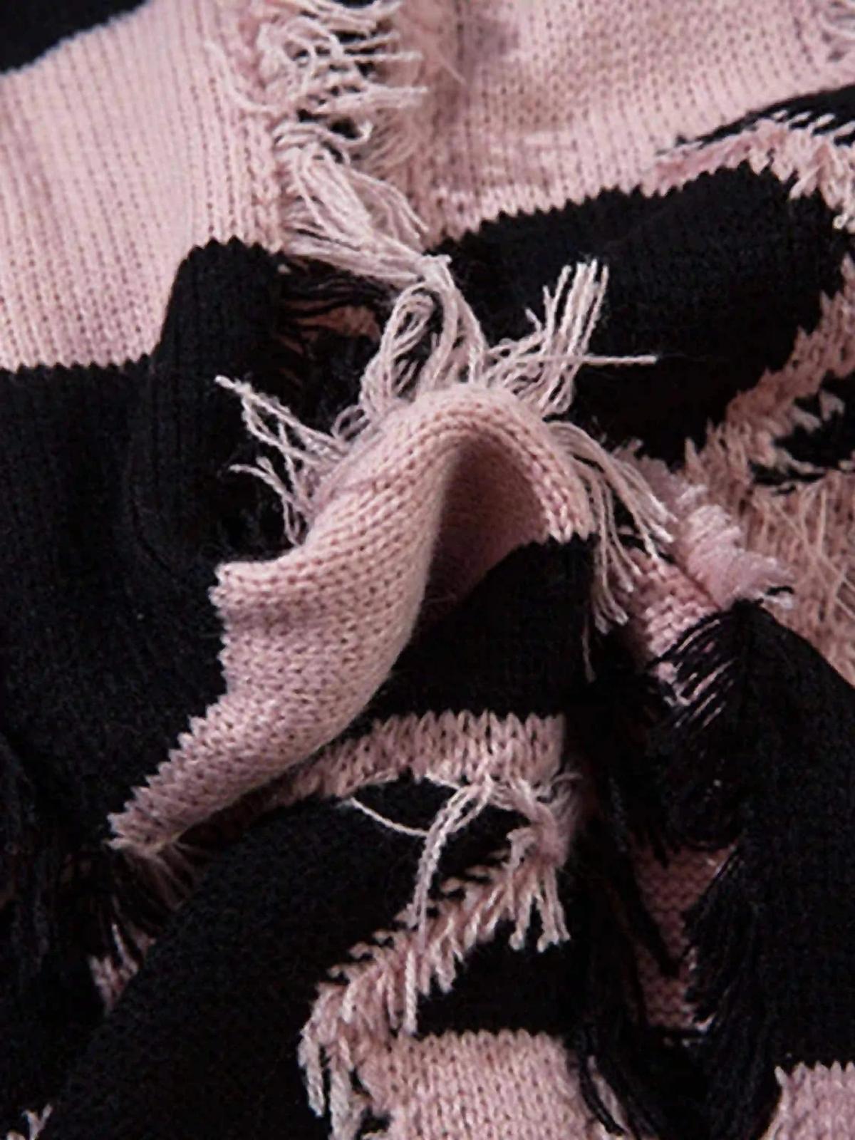 Break free from the ordinary with this bold sweater, where distressed stripes in dark gray and black clash in a rebellious dance of texture and attitude. The artful fraying adds an edge that dares you to stand out, while the relaxed fit ensures you move with ease through the city streets. Available in small to extra-large, this piece offers a versatile fit for every style maven. Whether you’re layering it over a tee or pairing it with your favorite jeans, this sweater is your ticket to effortless streetwear fashion. Grab yours and redefine your y2k outfit game today.