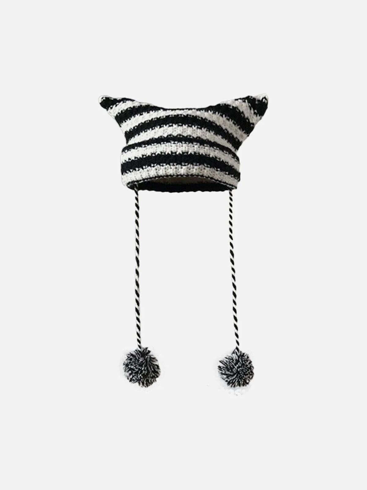 Break free from the ordinary with this edgy, cat-ear beanie that screams individuality and urban flair. The bold black and white stripes create a striking contrast, while the playful pom-poms add a touch of whimsy, making it an essential piece for anyone daring enough to embrace streetwear fashion. Designed in a one-size-fits-all approach, this beanie ensures a snug and comfortable fit, perfect for adding a quirky twist to your y2k outfits. Whether you’re pairing it with a red jacket for a pop of color or embracing the monochrome vibe, this accessory transforms any look into a conversation starter. Ready to redefine your outfit ideas? Slip it on and own the streets.