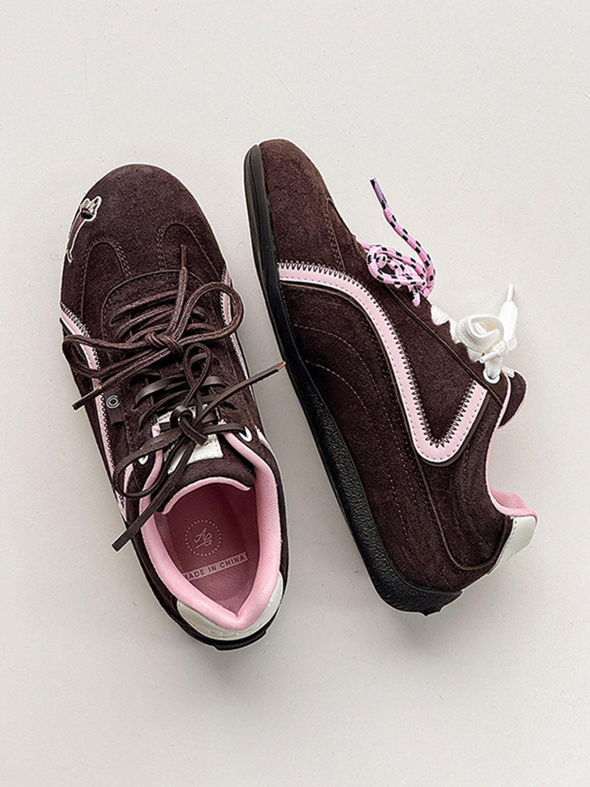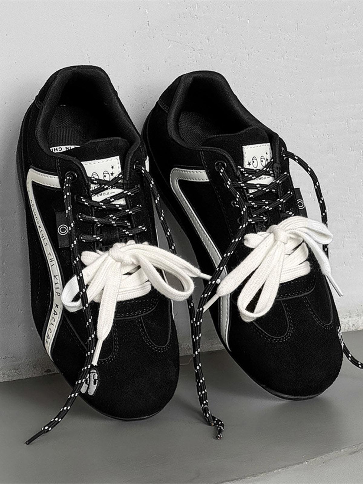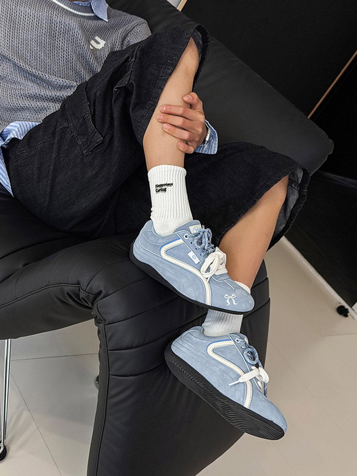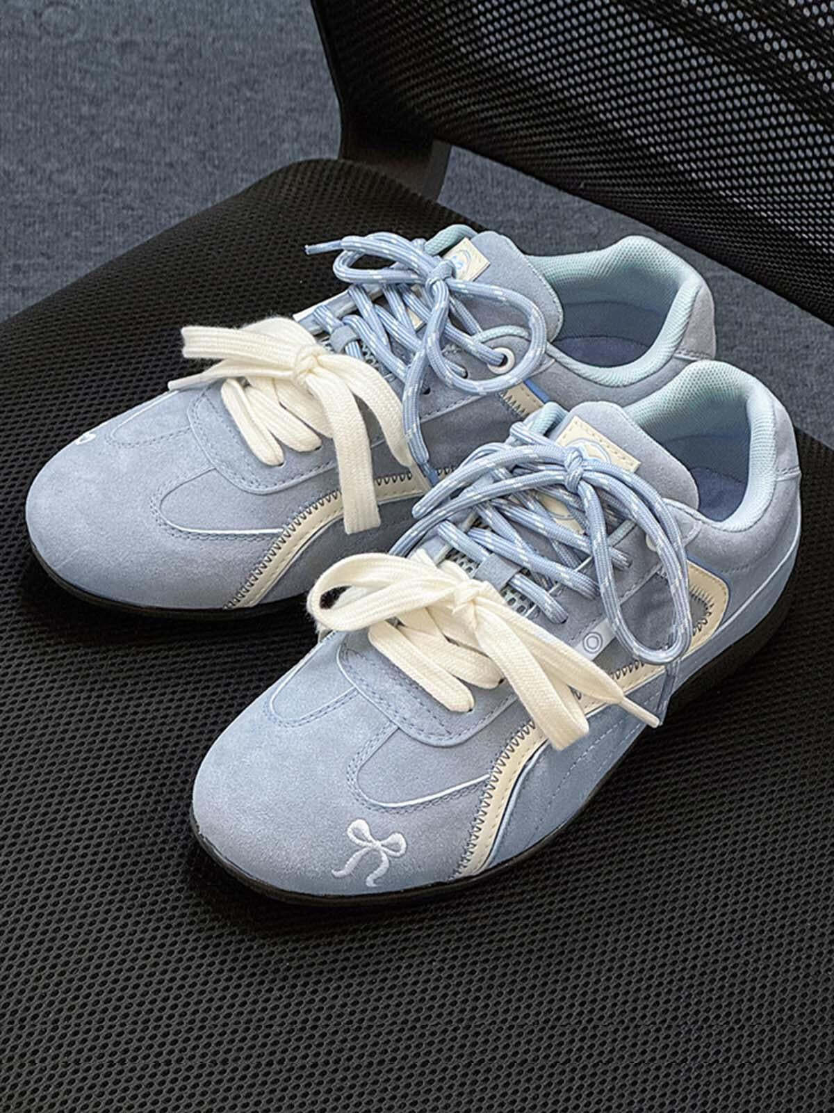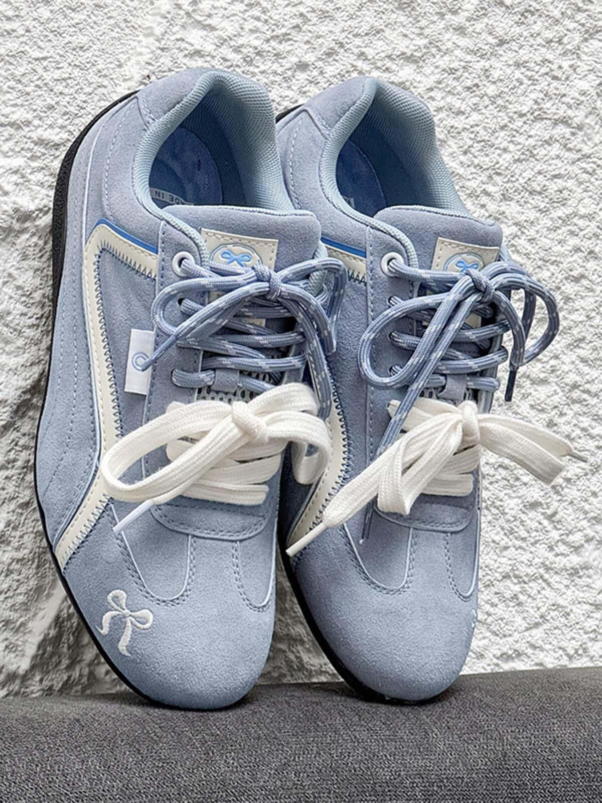 Rock the streets with Suede Lace-Up Sneakers, perfect for spring and fall. Designed for casual outings and light sports, these sneakers feature bold two-tone laces and a unique embroidered bow. A contrasting inner lining adds flair, making them ideal for all-day comfort and style.