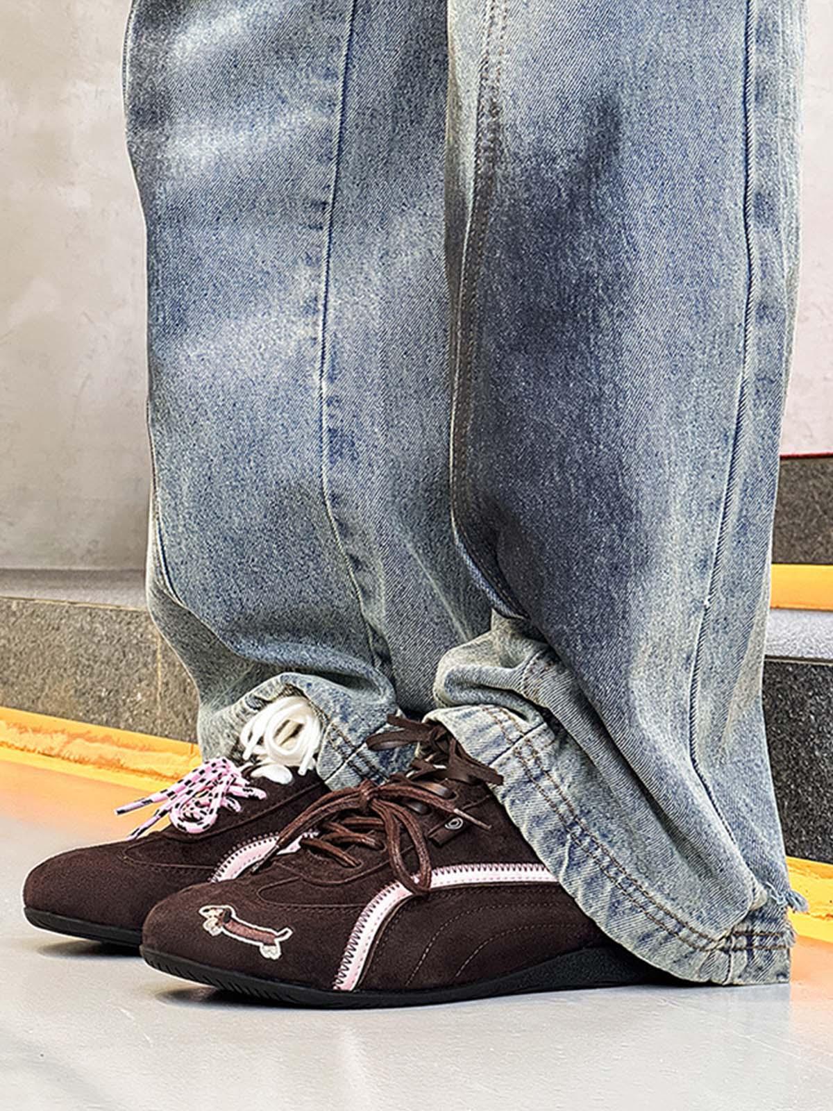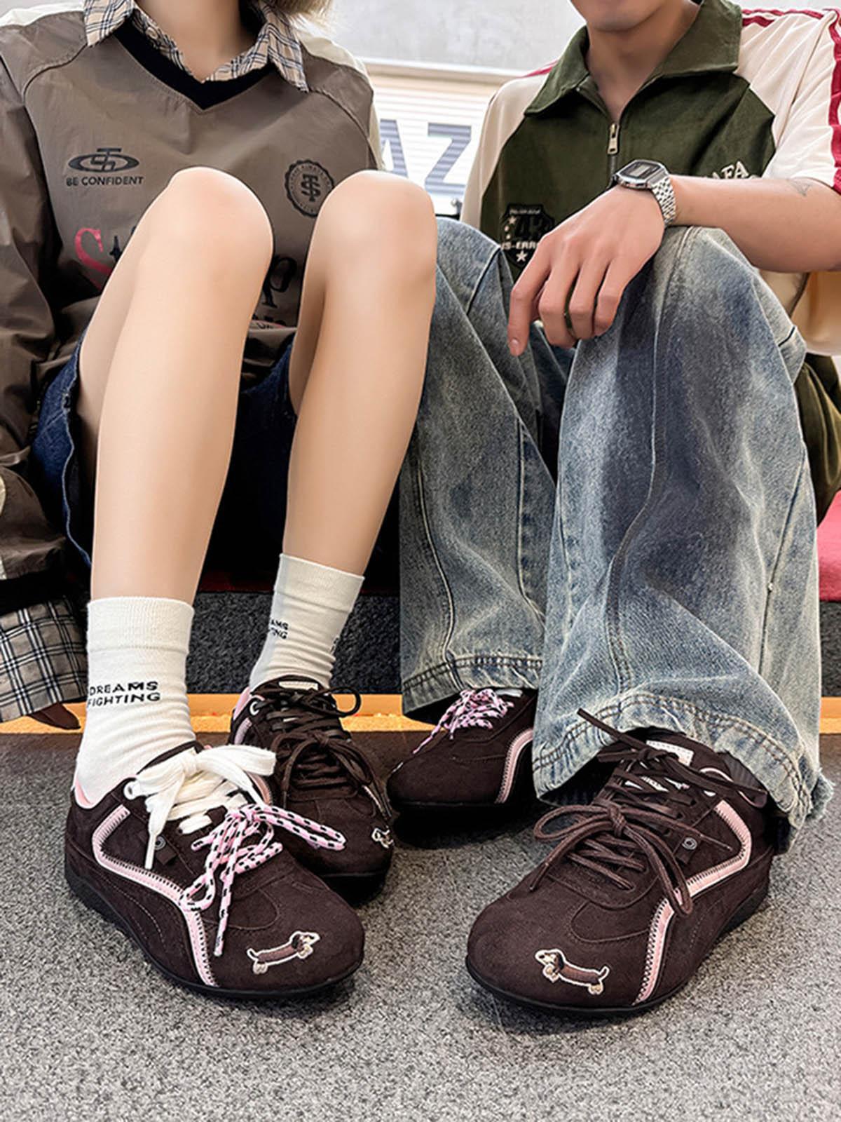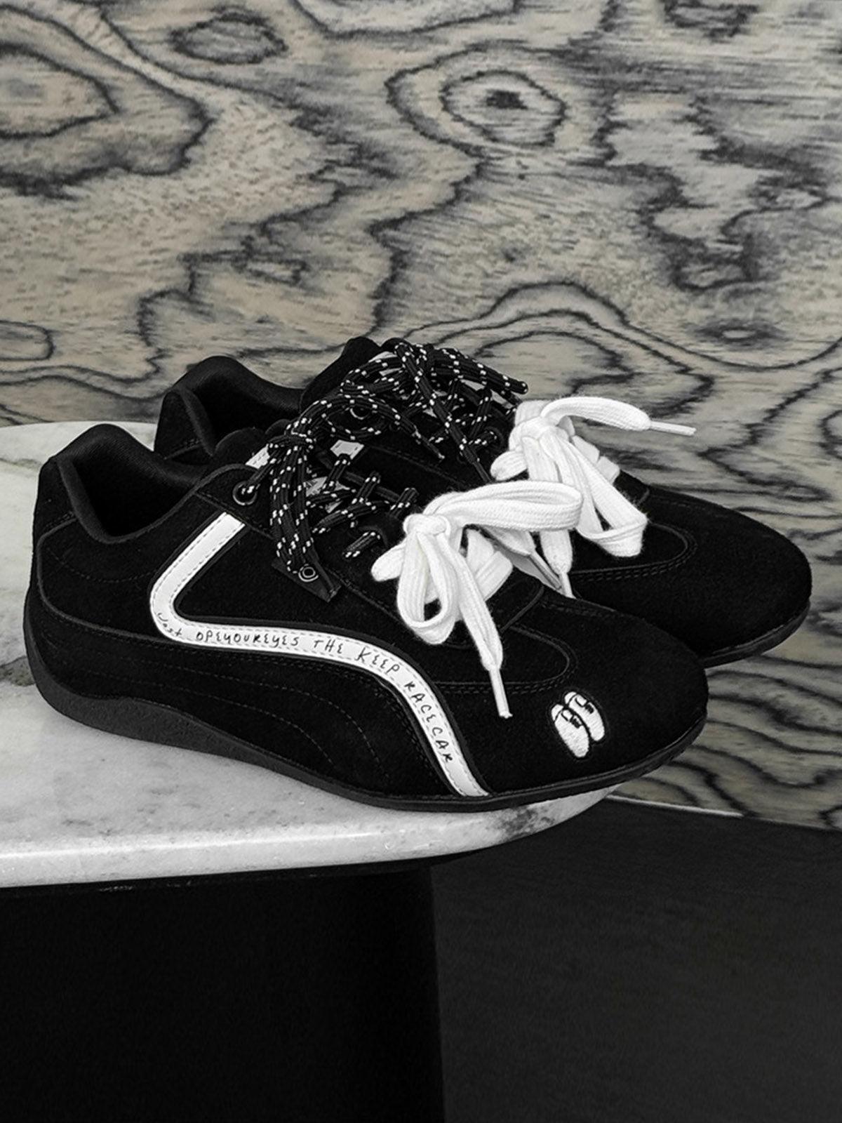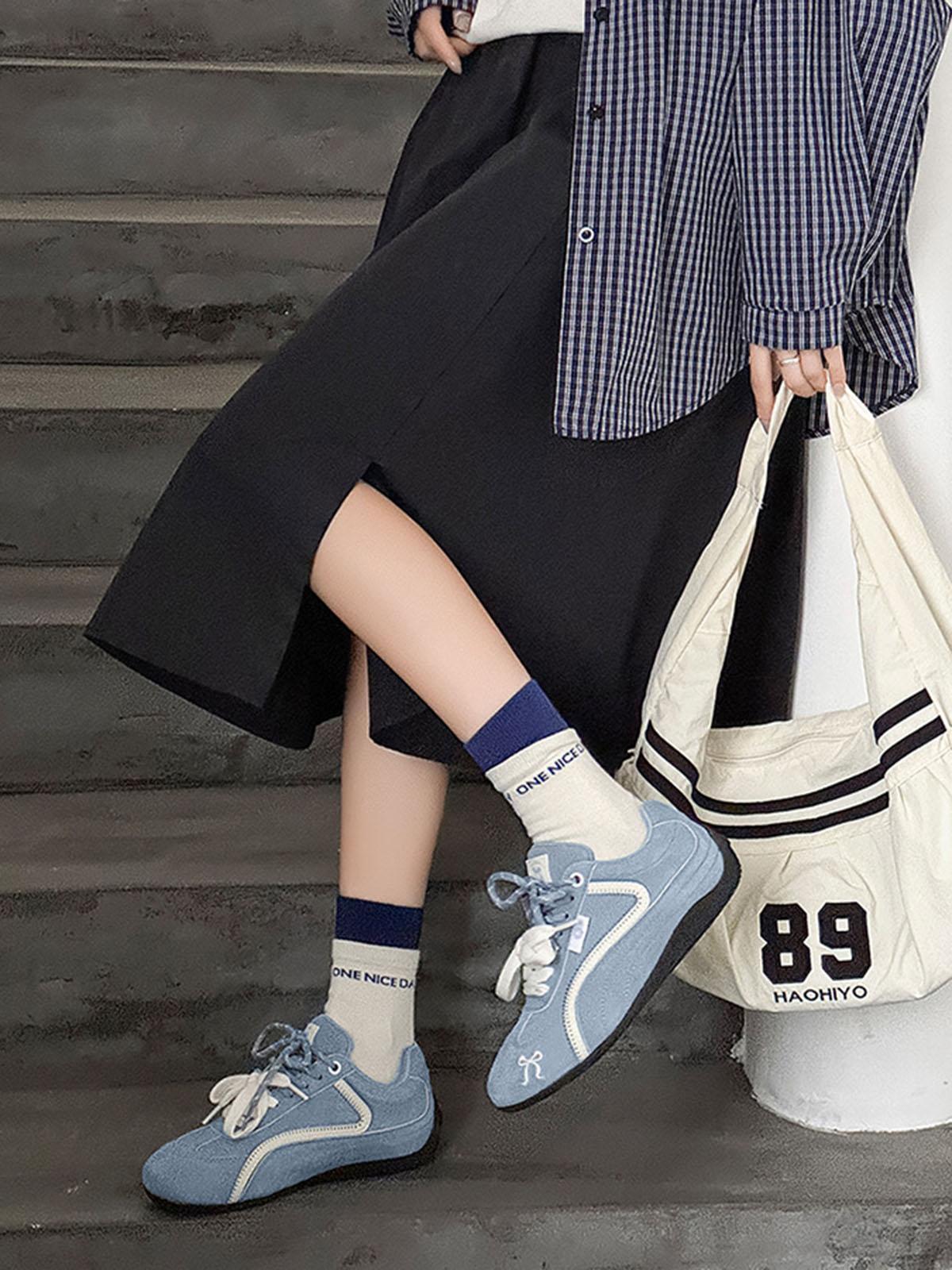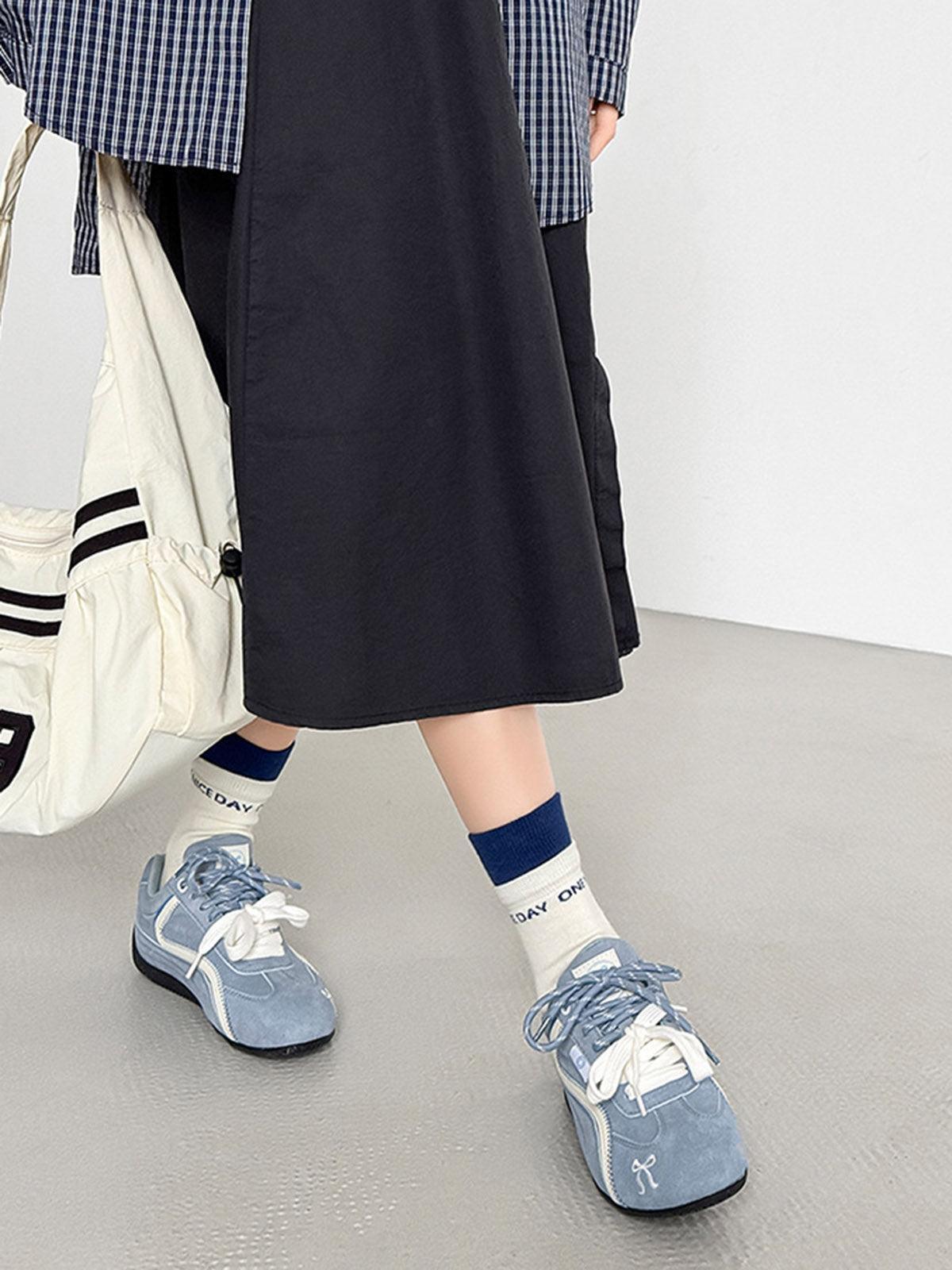Rock the streets with Suede Lace-Up Sneakers, perfect for spring and fall. Designed for casual outings and light sports, these sneakers feature bold two-tone laces and a unique embroidered bow. A contrasting inner lining adds flair, making them ideal for all-day comfort and style.