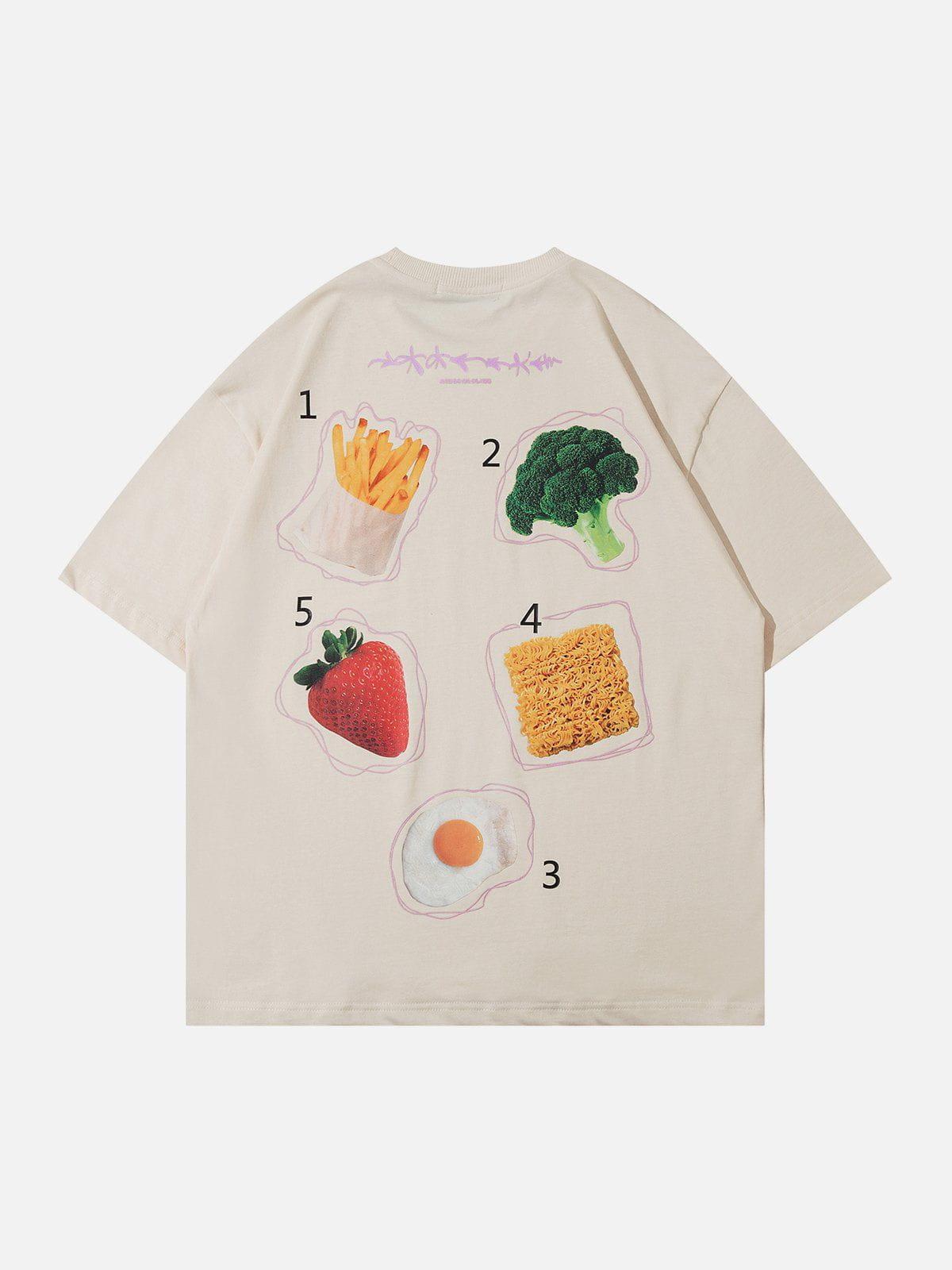 Turn heads with this eye-catching tee that serves up a playful twist on classic streetwear. Illustrated with vibrant prints of fries, broccoli, strawberries, ramen, and a sunny-side-up egg, this design breaks the mold with bold graphics that pop against the sleek black background. Available in versatile sizes from S to XL, and with a chic apricot option to spice up your summer wardrobe, this piece embodies modern urban flair with a comfortable fit that’s perfect for any spontaneous adventure. Pair it with your favorite denim or joggers for effortless summer style that speaks volumes. Grab yours and let your outfit do the talking.