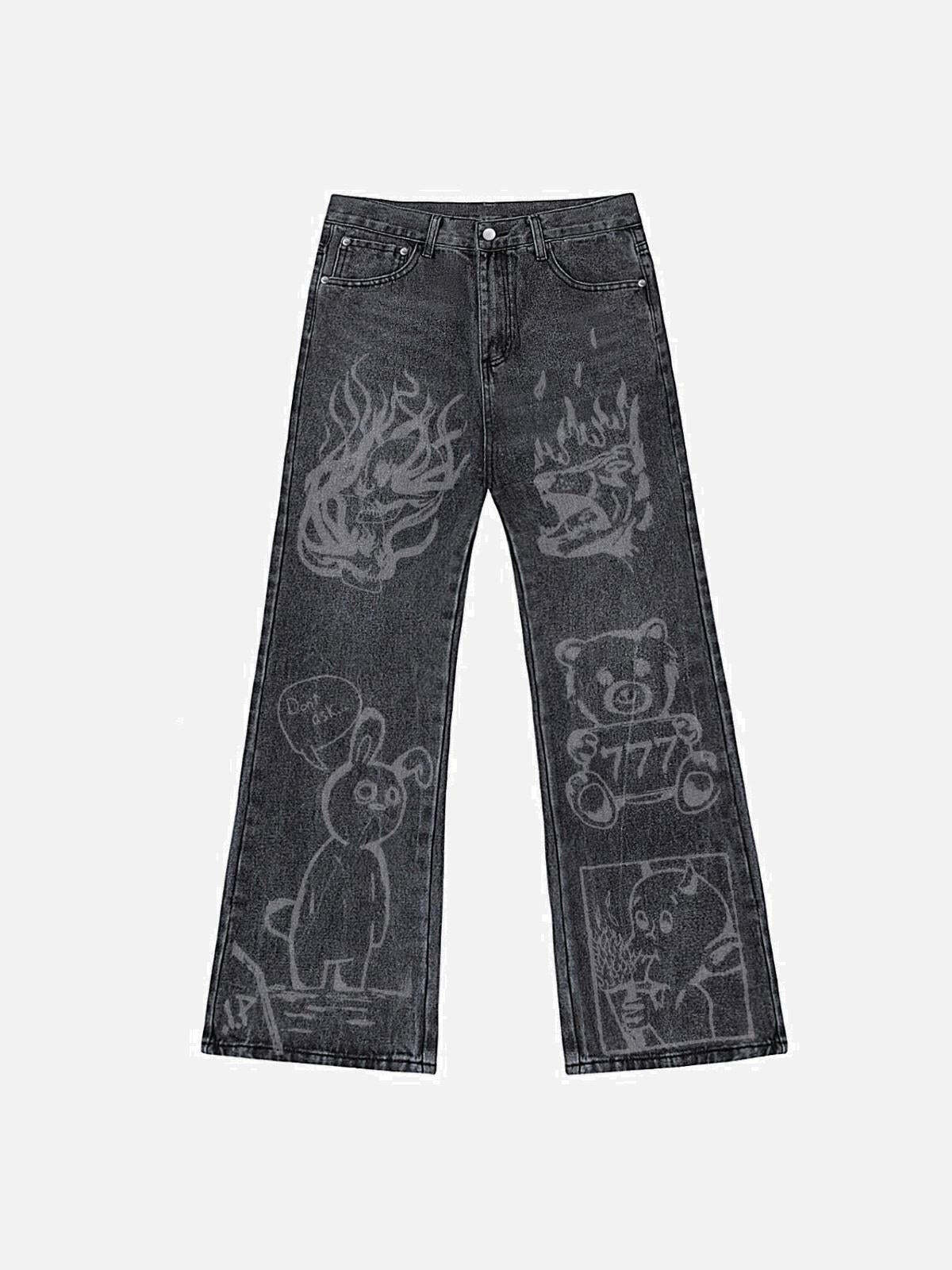 These jeans redefine urban edge, flaunting a bold gray canvas adorned with striking graphic art that channels a rebellious spirit. The intricate designs feature playful yet fierce characters, adding a touch of streetwear fashion that’s perfect for those who live unapologetically. With a relaxed fit that’s available in sizes ranging from S to XXL, these jeans promise comfort without compromising style. Pair them with your favorite oversized hoodie for a y2k outfit that speaks volumes. Ready to turn heads? Slip into these jeans and let your style do the talking.