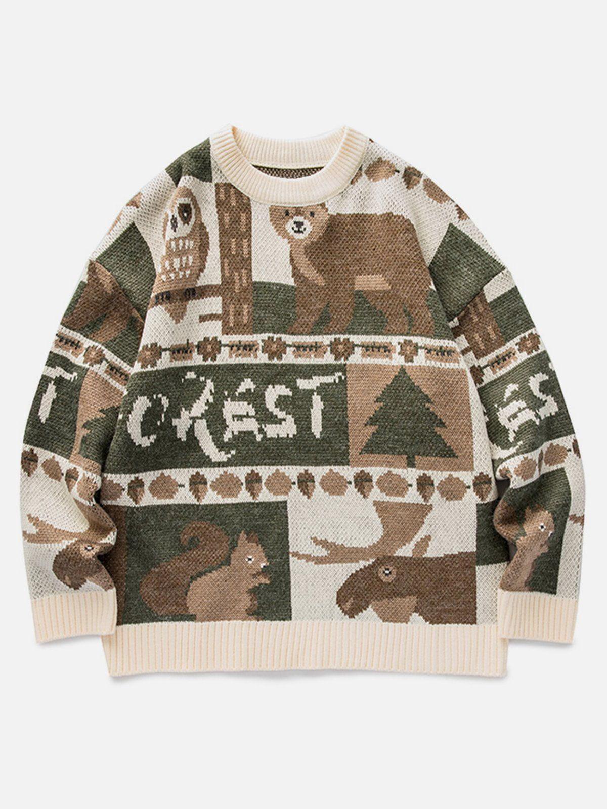 Embrace the wild with this bold, nature-inspired knit that weaves together the essence of the forest in every thread. This sweater features a unique tapestry of woodland creatures, from the wise owl to the majestic bear, all set against earthy beige and dark gray tones. The intricate textures and patterns demand attention, making it a standout piece in any streetwear fashion lineup. Available in a relaxed fit across sizes S, M, L, and XL, this piece offers both comfort and versatility, perfect for layering over a crisp white tee or pairing with your favorite cargos. Elevate your y2k outfits with a touch of nature’s charm.