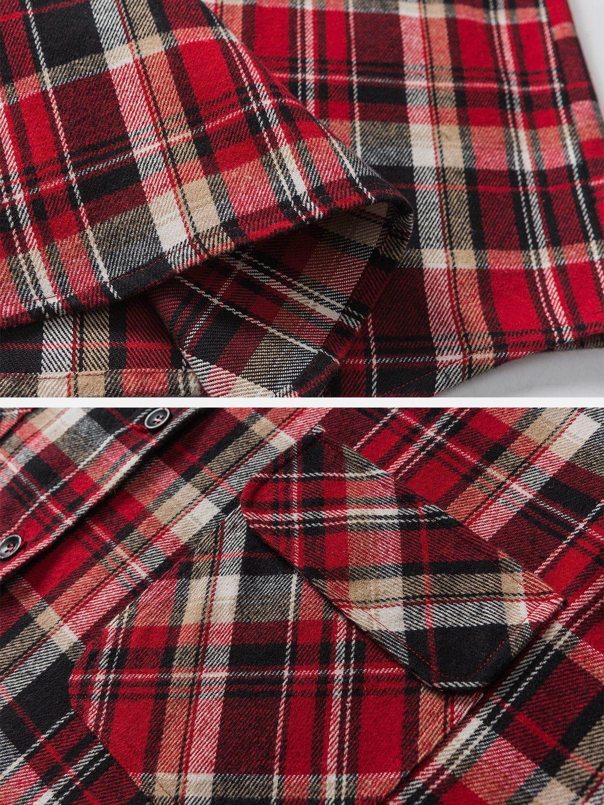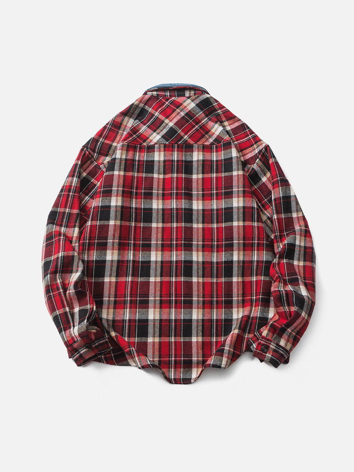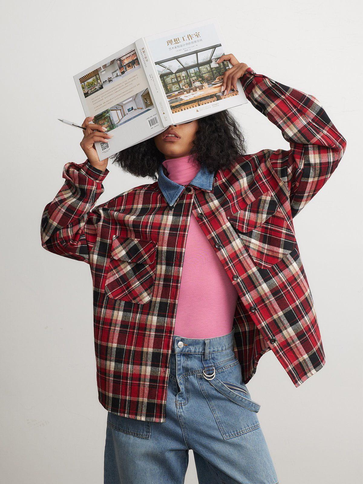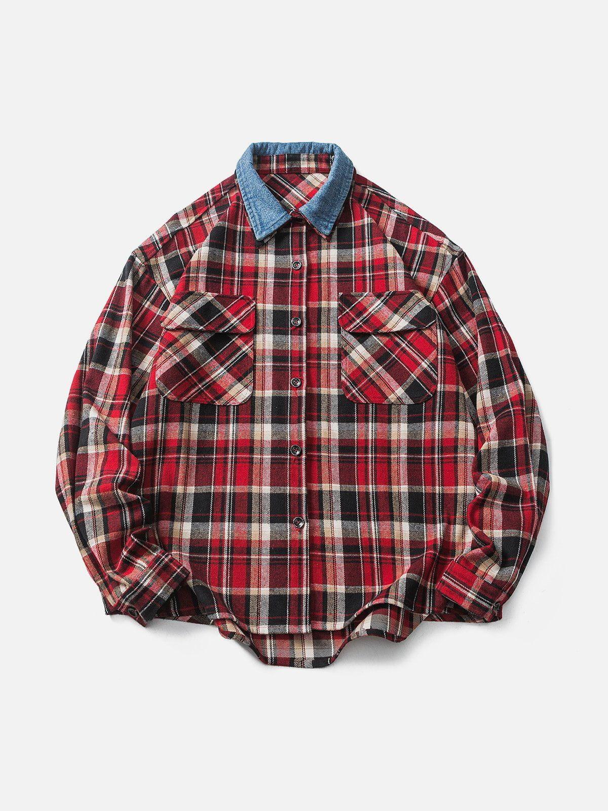 Revamp your streetwear game with this edgy plaid shirt, where vibrant red tones collide with a bold denim collar to create a striking look that refuses to be ignored. The rugged texture and classic button-down design are complemented by spacious chest pockets, offering both style and utility for any urban adventure. Available in sizes S through XL, this shirt ensures a perfect fit for every trendsetter. Pair it with distressed jeans for a laid-back vibe or layer it over a graphic tee to channel that y2k spirit. Grab yours now and redefine your outfit ideas with confidence.