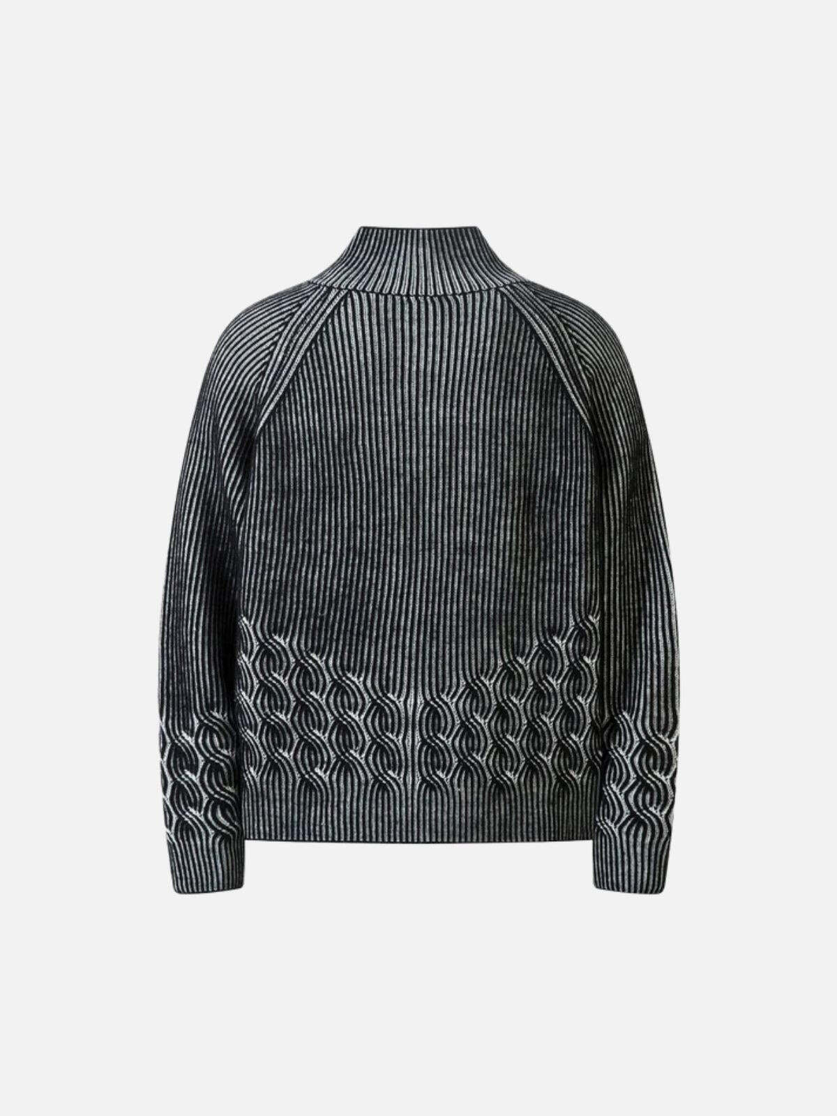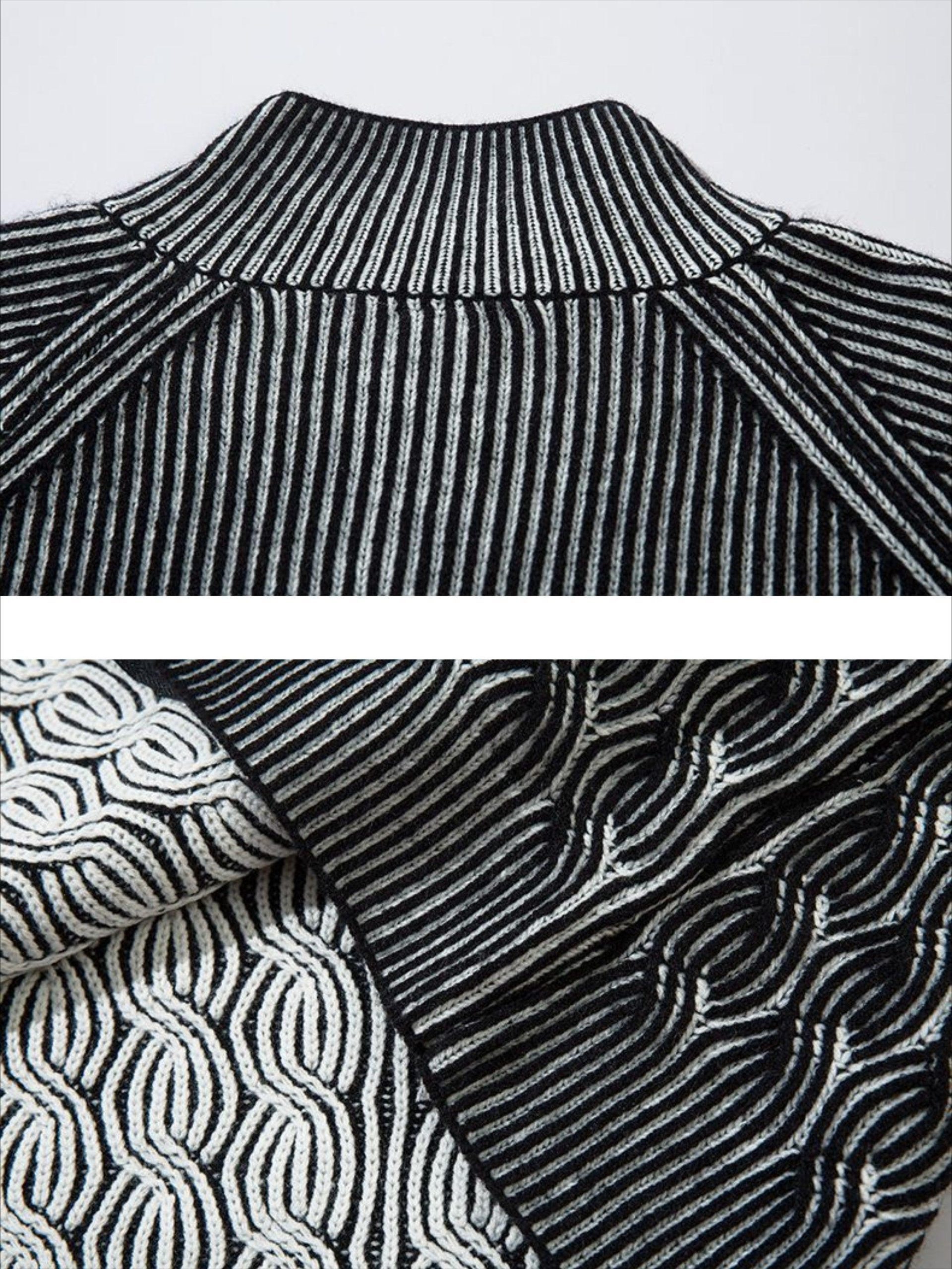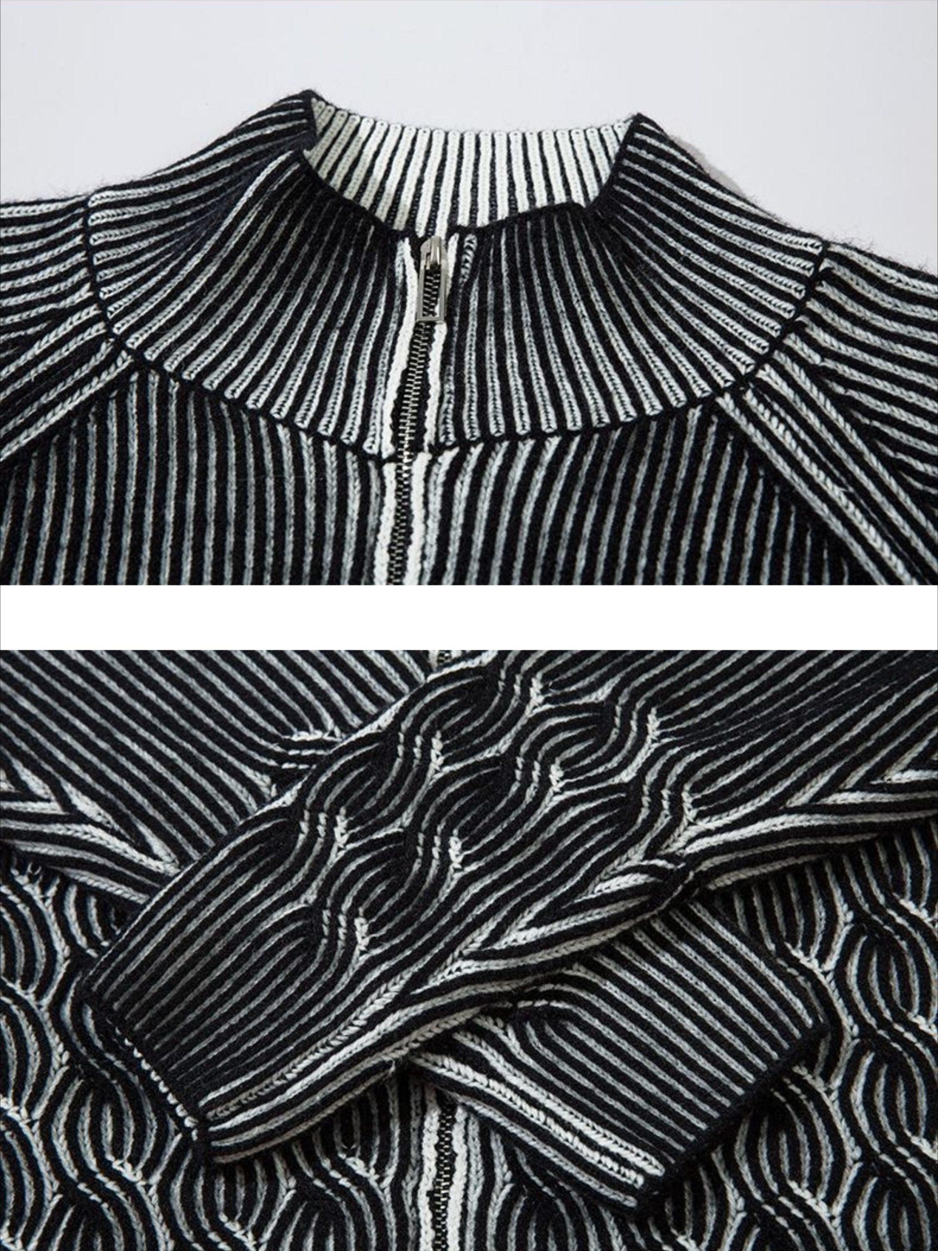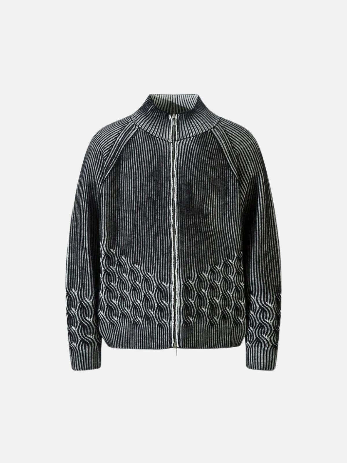 Push the boundaries of streetwear fashion with this dynamic knit jacket, where sleek black and gray hues intertwine in an eye-catching pattern that demands a second look. The tactile texture is a testament to urban ingenuity, blending ribbed detailing with intricate wave designs that offer both visual and sensory appeal. Perfect for layering over your favorite tees, this piece is crafted in medium, large, and extra-large sizes to provide a relaxed yet confident fit. Whether you’re stepping out for a casual hang or elevating your y2k outfits, this jacket is your go-to for versatile outfit ideas. Slip it on and redefine your everyday style.