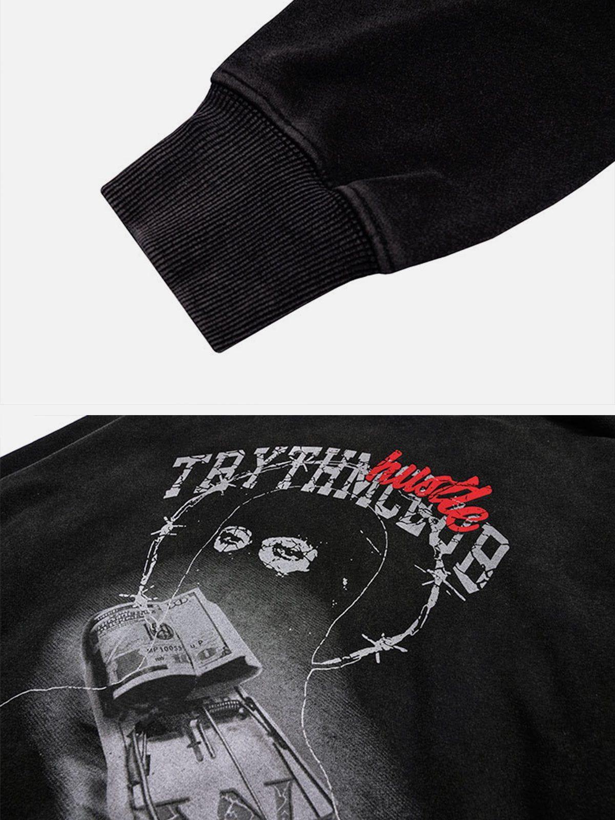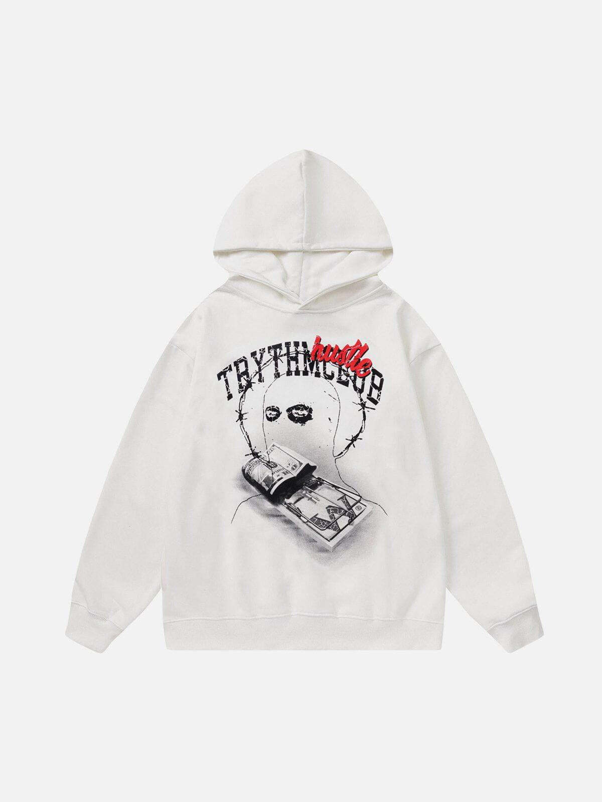 Fuel your hustle with this audacious hoodie that blends street art with bold typography, making every step a statement. The distressed black fabric forms a perfect canvas for the striking graphic of barbed wire and cash that screams urban edge. With cool red and white text adding a pop of contrast, this piece is available in versatile sizes S, M, and L, ensuring a fit that’s as comfortable as it is commanding. Pair it with your favorite jeans for a killer streetwear fashion vibe that’s ready to take on the city. Dare to redefine your style game now.