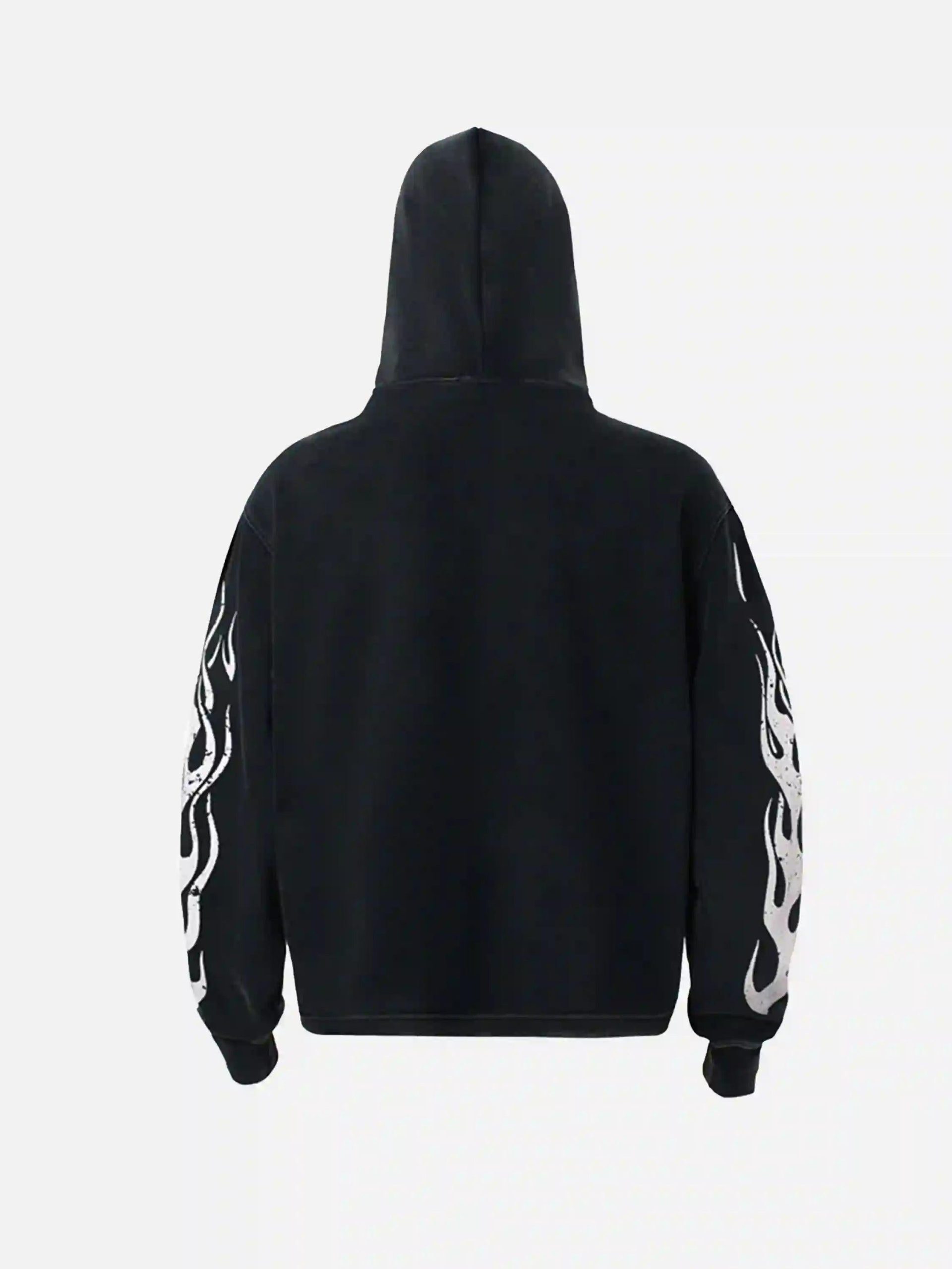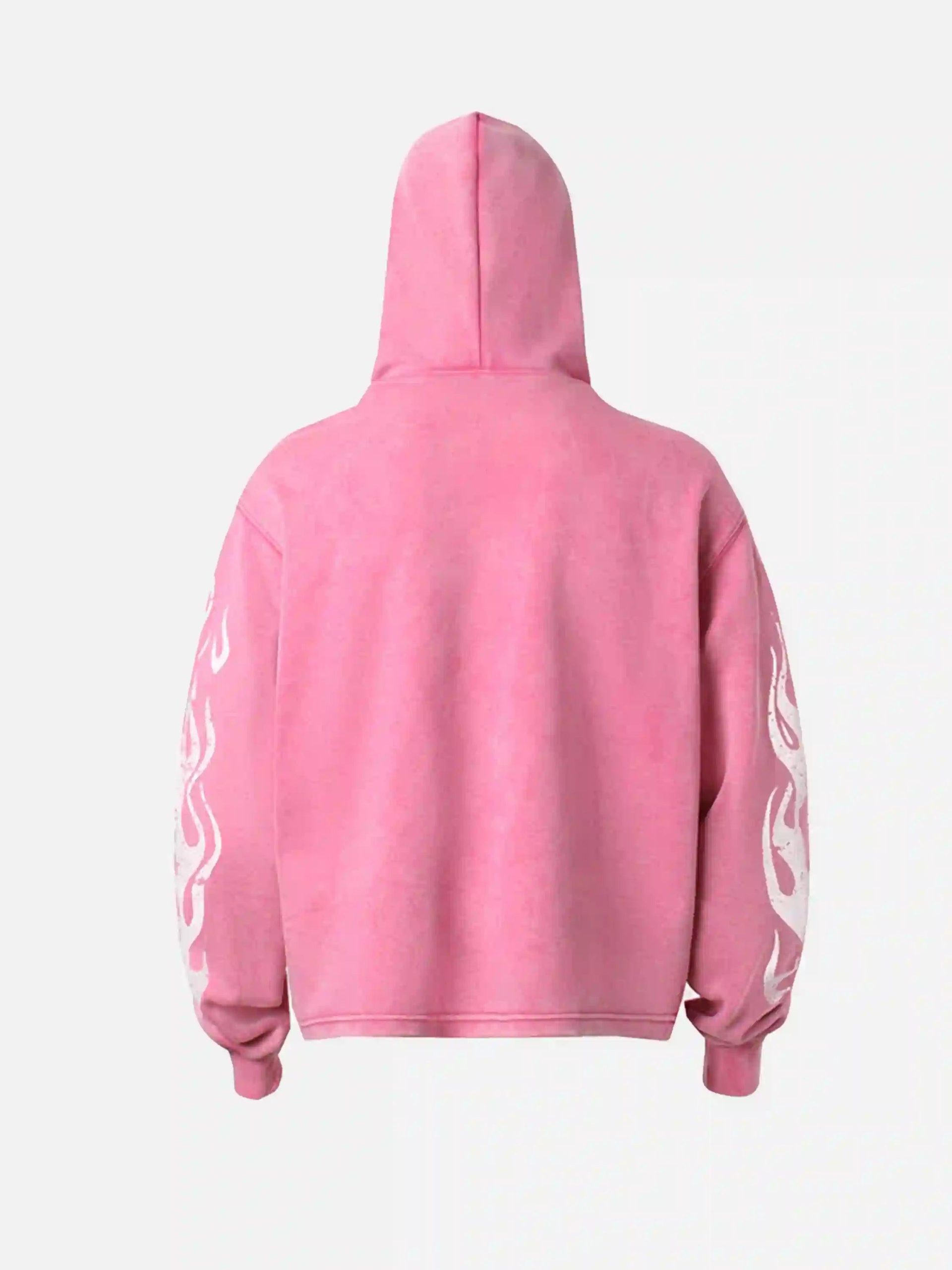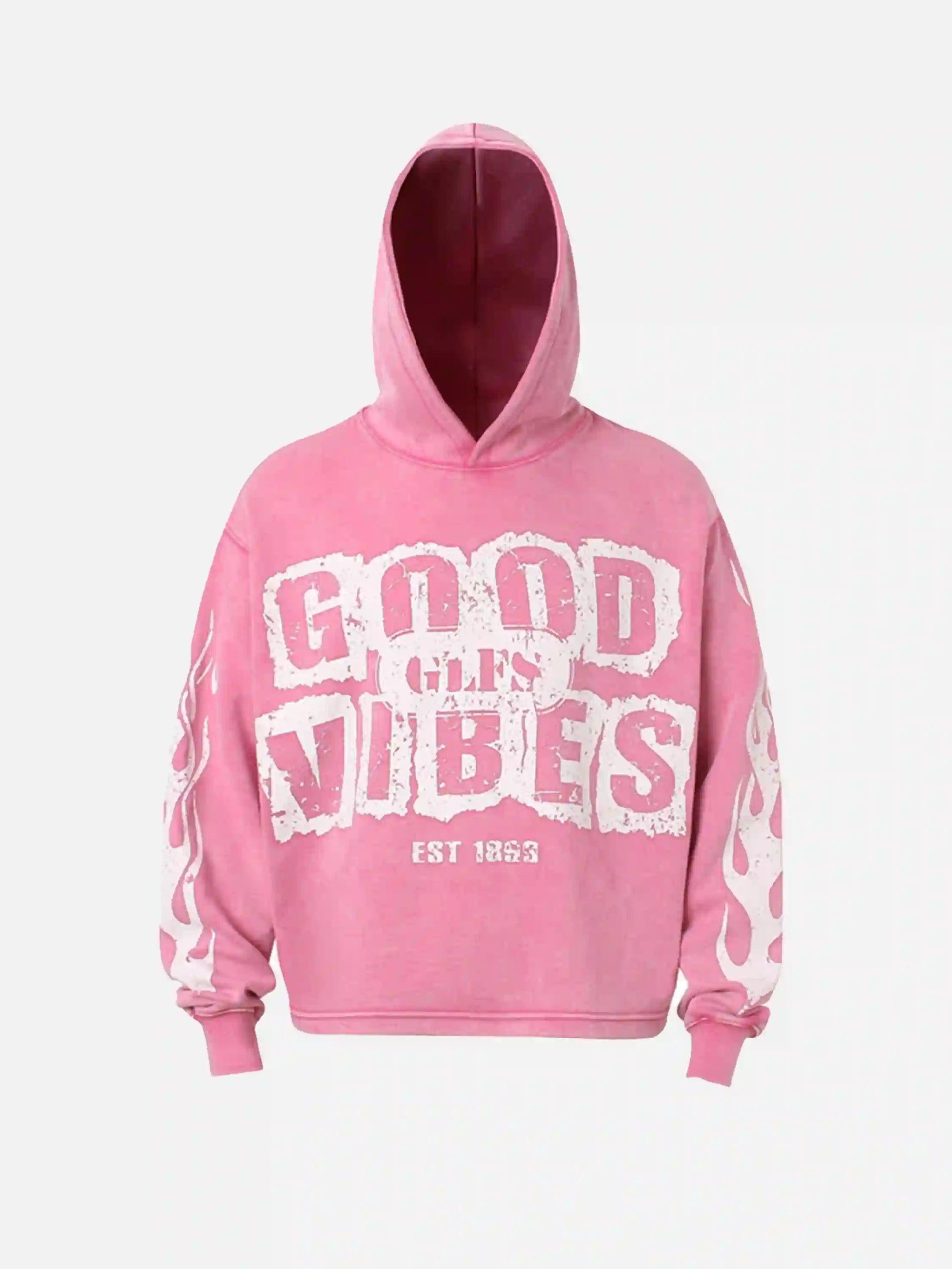 Break the mold with this striking hoodie, where bold graphics meet fiery sleeve designs, creating a perfect fusion of streetwear fashion and y2k vibes. The rugged black backdrop intensifies the edgy white lettering of ‘GOOD VIBES,’ while flame motifs on the sleeves add a fierce touch. Available in versatile sizes from M to XL, this piece ensures a relaxed fit that looks just as good in gray or pink. Pair it with your favorite distressed jeans or joggers for an effortless urban look. Grab yours and let your style speak volumes.