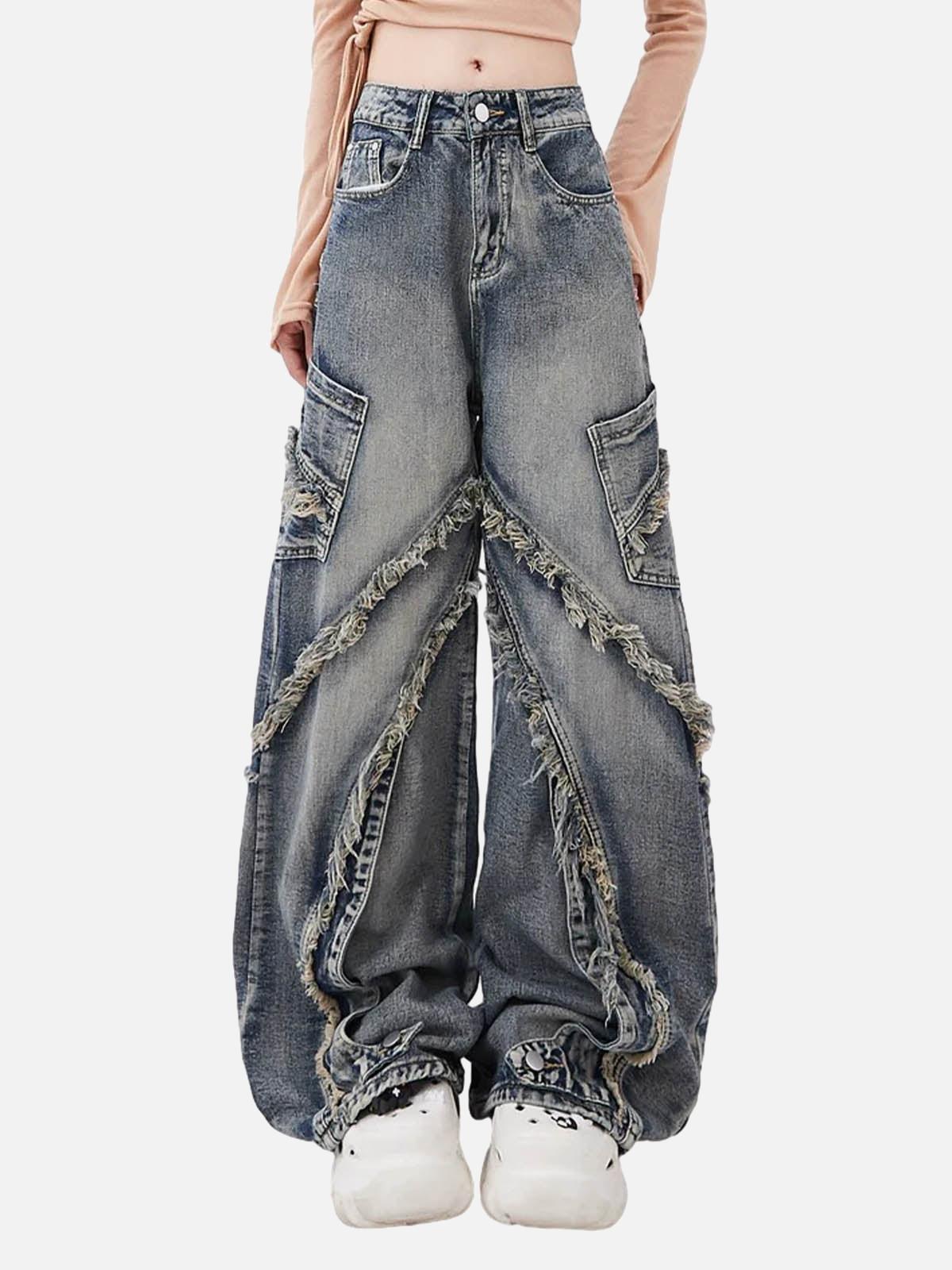 Dare to redefine streetwear fashion with these edgy, distressed jeans that flaunt a unique frayed texture and bold seam detailing. The cool, washed blue hue complements the rugged design, making it an essential piece for those who thrive on urban vibes. Available in sizes ranging from S to 2XL, these jeans offer a relaxed fit that pairs effortlessly with your favorite sneakers or boots. Elevate your wardrobe and step into a realm of style that’s unapologetically you.