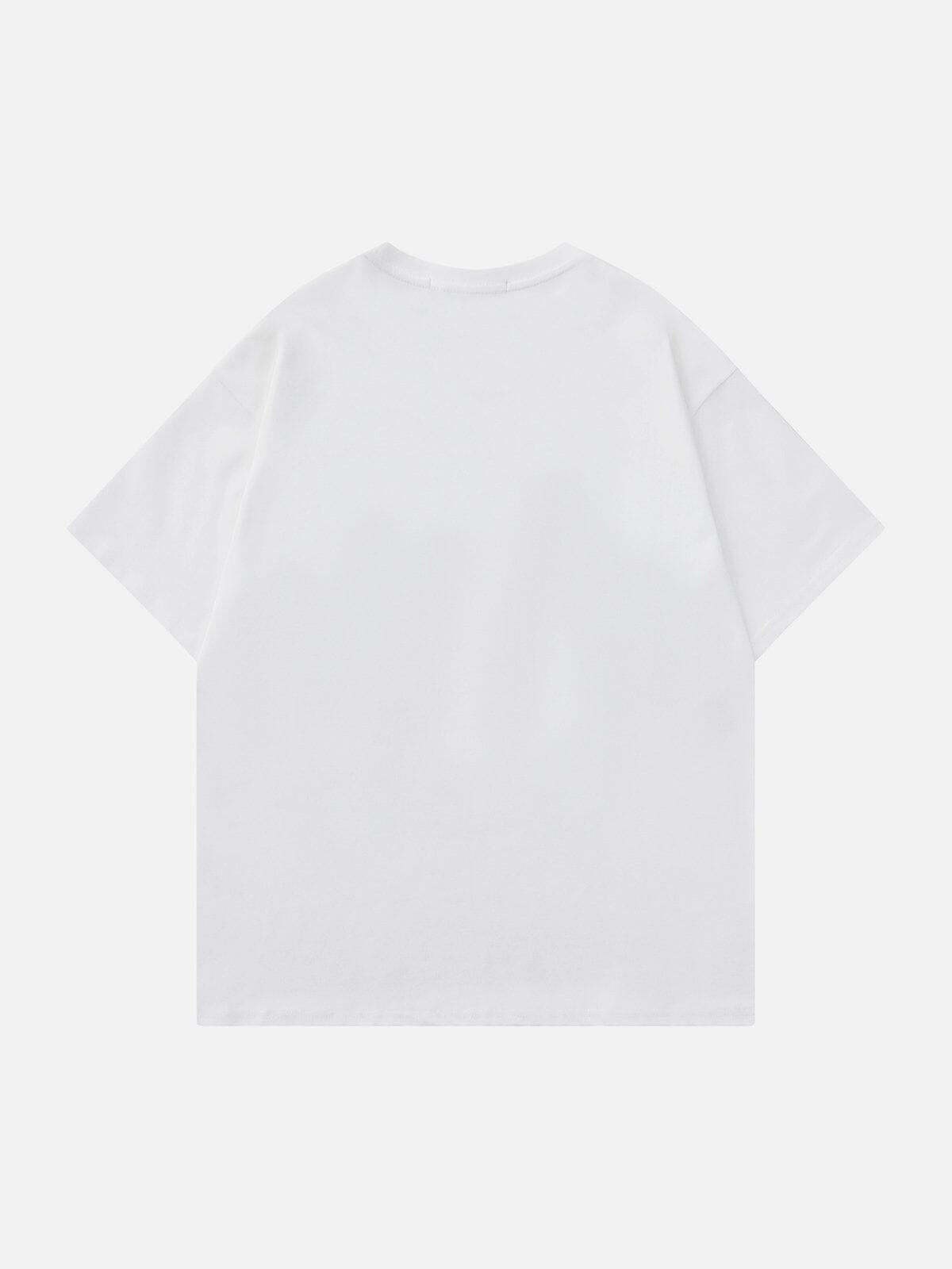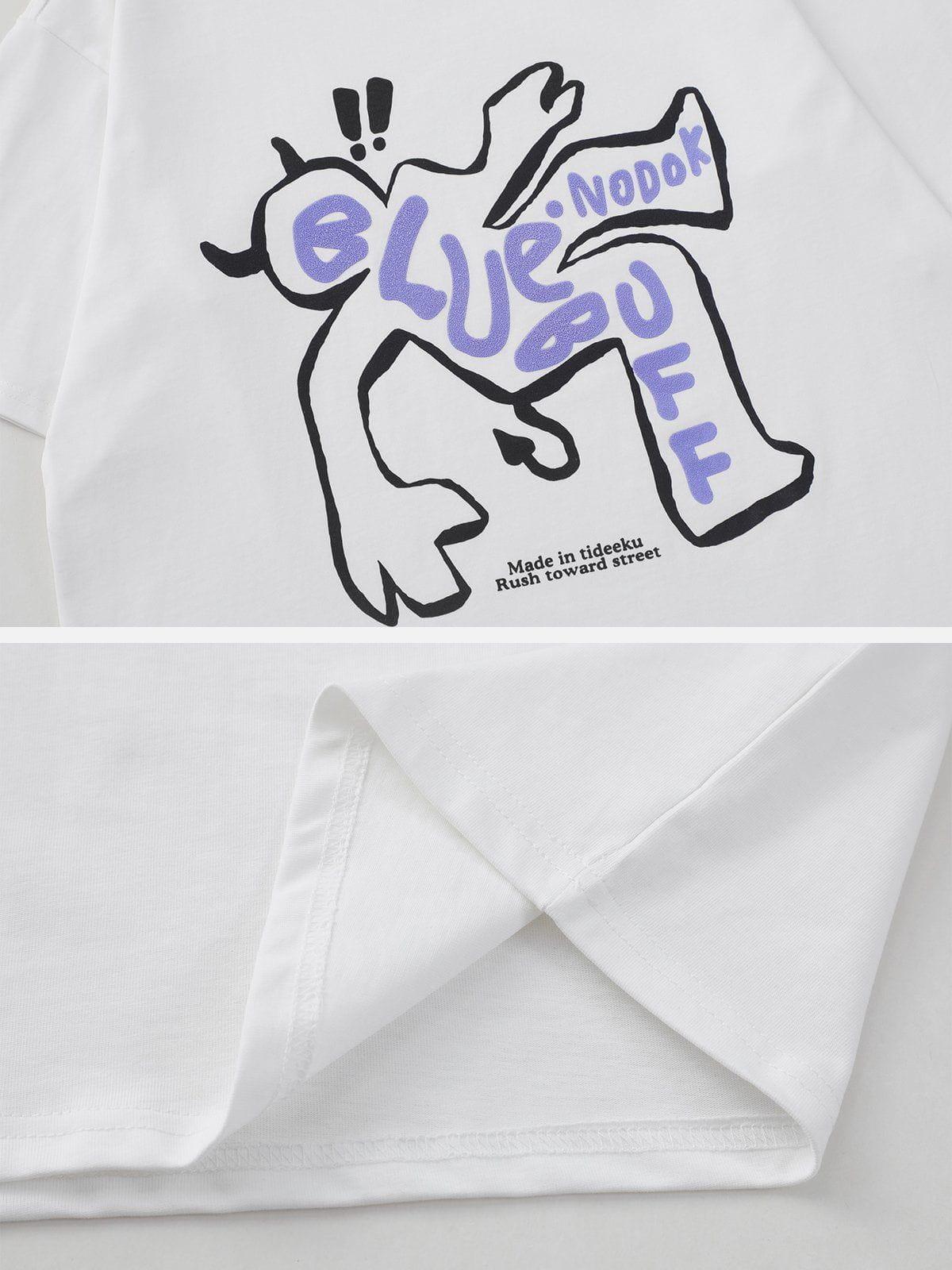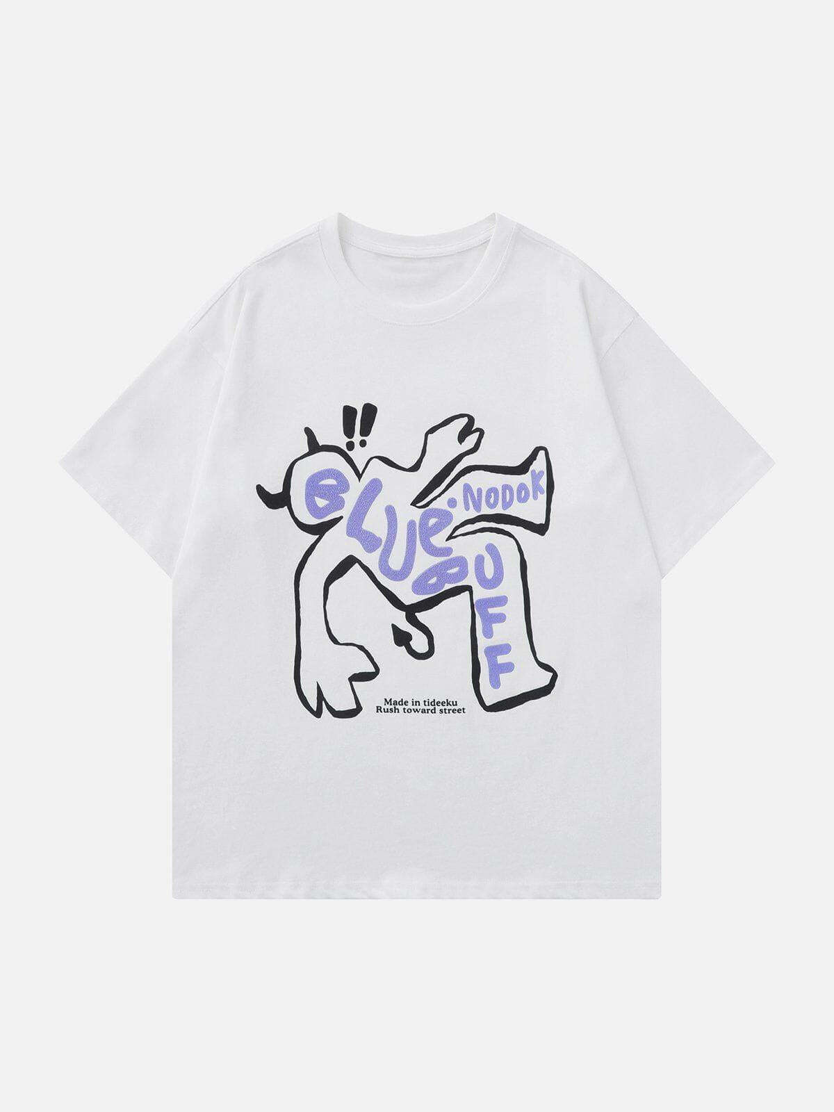 Embrace the urban vibe with this eye-catching tee, where bold artistry meets street style. The striking graphic design, splashed across a clean white canvas, commands attention with its playful blend of black and purple elements. Available in versatile sizes from S to L, this piece offers a relaxed fit perfect for summer fashion inspo. Pair it with your favorite jeans or shorts, and let your outfit do the talking. Dive into the world of expressive style and make it yours today.