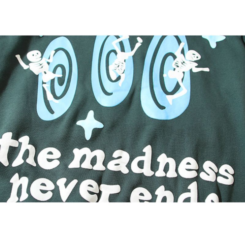 - Bold puff print with “the madness never ends” slogan – eye-catching and rebellious