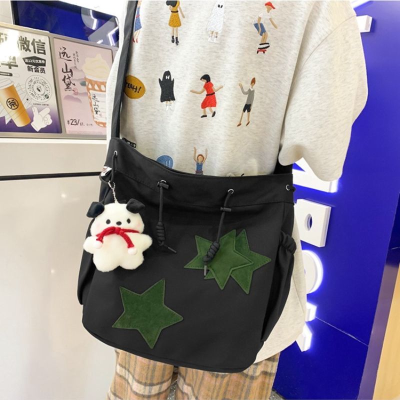 Features: Bags, star pattern embroidery, shoulder bag, crossbody bag, drawstring, side pocket, color contrast, unisex, simple.