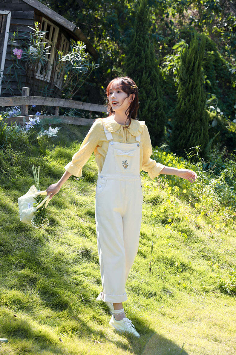 Flowers embroidered high-waisted work pants! These soft apricot-colored wide-leg pants are made with 96% or more denim fabric and high-quality cotton, providing both comfort and style.