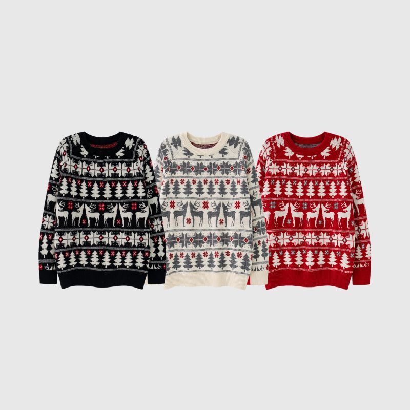 Features: Pullover, crew neck, long sleeve, color contrast design, christmas elk pattern jacquard, ribbed sleeve cuffs and bottom hem, relaxed fit, jacquard weave, couple outfits.