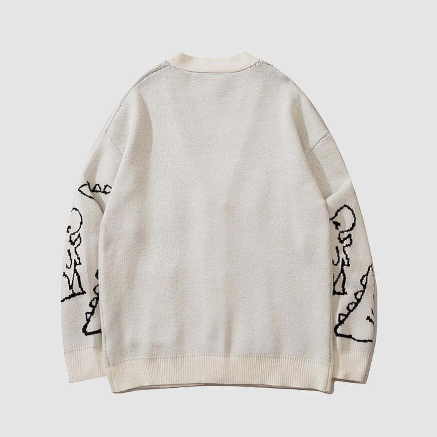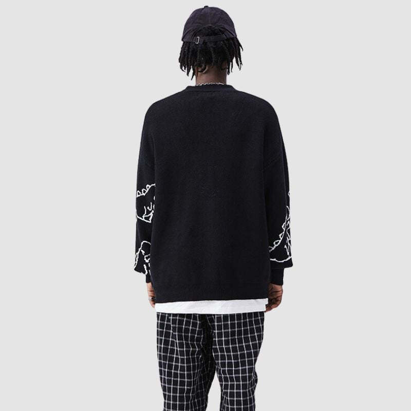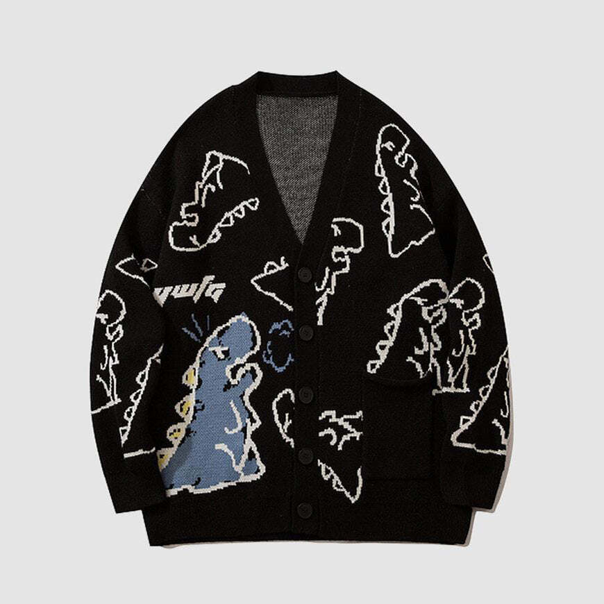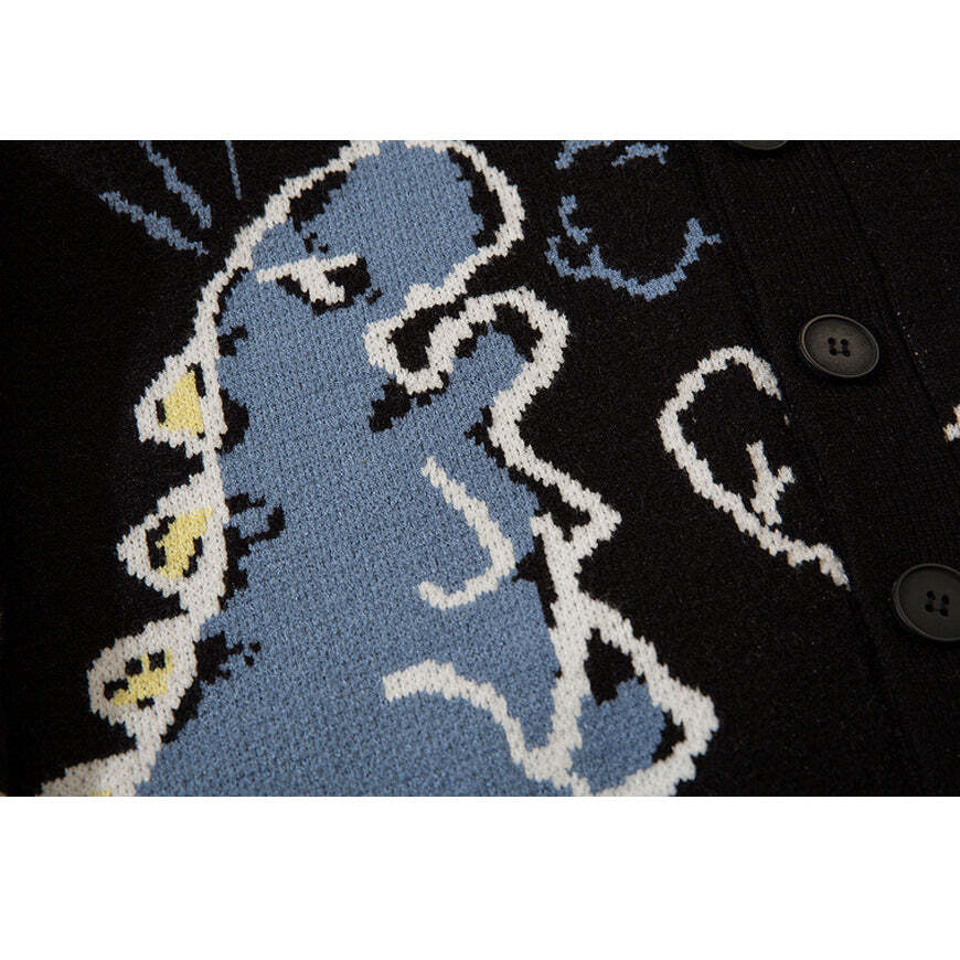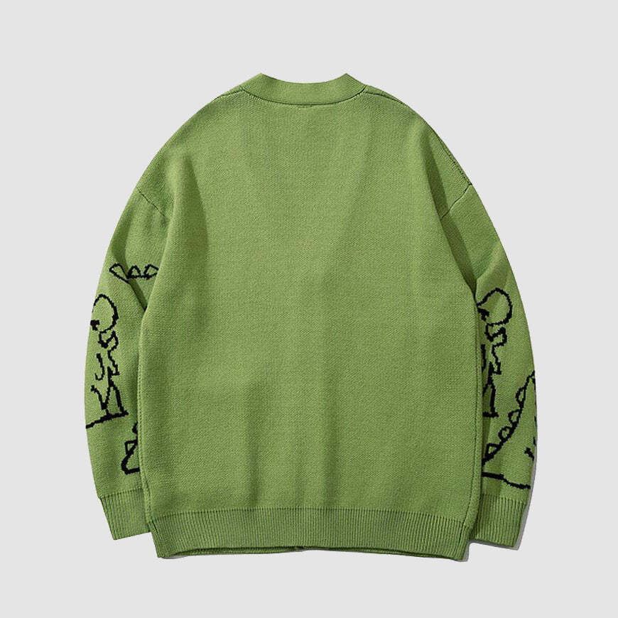The loose and versatile v-neck cardigan is printed full of childlike dinosaur patterns, which makes this cardigan sweater expressing street hip-hop, there is also some sense of cute and playful.