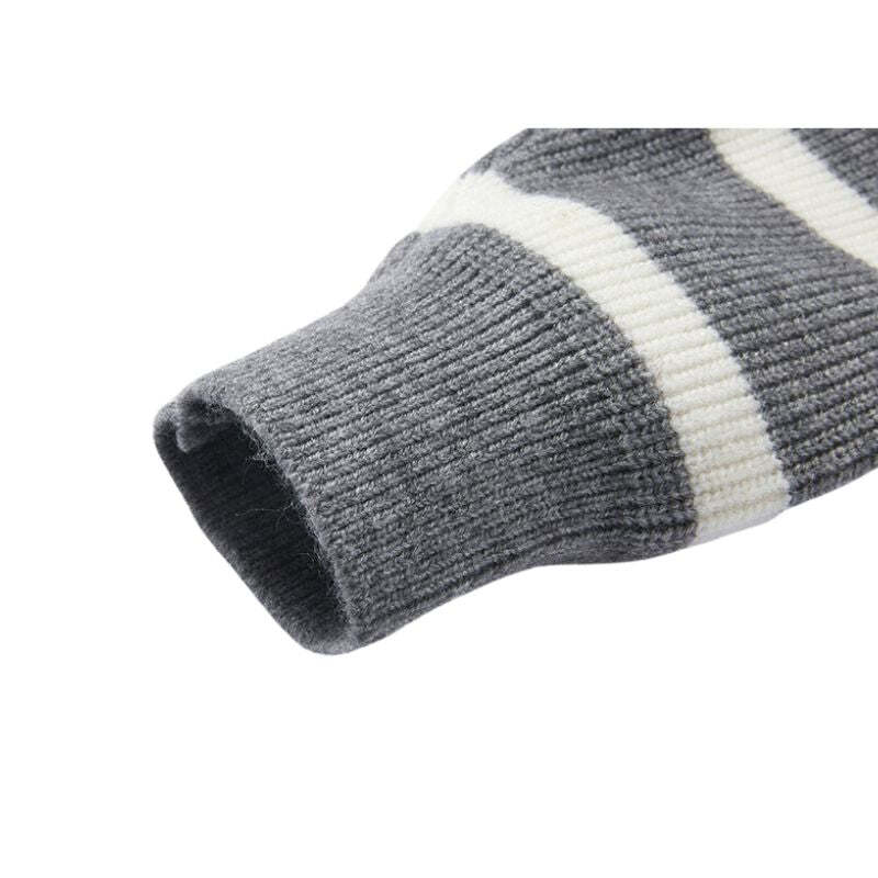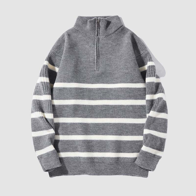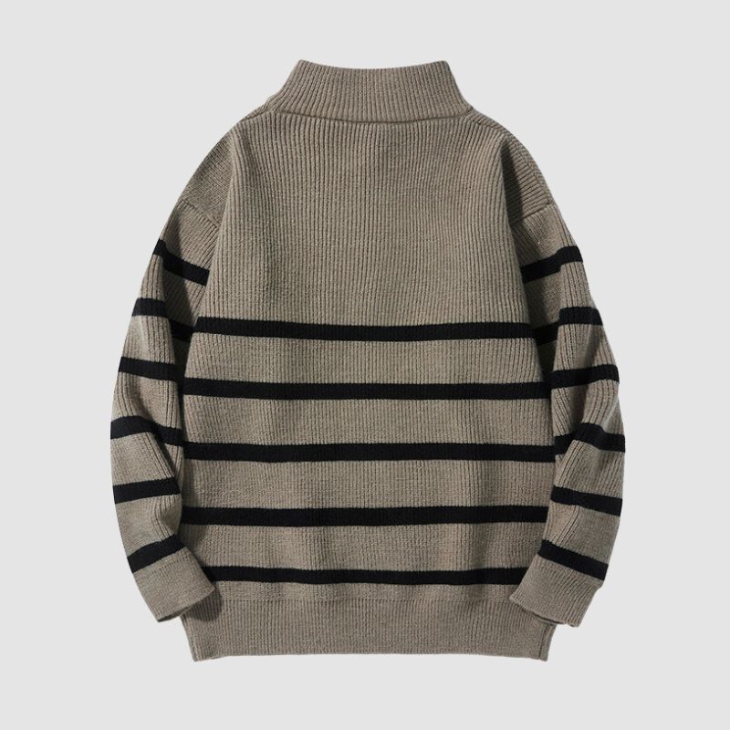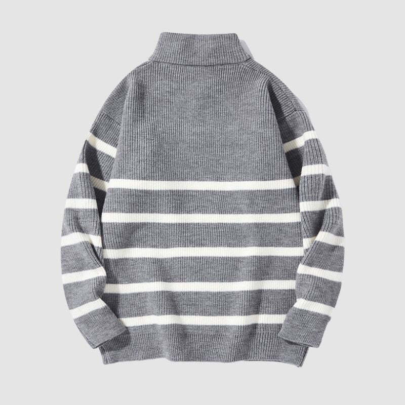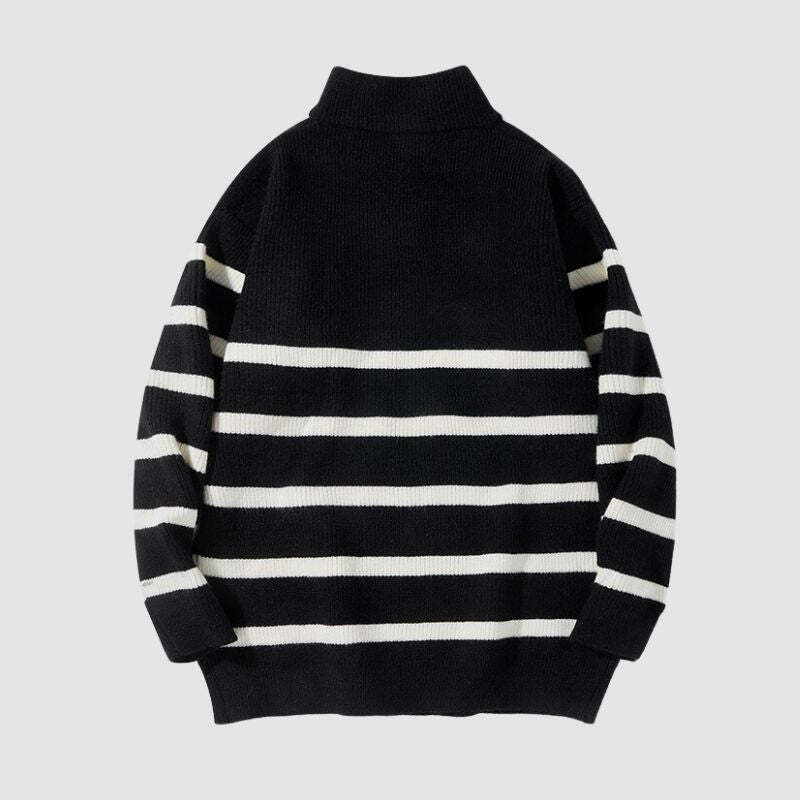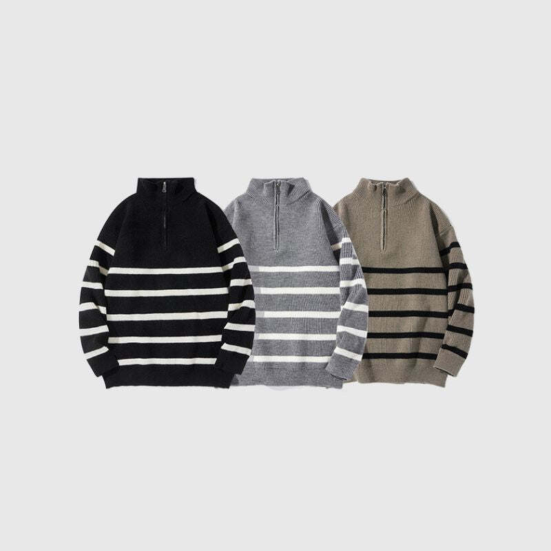 Features: Pullover, mock neck, lapel, long sleeve, stripe design, relaxed fit, jacquard weave, couple outfits.