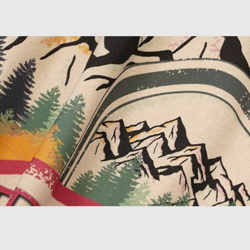Features: Tee, crew neck, short sleeve, mountain print multicolor design, unisex, relaxed fit, oversized, couple outfits.