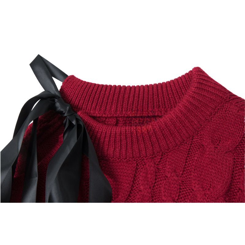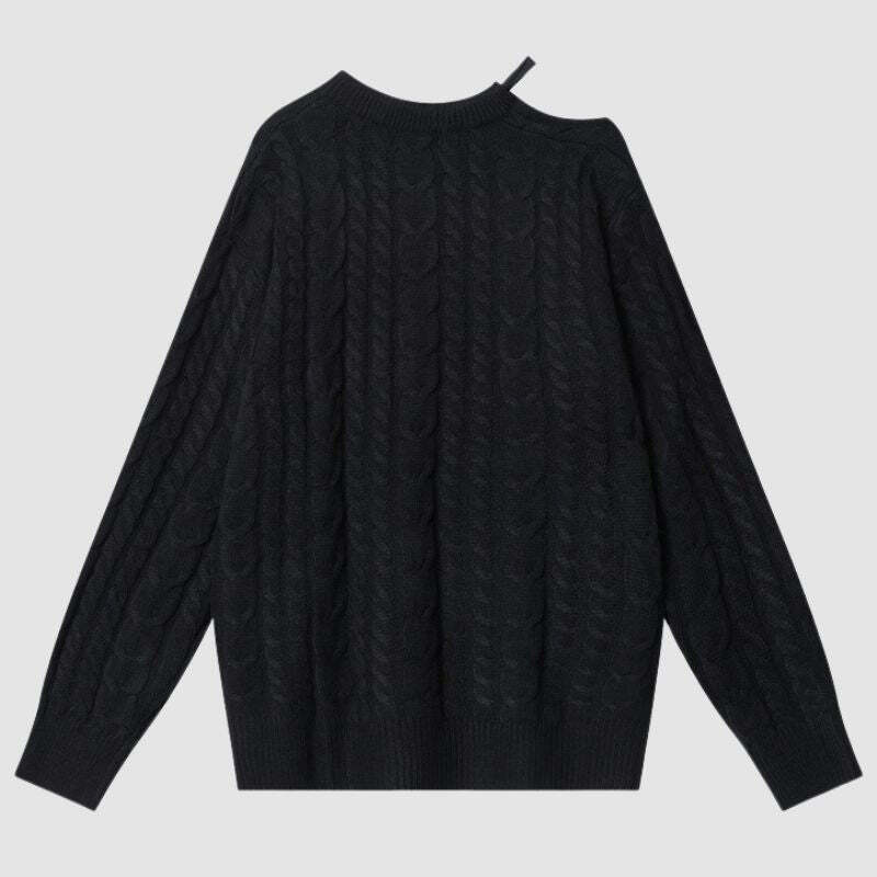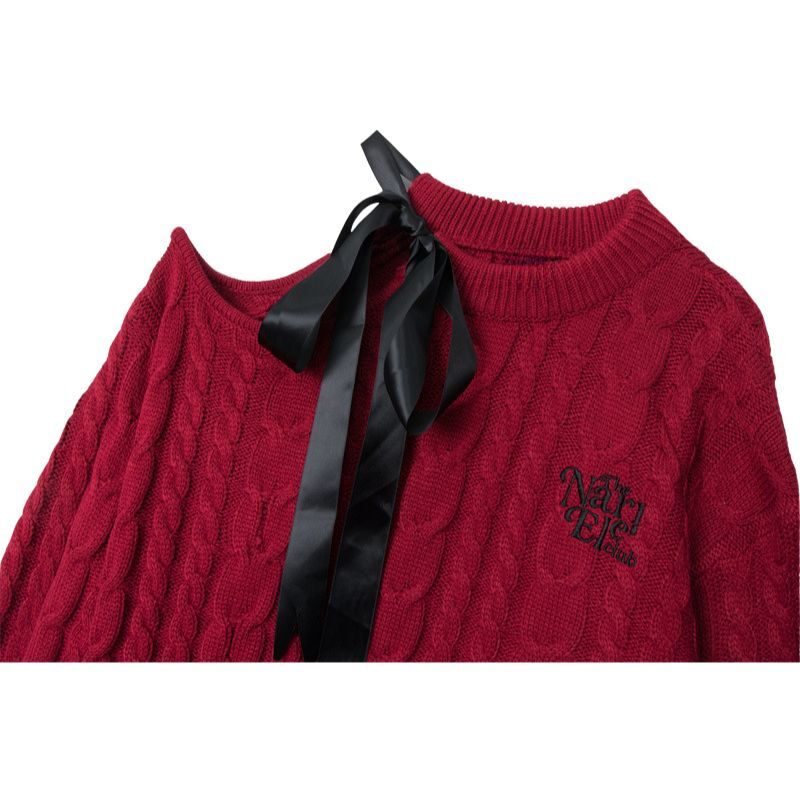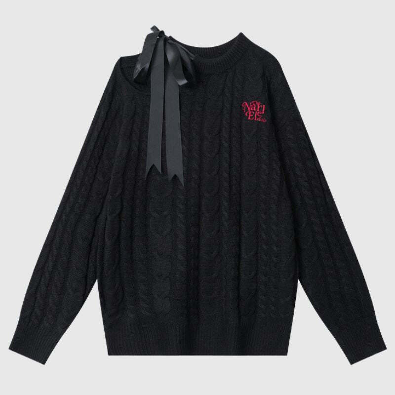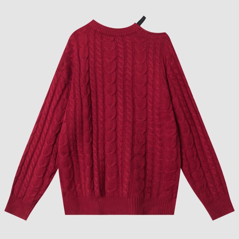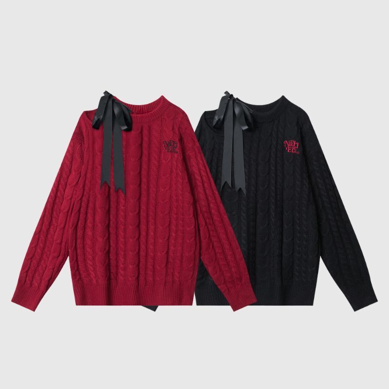 Features: Pullover, sweater, crew neck, long sleeve, off-shoulder, tie-up, twist design, letter embroidered design, solid color, knit, relaxed fit, couple outfits.