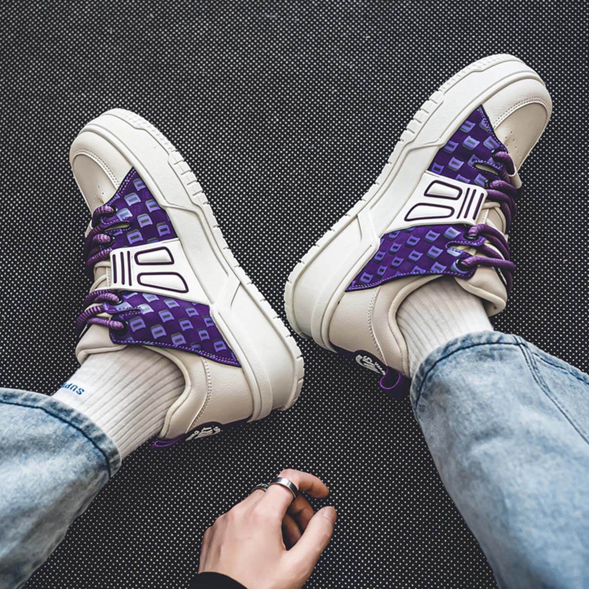 - Retro design with purple accents