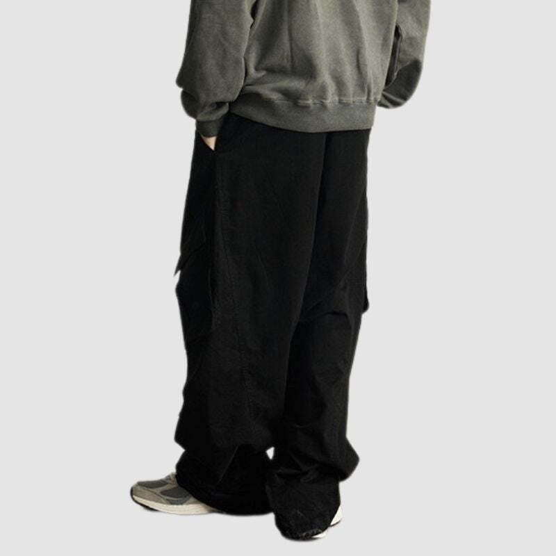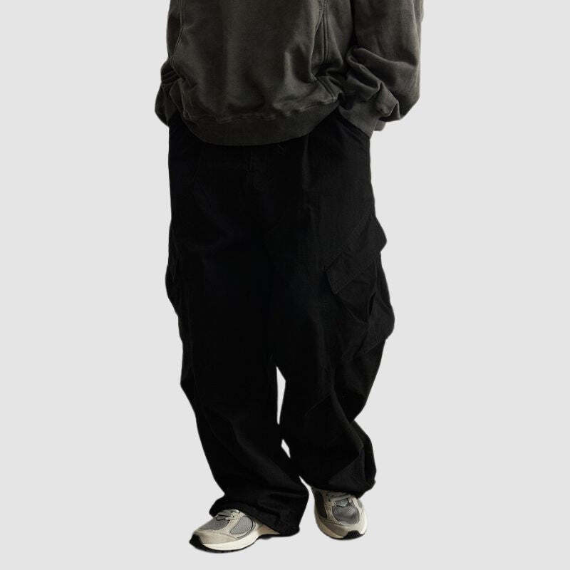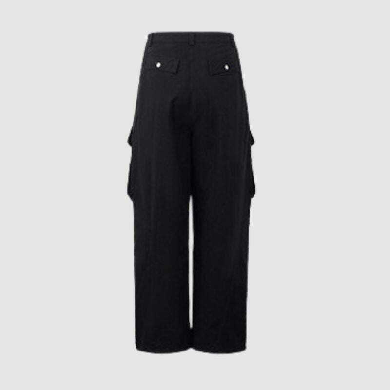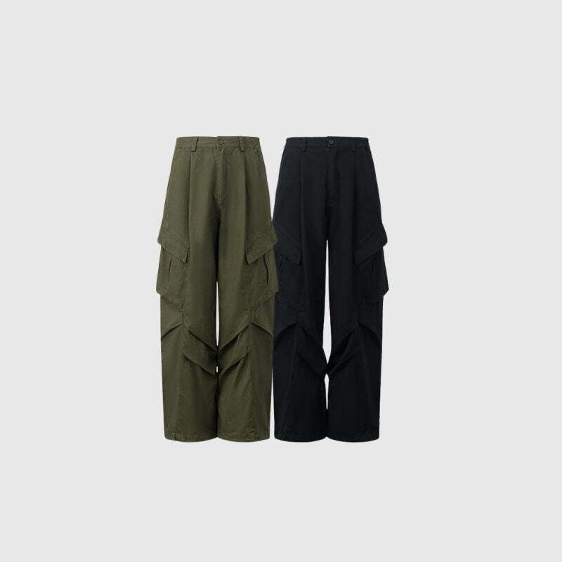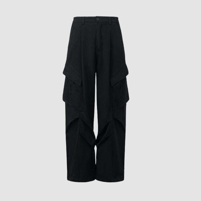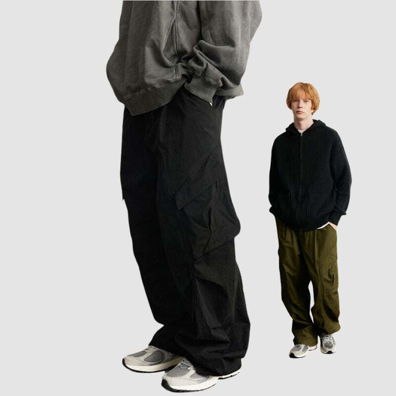 Features: Pants, cargo pants, wide legs, non-elastic, side pocket patch, pleated design, zipper front, solid color, straight-leg, relaxed fit, unisex, couple outfits.