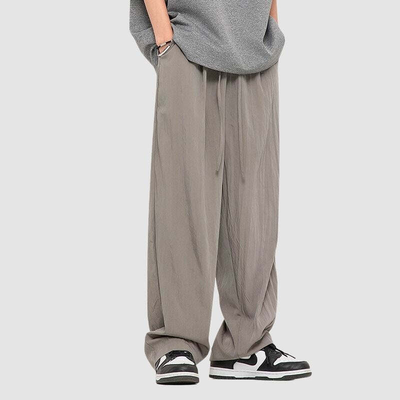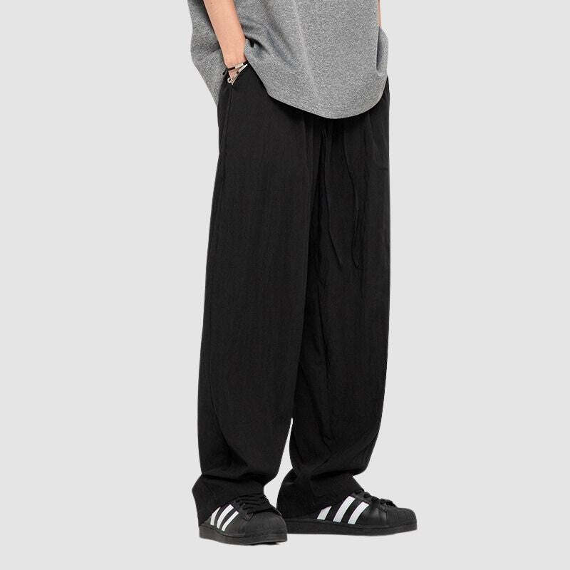 Features: Pants, yamamoto pants, wide legs, textured fabric, pleated, drawstring waist, solid color, straight-leg, relaxed fit, unisex, couple outfits.