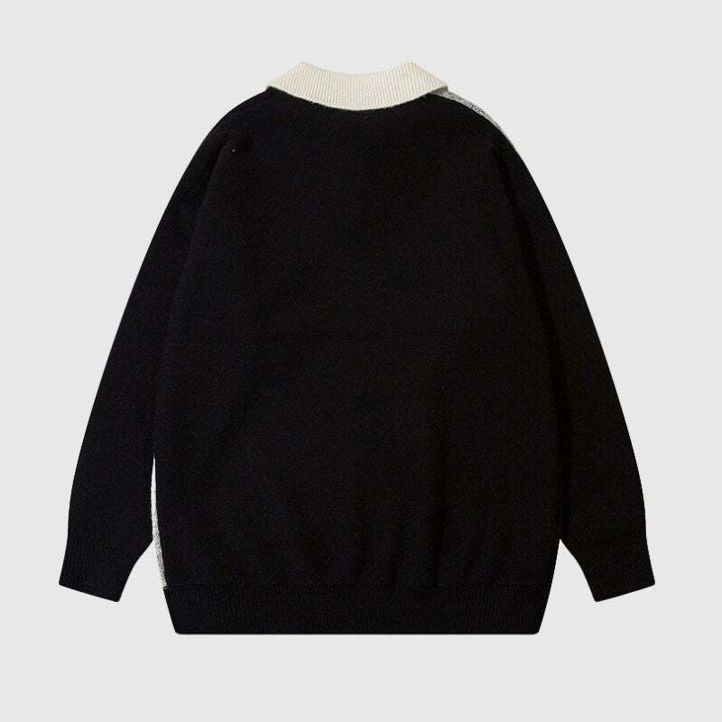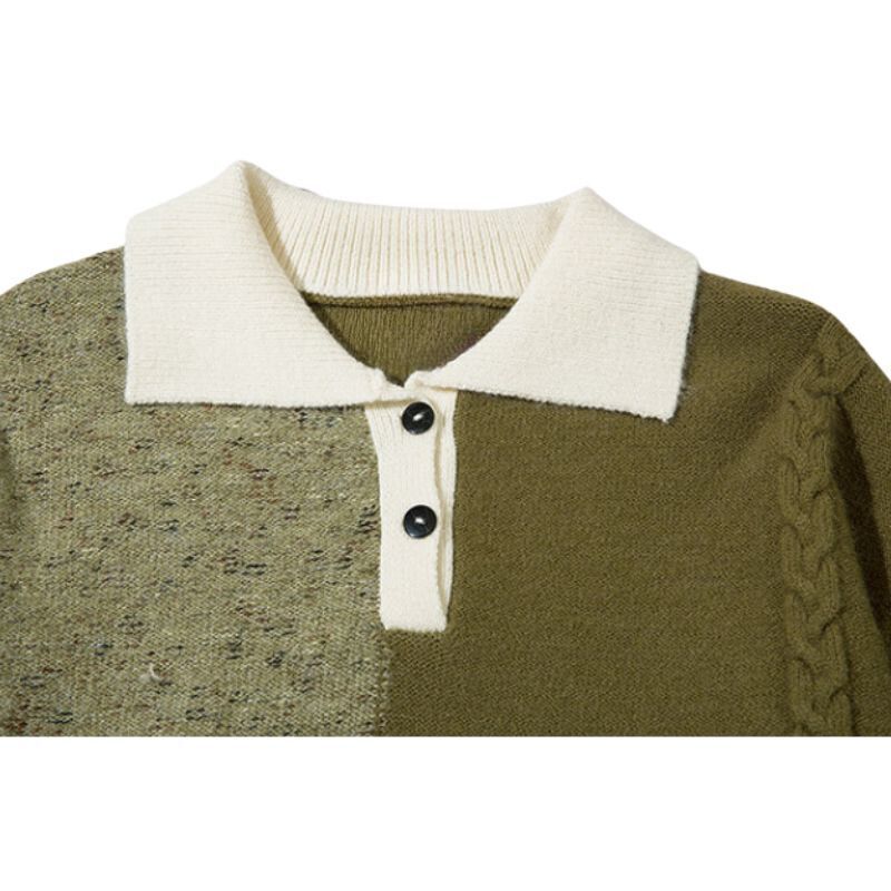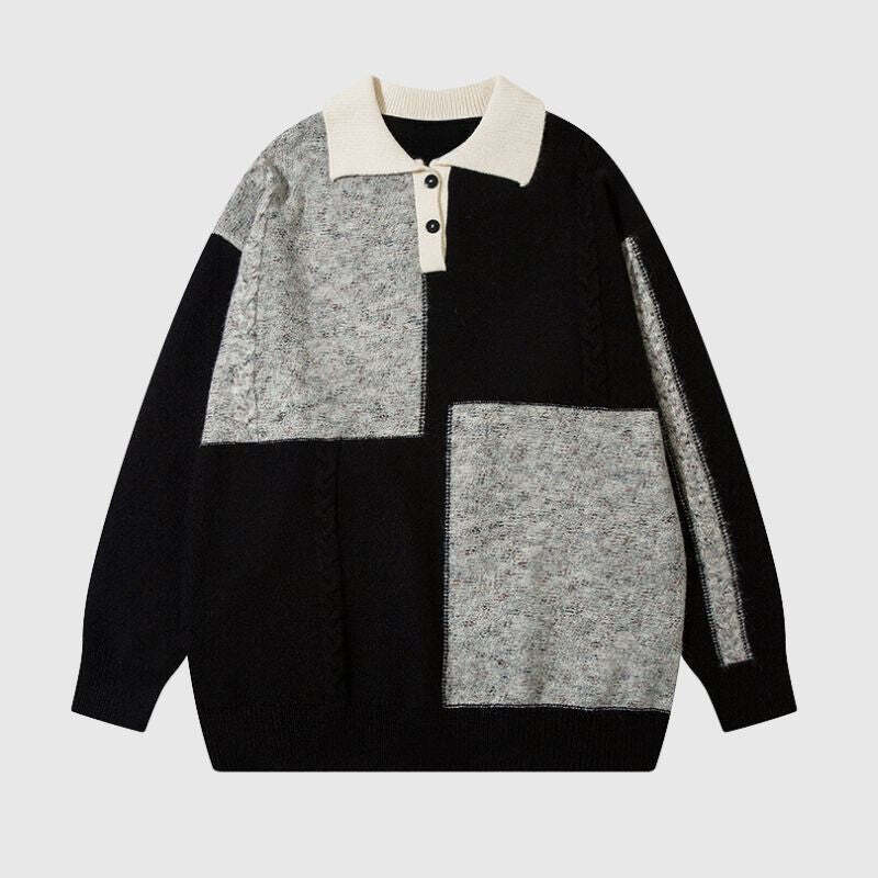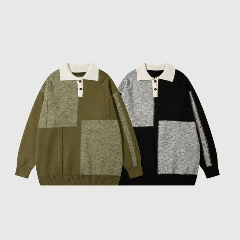 Features: Pullover, lapel, long sleeve, checkered patchwork design, relaxed fit, jacquard weave, couple outfits.