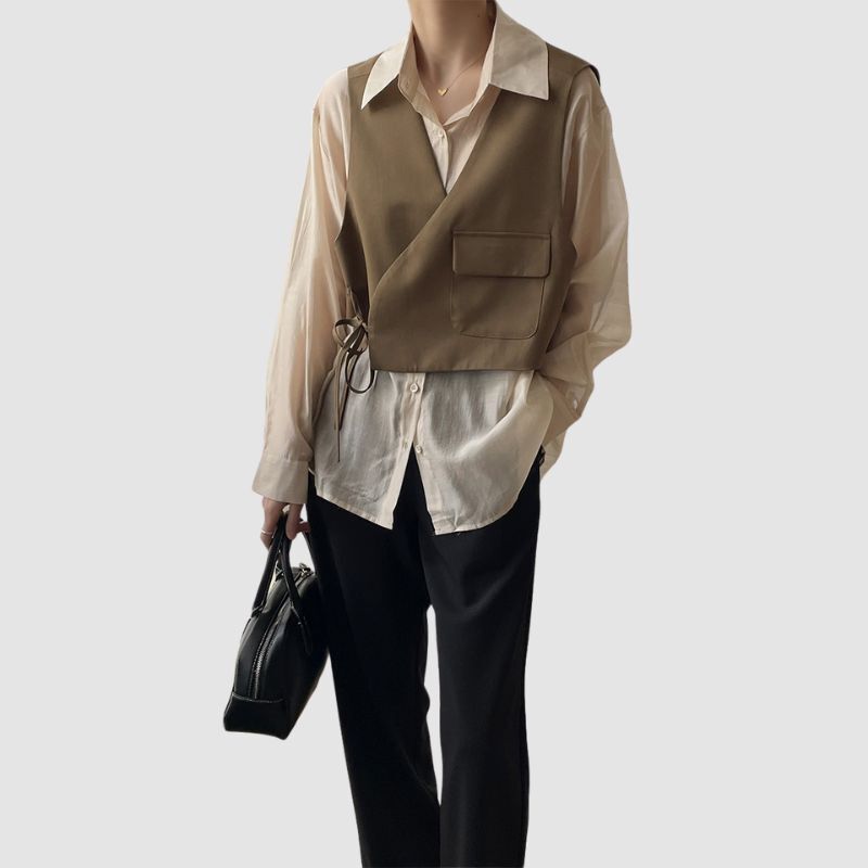 Features: Shirts, vest, two-piece set, lapel, long sleeve, color contrast, strap vest, pocket patchwork, relaxed fit, soft and breathable, unisex, couple outfits.