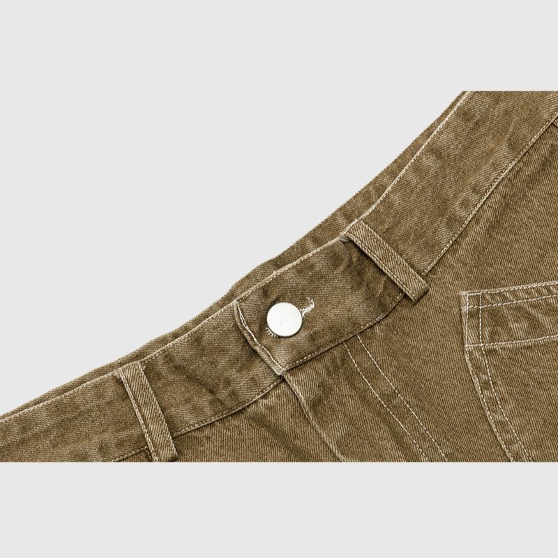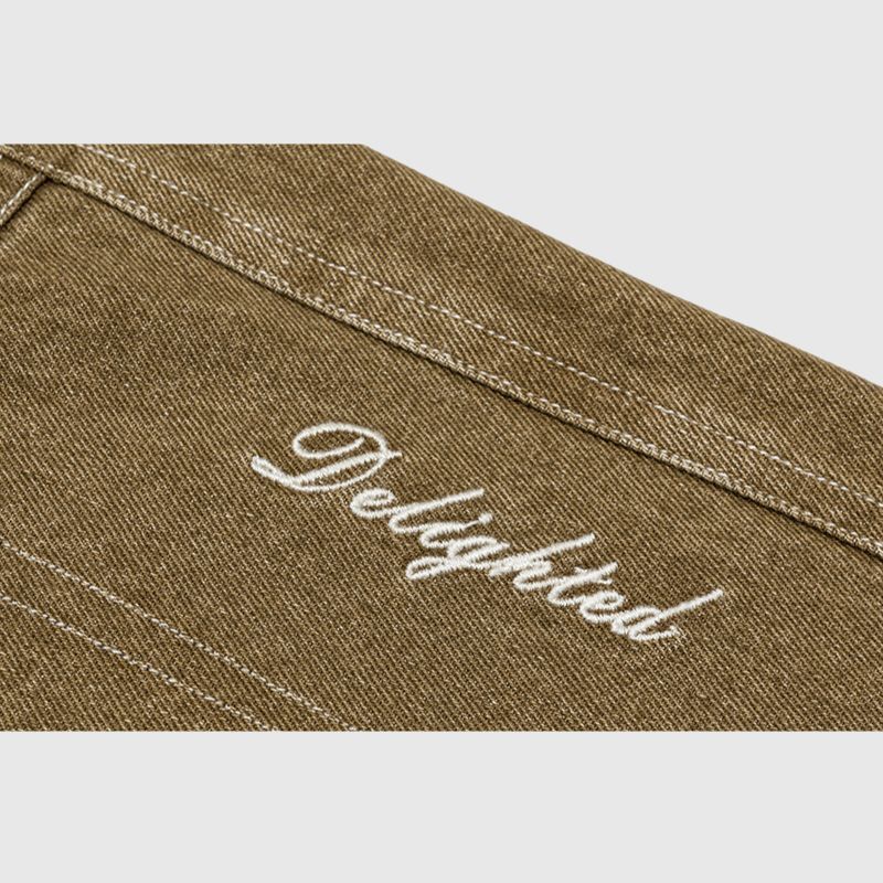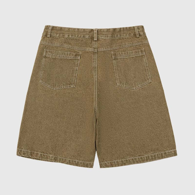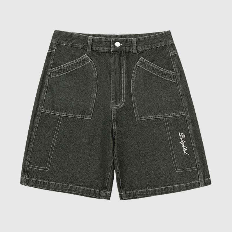 Features: Jorts, side embroidered design, washed, distressed, zipper front, solid color, vintage, side pocket, straight-leg, relaxed fit, unisex, couple outfits.