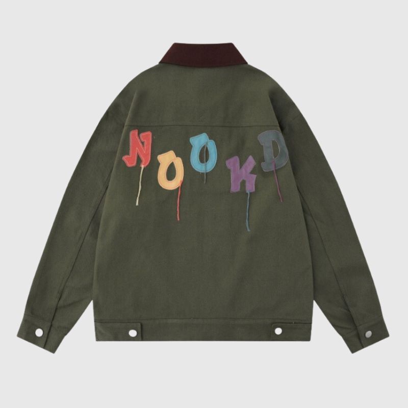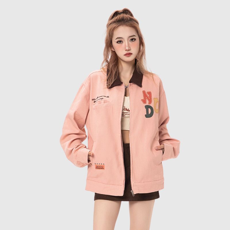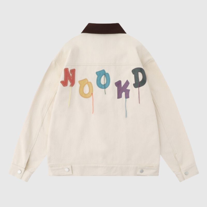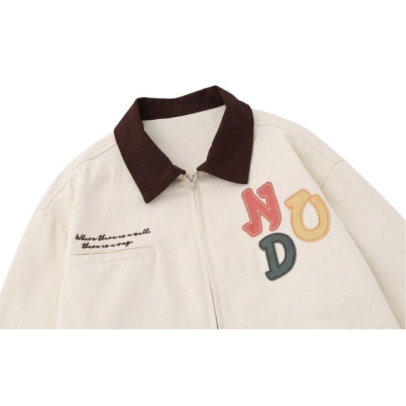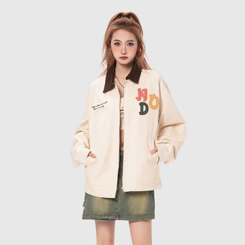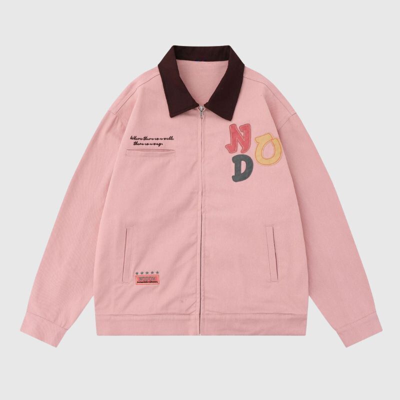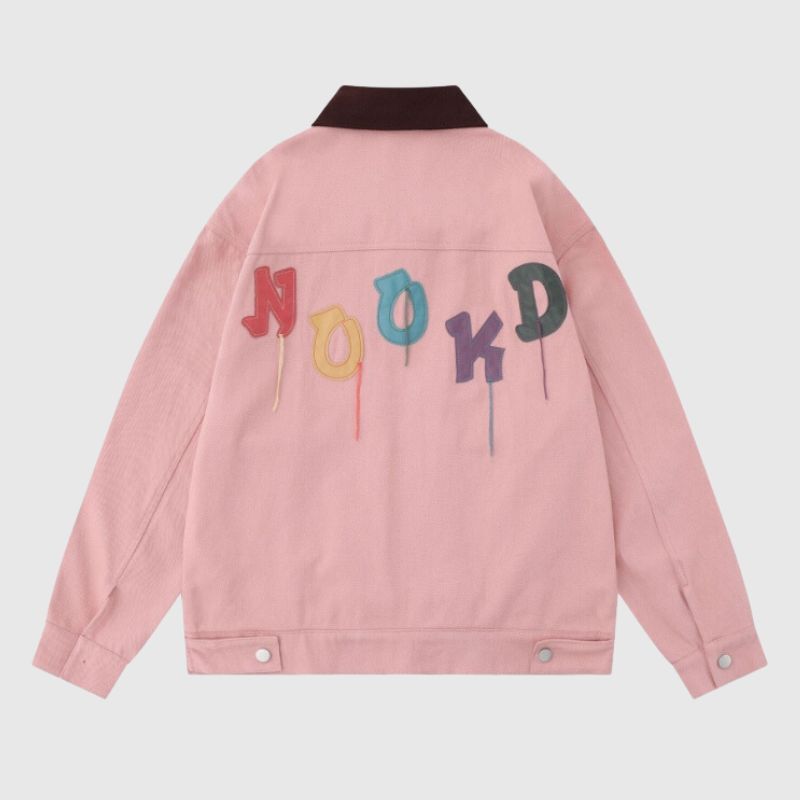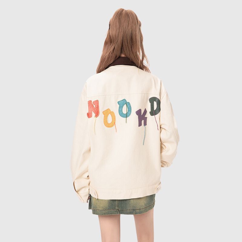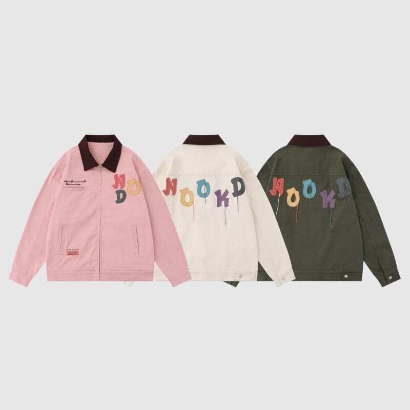 Features:Jacket, lapel, long sleeves, embroidered dopamine design, loose fit, soft and breathable, unisex, couple wear.