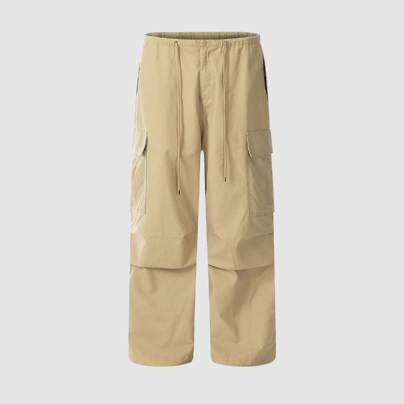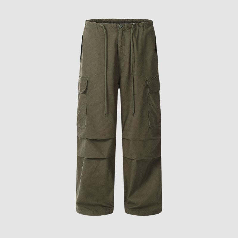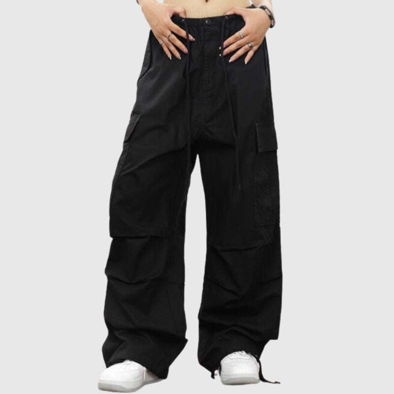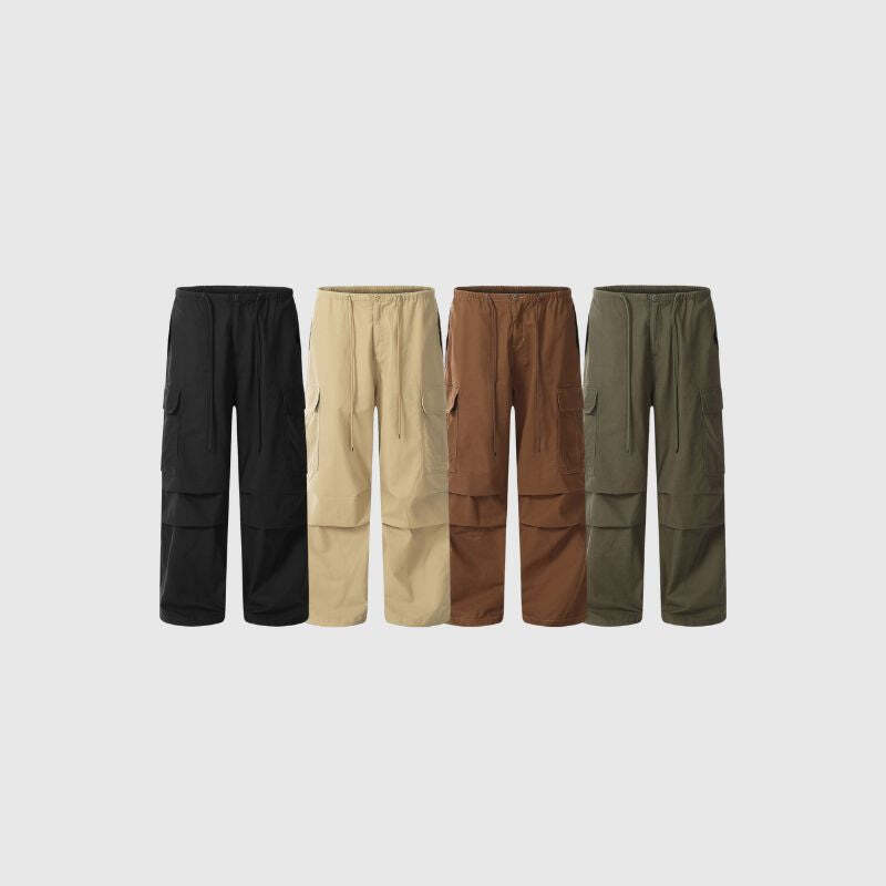 Features: Pants, cargo pants, parachute pants, wide legs, pleated, non-elastic, drawstring waist, solid color, straight-leg, relaxed fit, unisex, couple outfits.