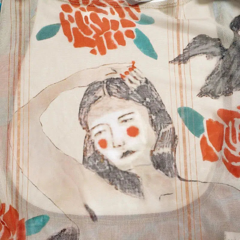 - Print detail: woman, flowers, bird, leaf