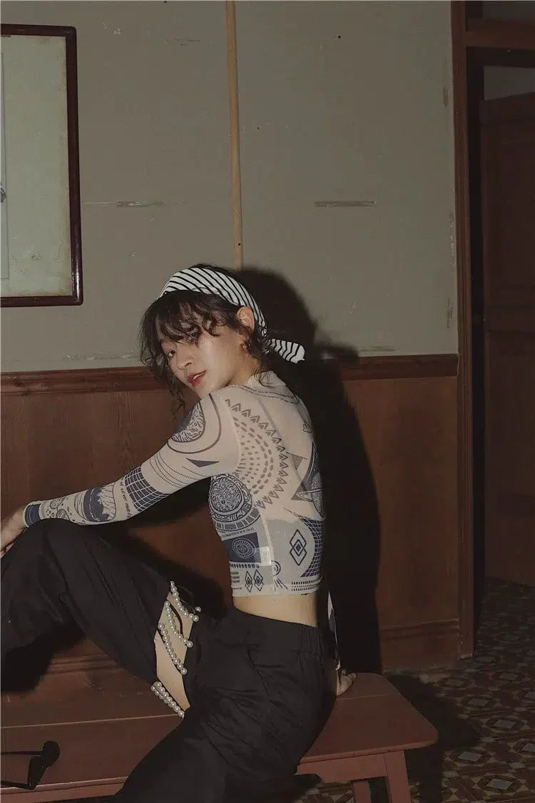 This unique mystique mesh crop top, with its transparent design and eclectic tattoo-inspired prints, is a showstopper. The cropped cut and long sleeves make it an ideal choice for parties, festivals, or a cool streetwear look.