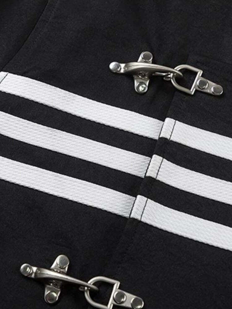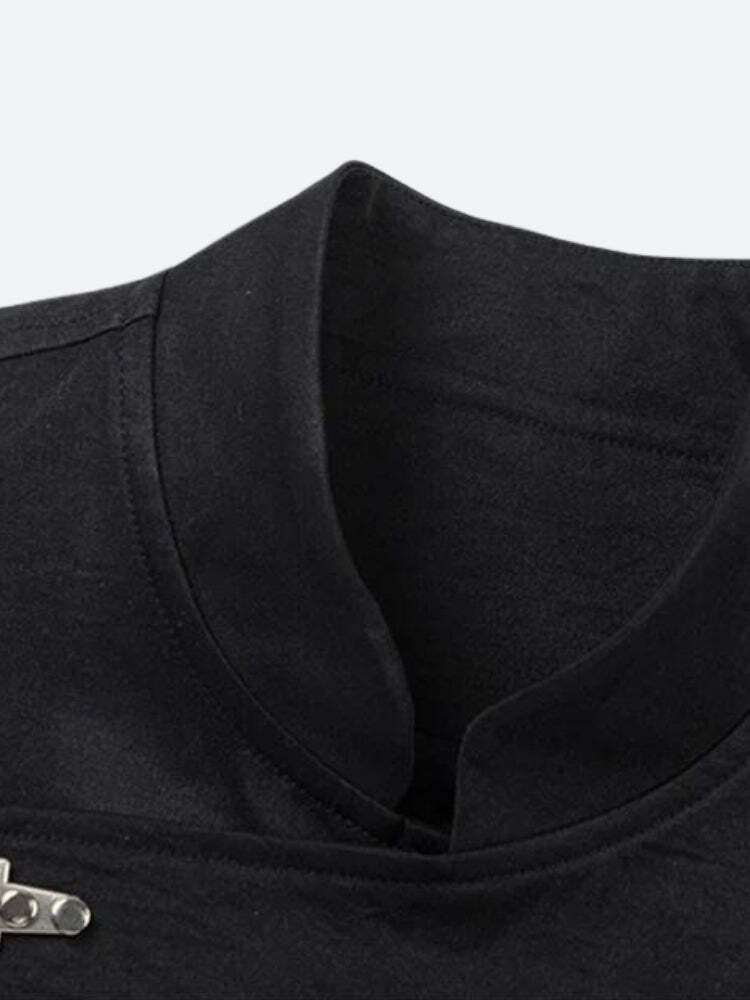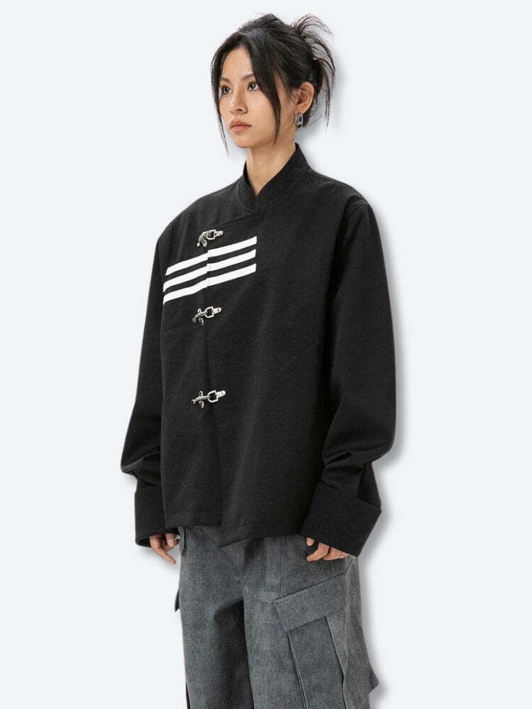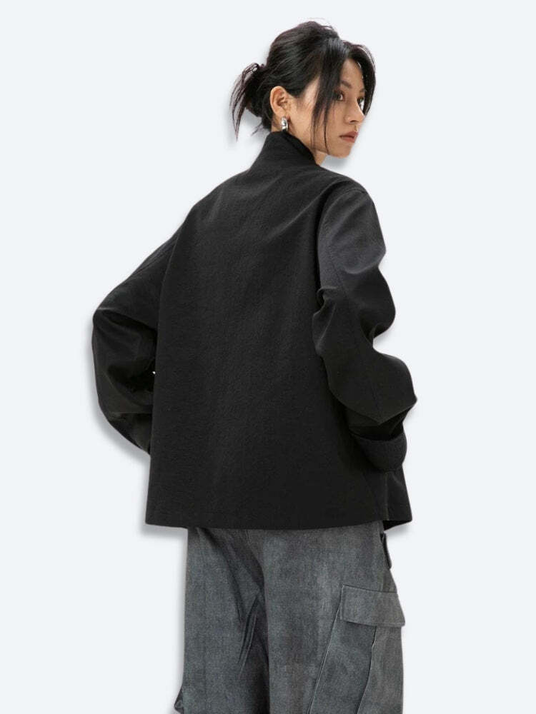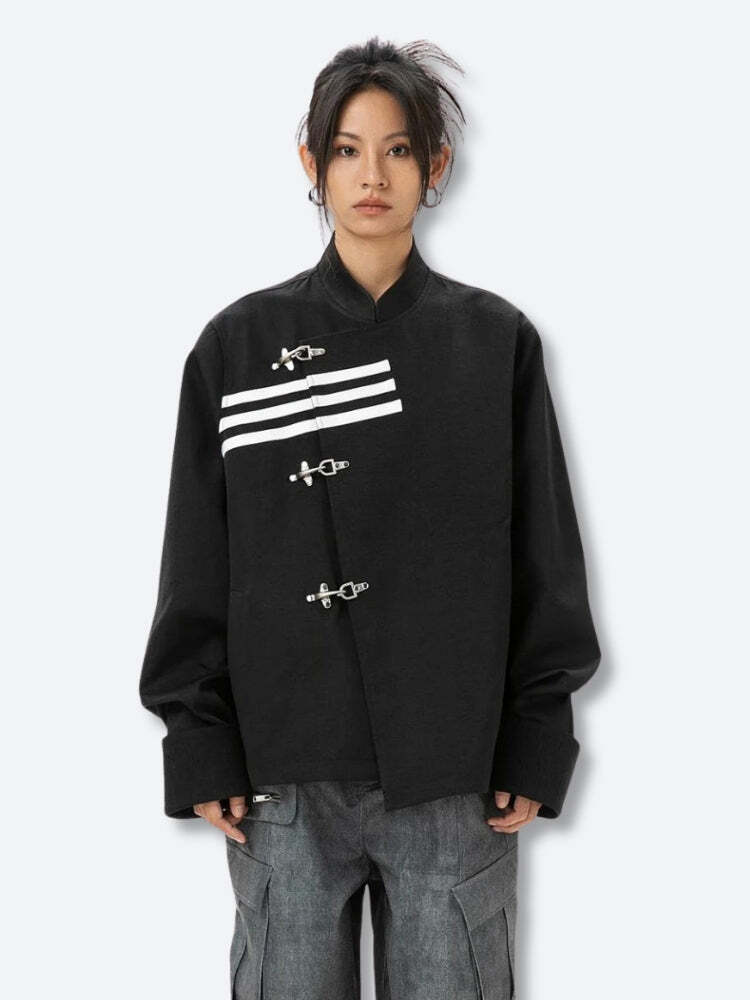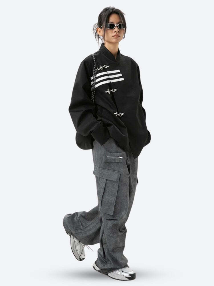 This Asymmetric Frog Button Jacket is a bold fusion of traditional and contemporary design elements. The jacket features a distinctive asymmetrical closure with traditional Chinese-inspired frog buttons, adding a cultural twist to modern streetwear. The stand-up collar and oversized cuffs enhance its modern silhouette, while the roomy fit provides comfort and a stylish, relaxed vibe.