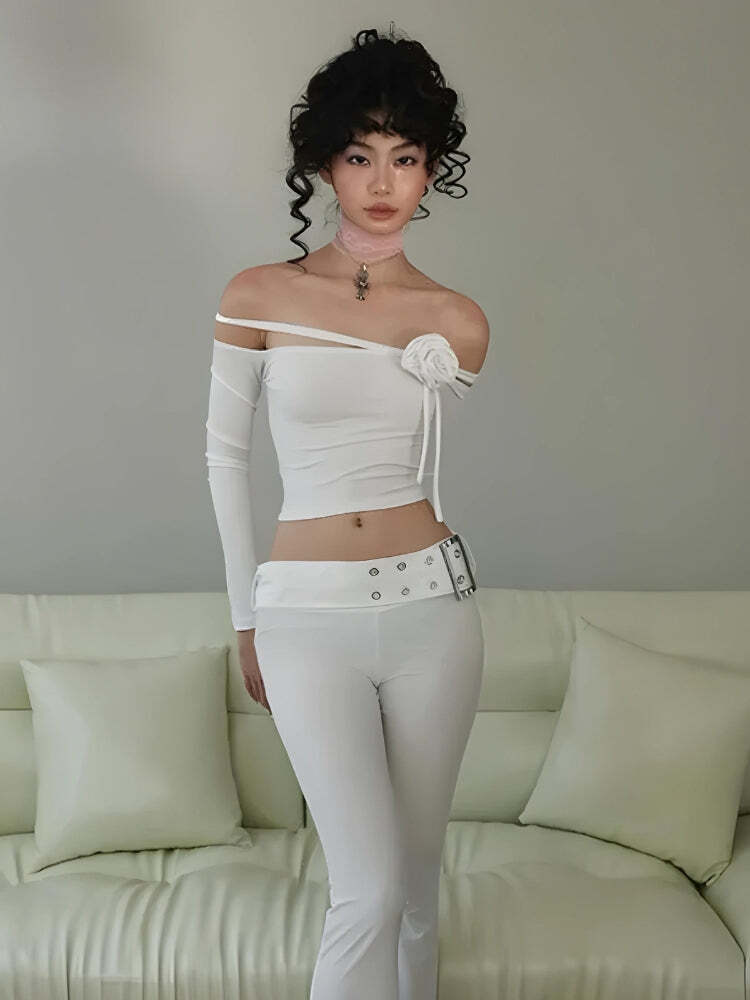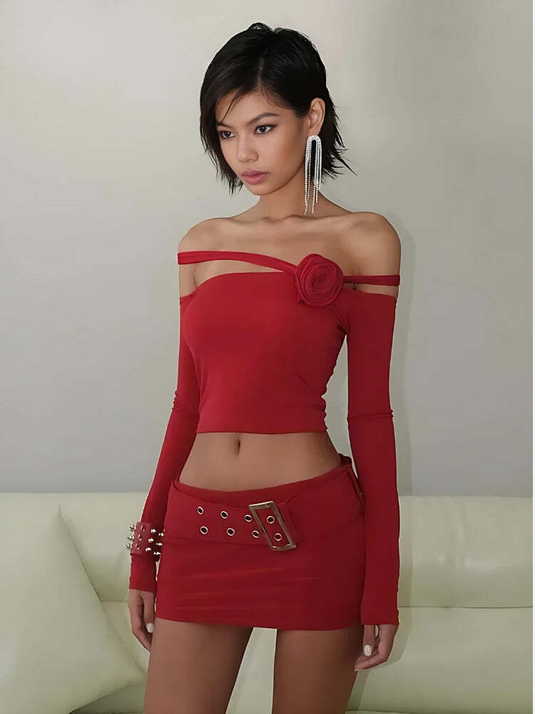 The vibrant red hue catches the eye, while the unique off-shoulder cut and rose detail add a touch of romantic flair. The top’s sleek, body-hugging fit accentuates your silhouette, making it a perfect choice for evenings out or special events. Pair it with a high-waisted skirt or slim trousers to create a stunning, fashion-forward ensemble that’s sure to turn heads.