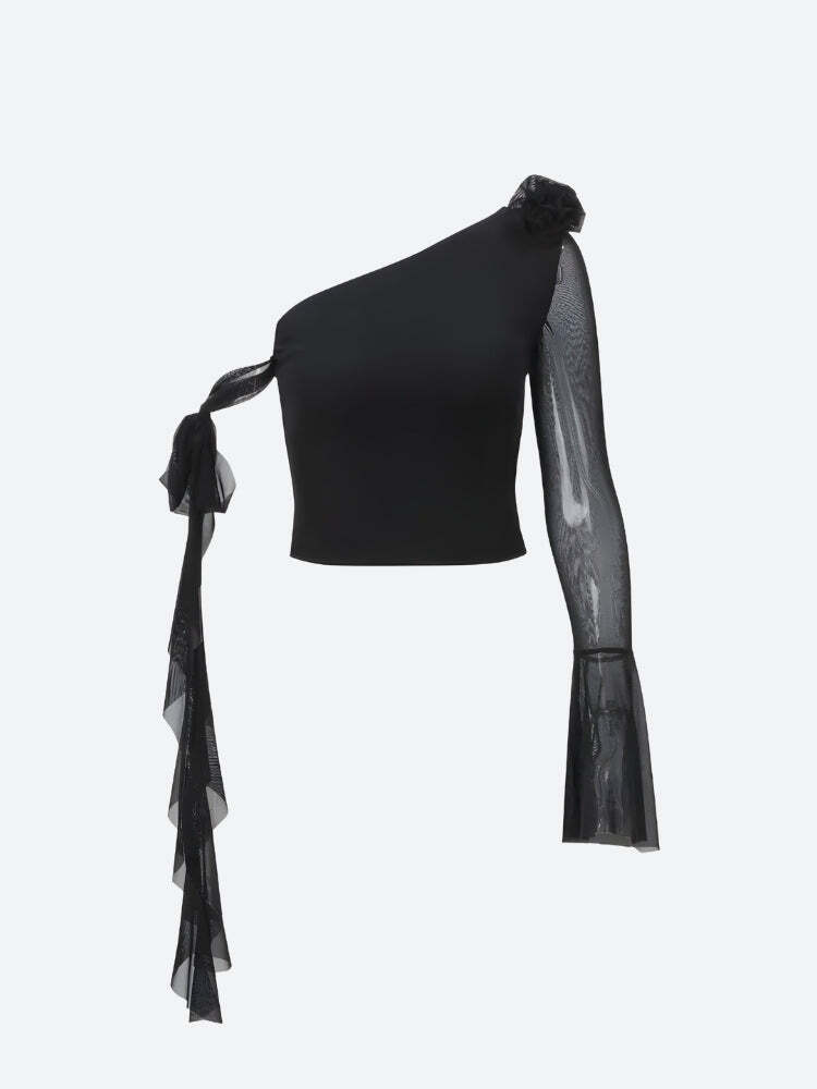 Vibrant and bold, this one-shoulder top in a striking red hue makes a statement with its asymmetric design and delicate mesh detailing. Enhanced by a floral embellishment on the shoulder, it sets a dramatic tone for any evening look. Perfect for pairing with sleek trousers or skirts, this piece is a standout for those who love to command attention in their fashion choices.