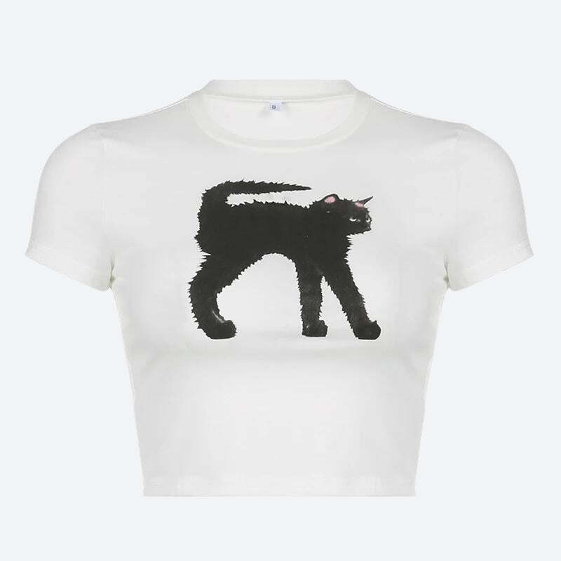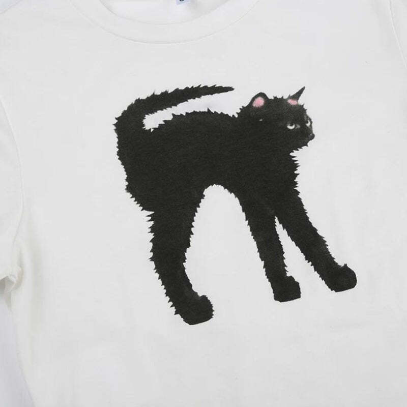 Step out in feline finesse with this striking black cat crop top. The bold graphic adds an element of mystique to a classic white tee, making it a purr-fect choice for cat enthusiasts looking to showcase their love for their furry friends in style.